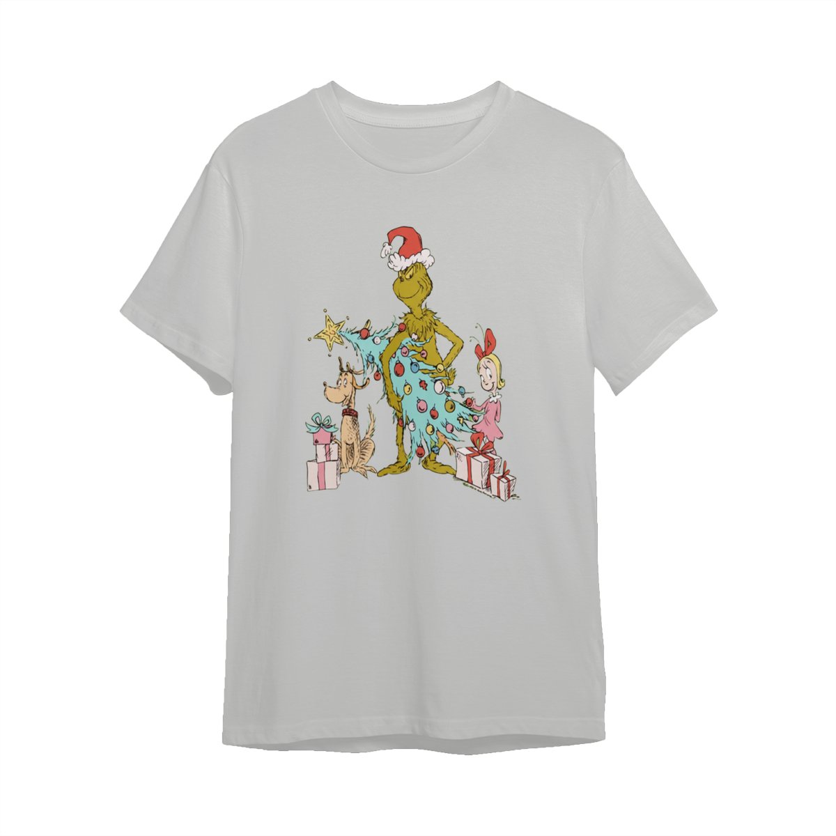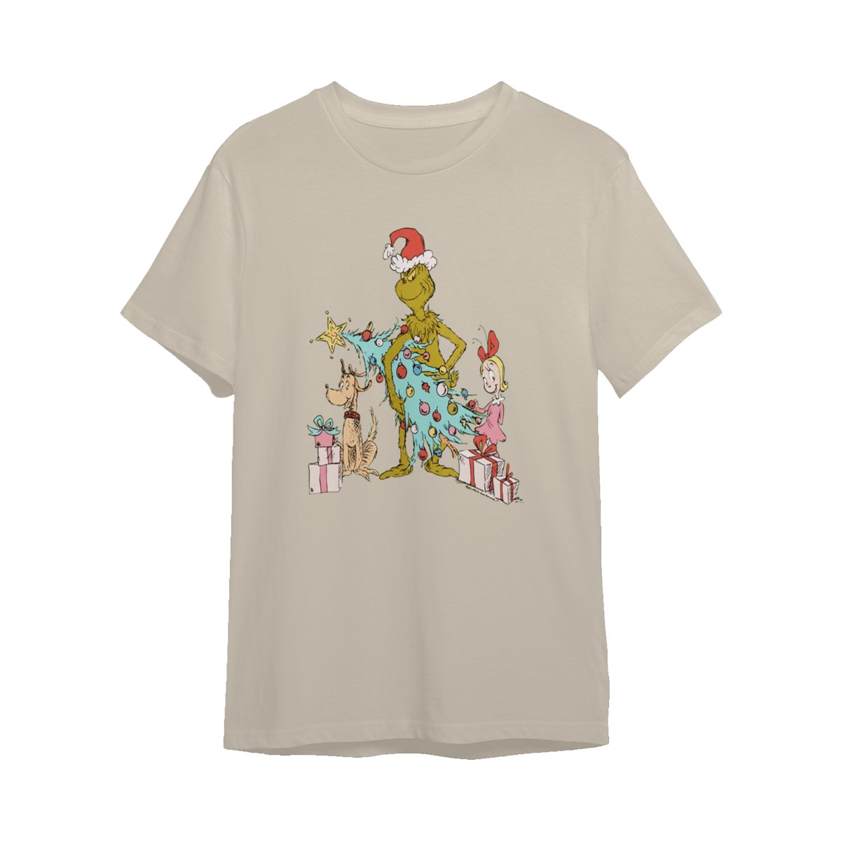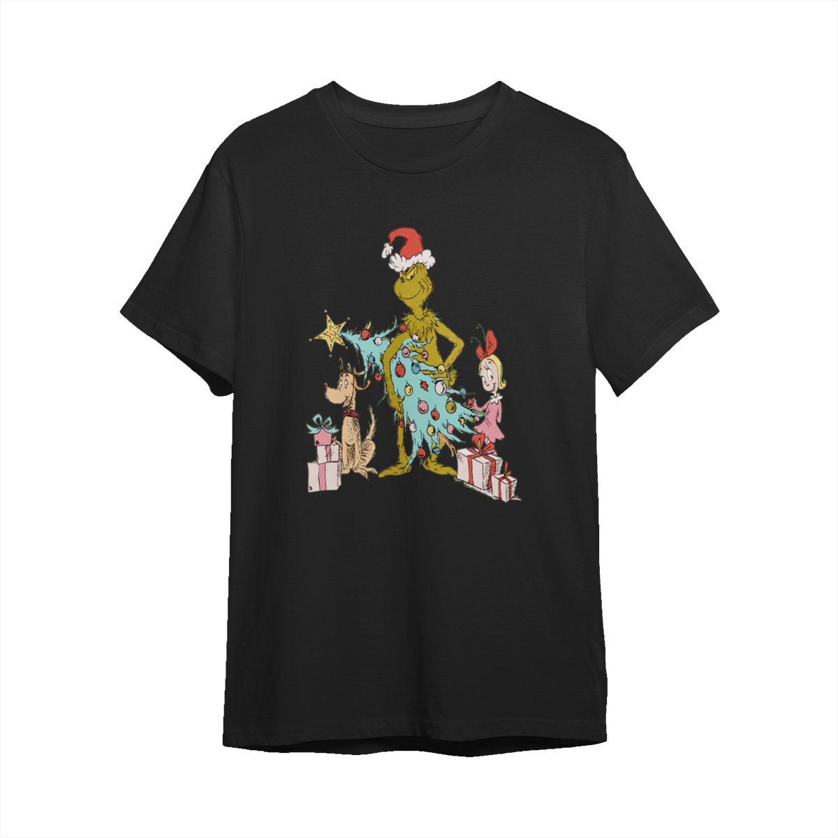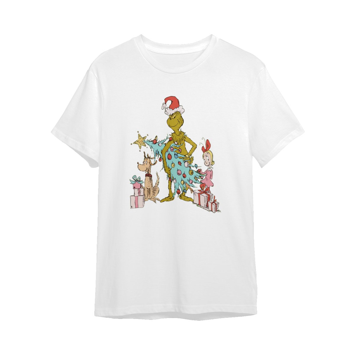 Dr. Seuss’ The Grinch Whoville Style Christmas Cartoon Tee – Funny Green Holiday Mischief Character with Girl and Dog, Decorated Tree & Gifts – Cute Retro Xmas Illustration Shirt for Winter Season, Festive Outfits, Holiday Parties & Christmas Gift Ideas