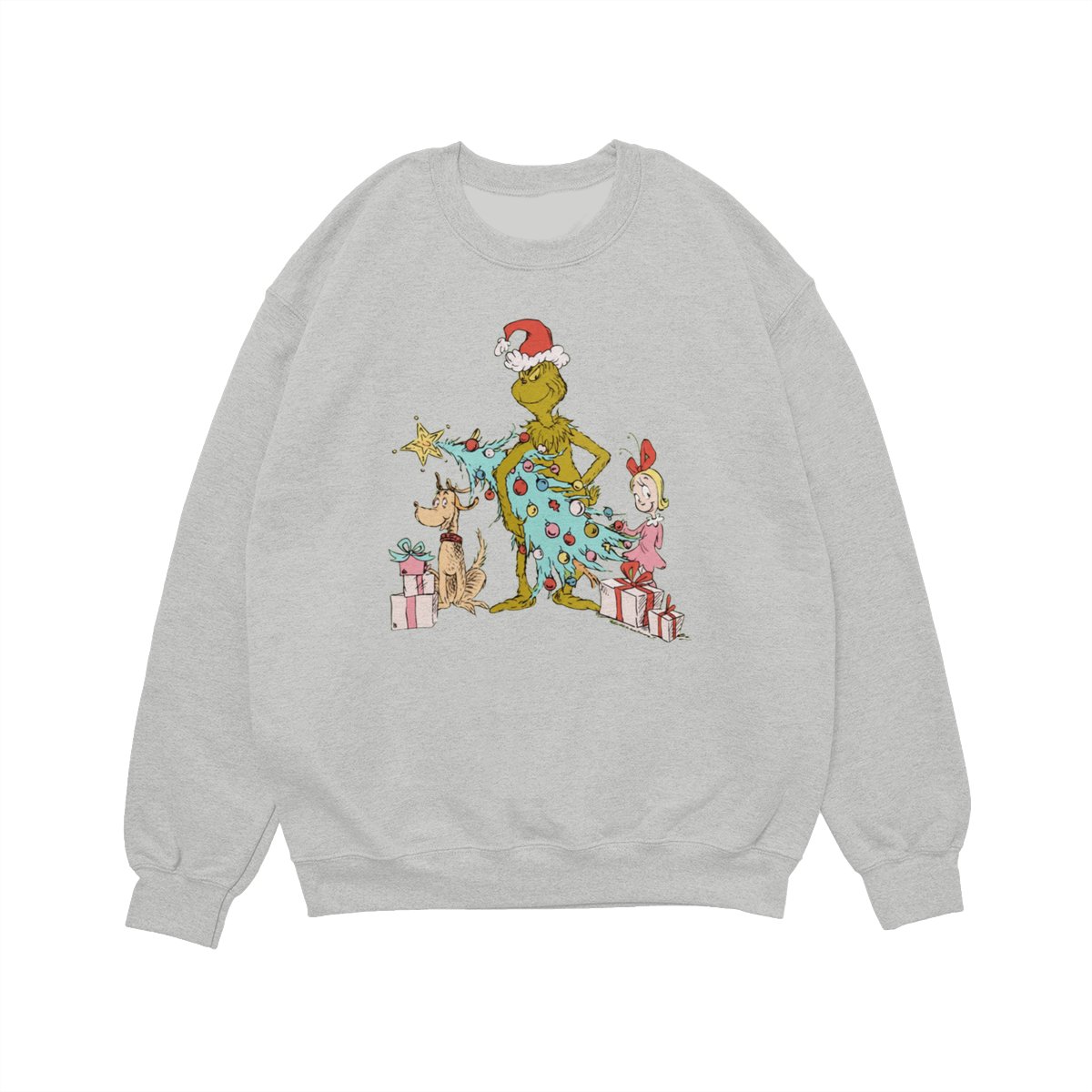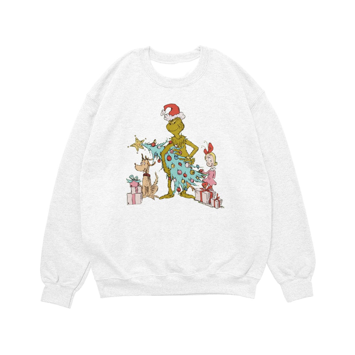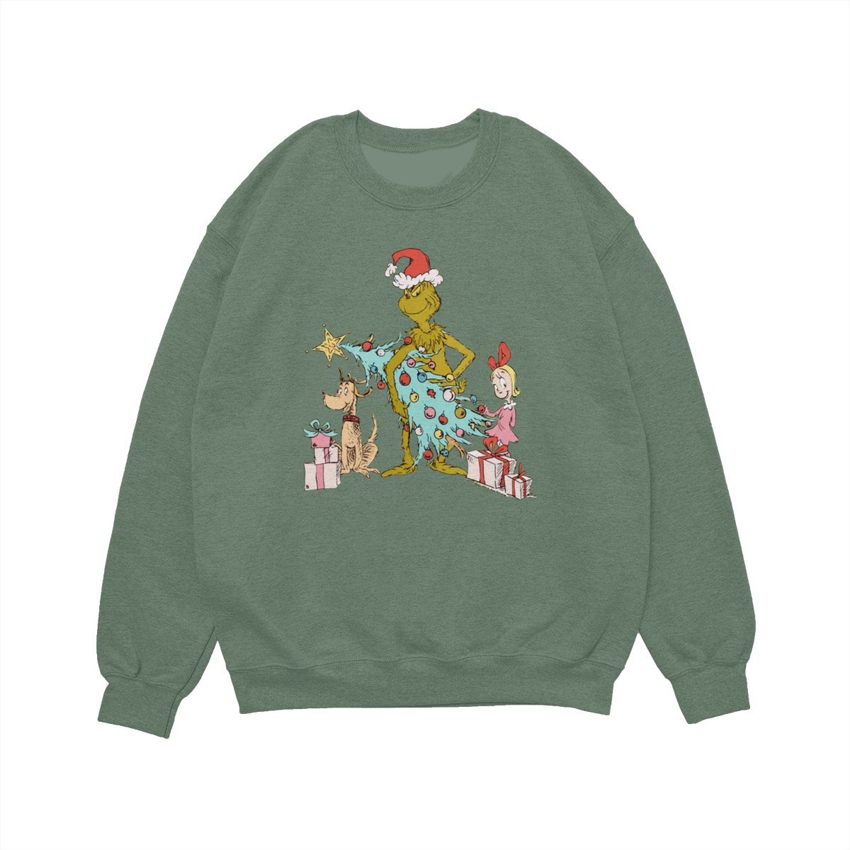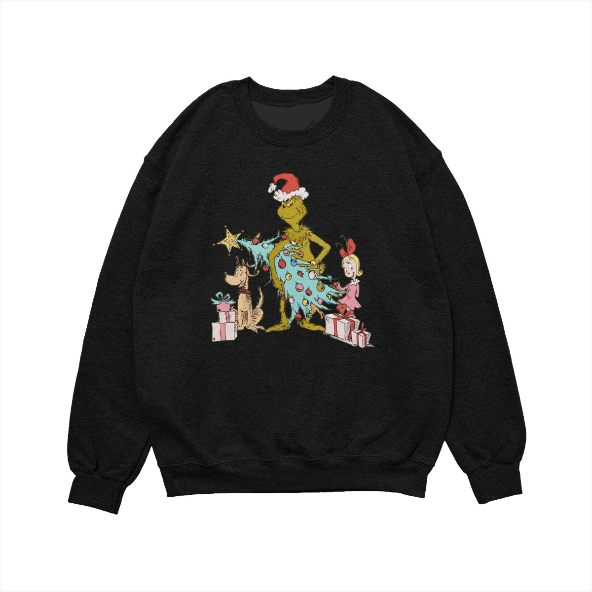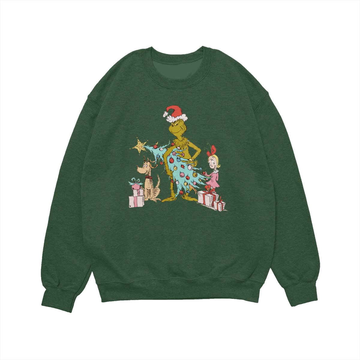 Dr. Seuss’ The Grinch Whoville Style Christmas Cartoon Tee – Funny Green Holiday Mischief Character with Girl and Dog, Decorated Tree & Gifts – Cute Retro Xmas Illustration Shirt for Winter Season, Festive Outfits, Holiday Parties & Christmas Gift Ideas