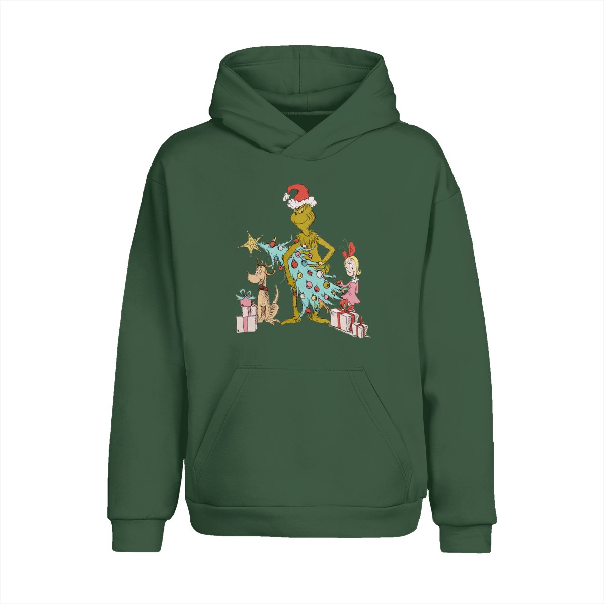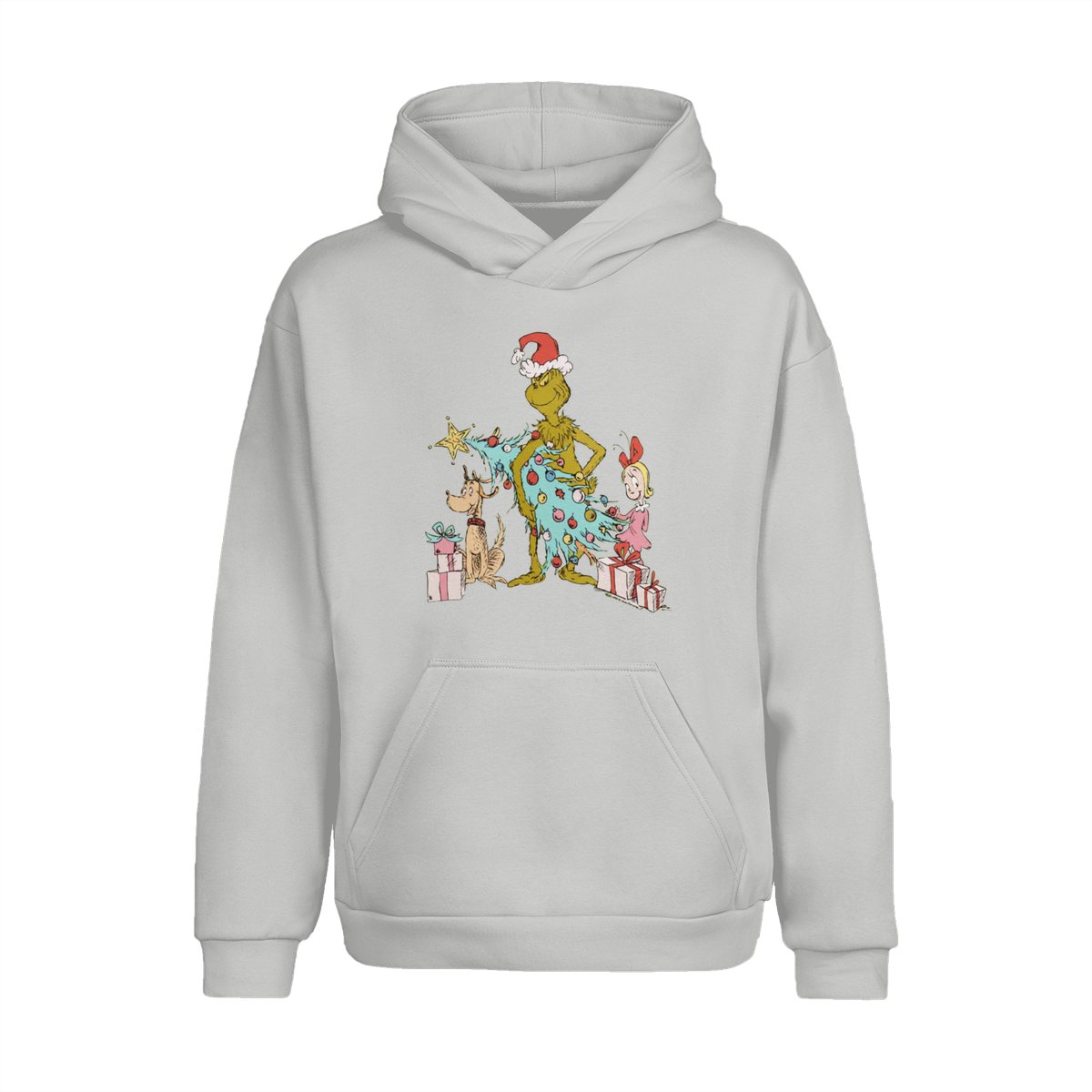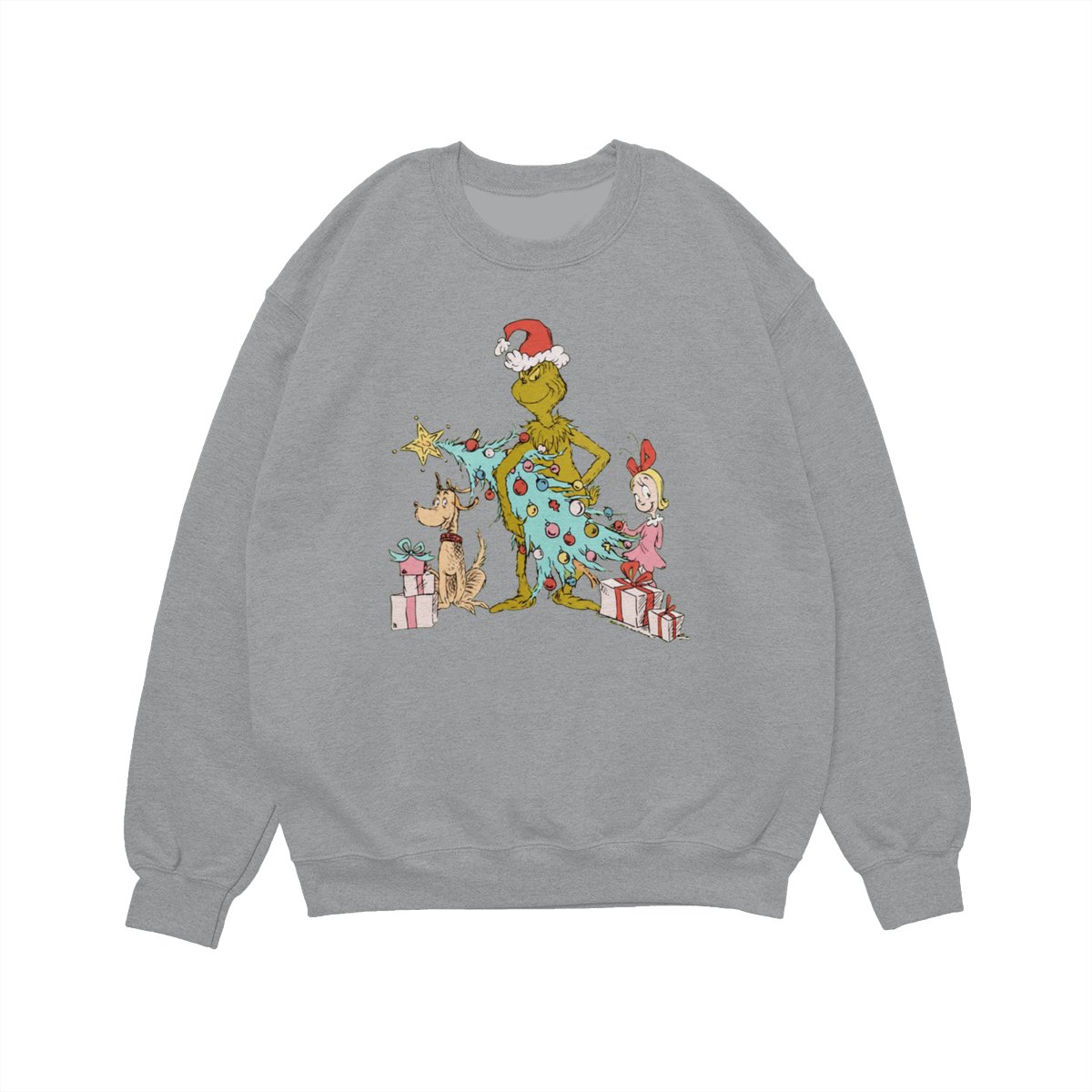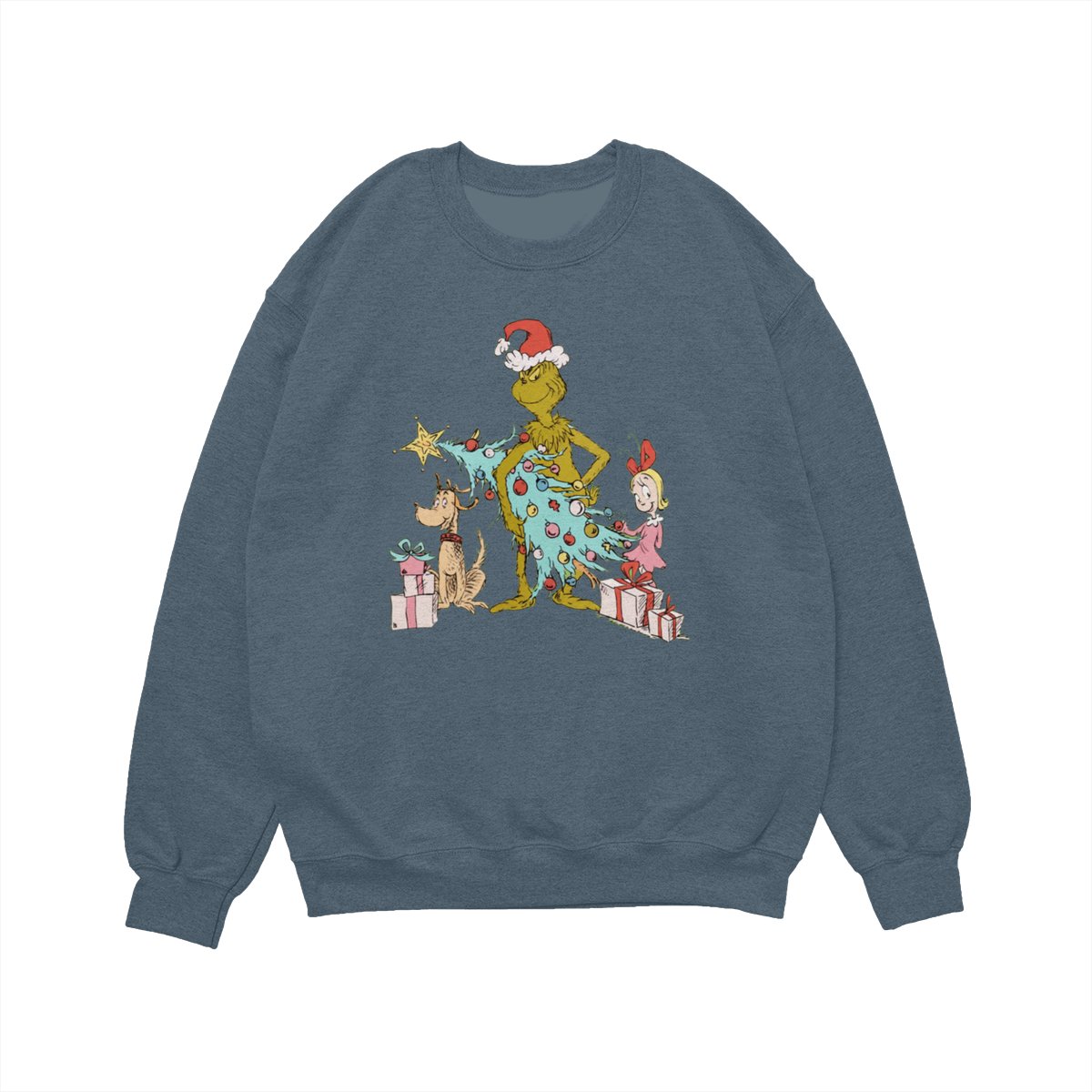Dr. Seuss’ The Grinch Whoville Style Christmas Cartoon Tee – Funny Green Holiday Mischief Character with Girl and Dog, Decorated Tree & Gifts – Cute Retro Xmas Illustration Shirt for Winter Season, Festive Outfits, Holiday Parties & Christmas Gift Ideas