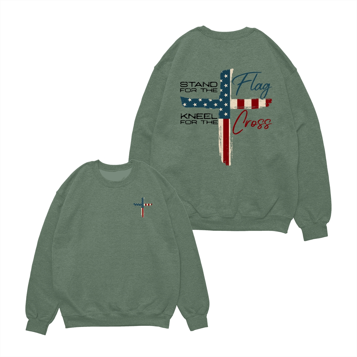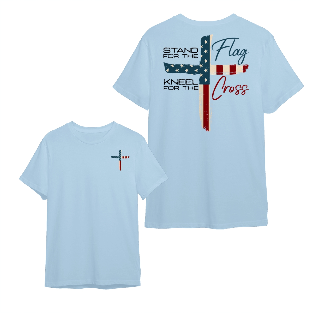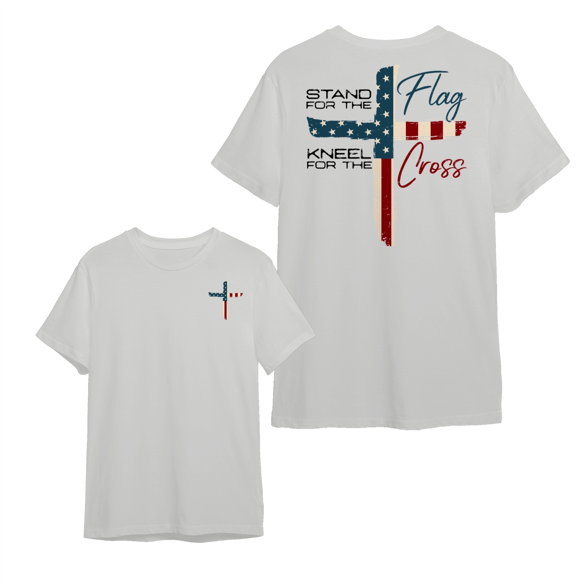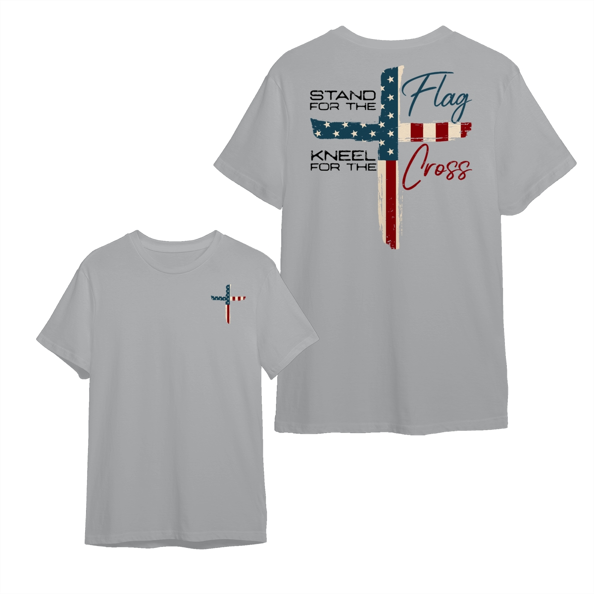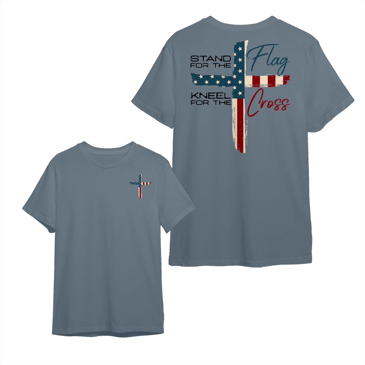 Faith & Freedom T-Shirt – Stand for the Flag, Kneel for the Cross Graphic Tee with USA Flag & Rustic Cross, Trending Patriotic Shirt 2025