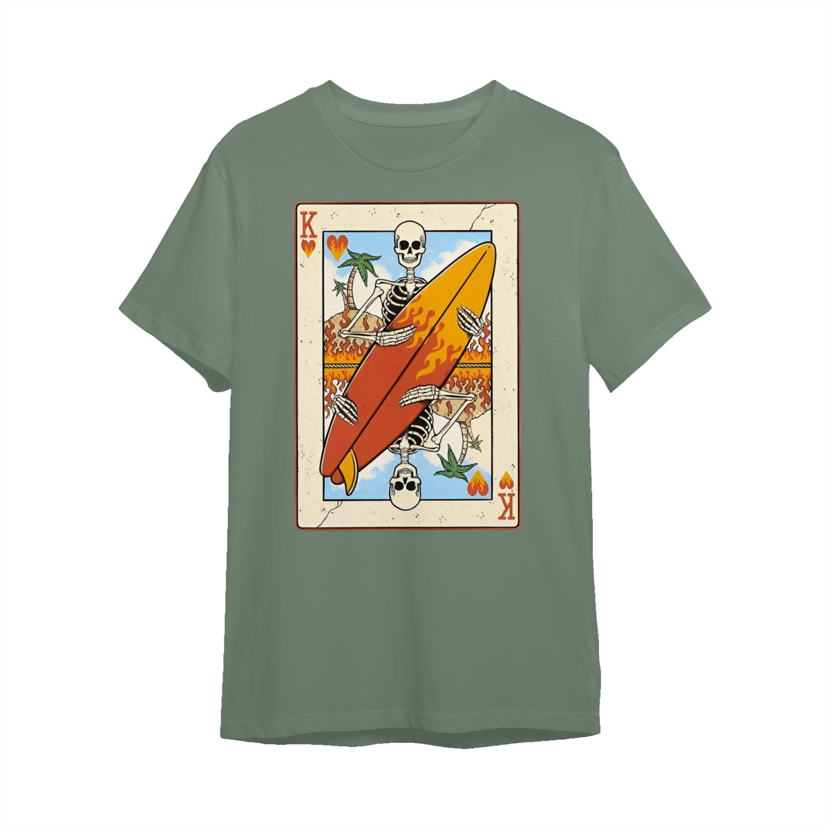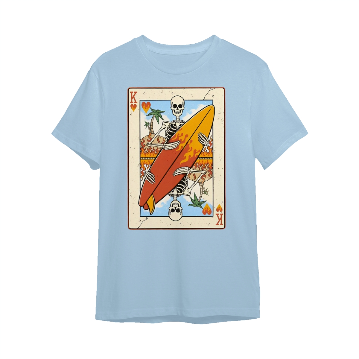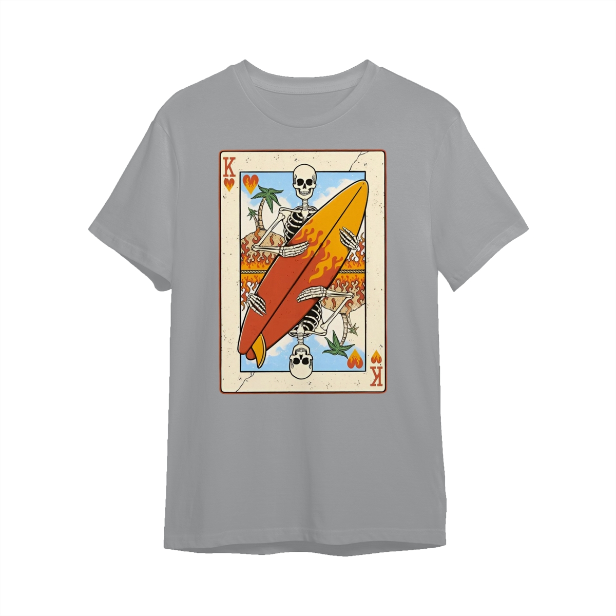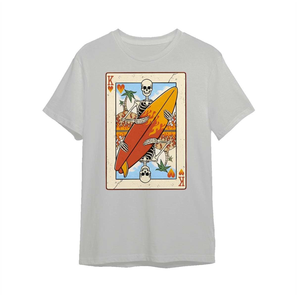 Flaming Surf King Skeleton Shirt – Vintage Playing Card Graphic Tee for Men & Women, Cool Beach Vibes Summer Shirt