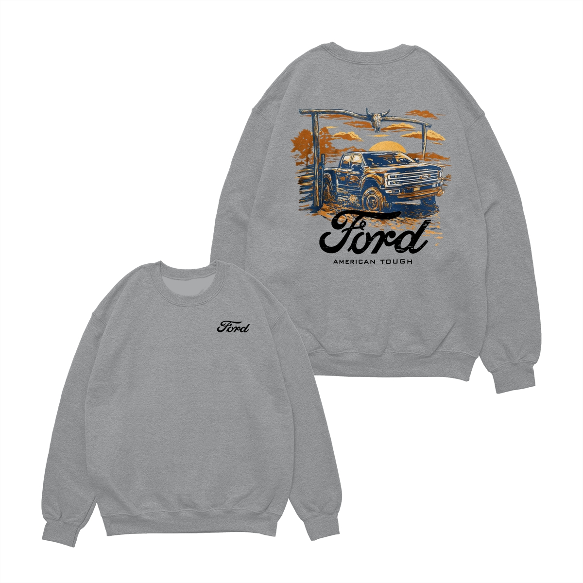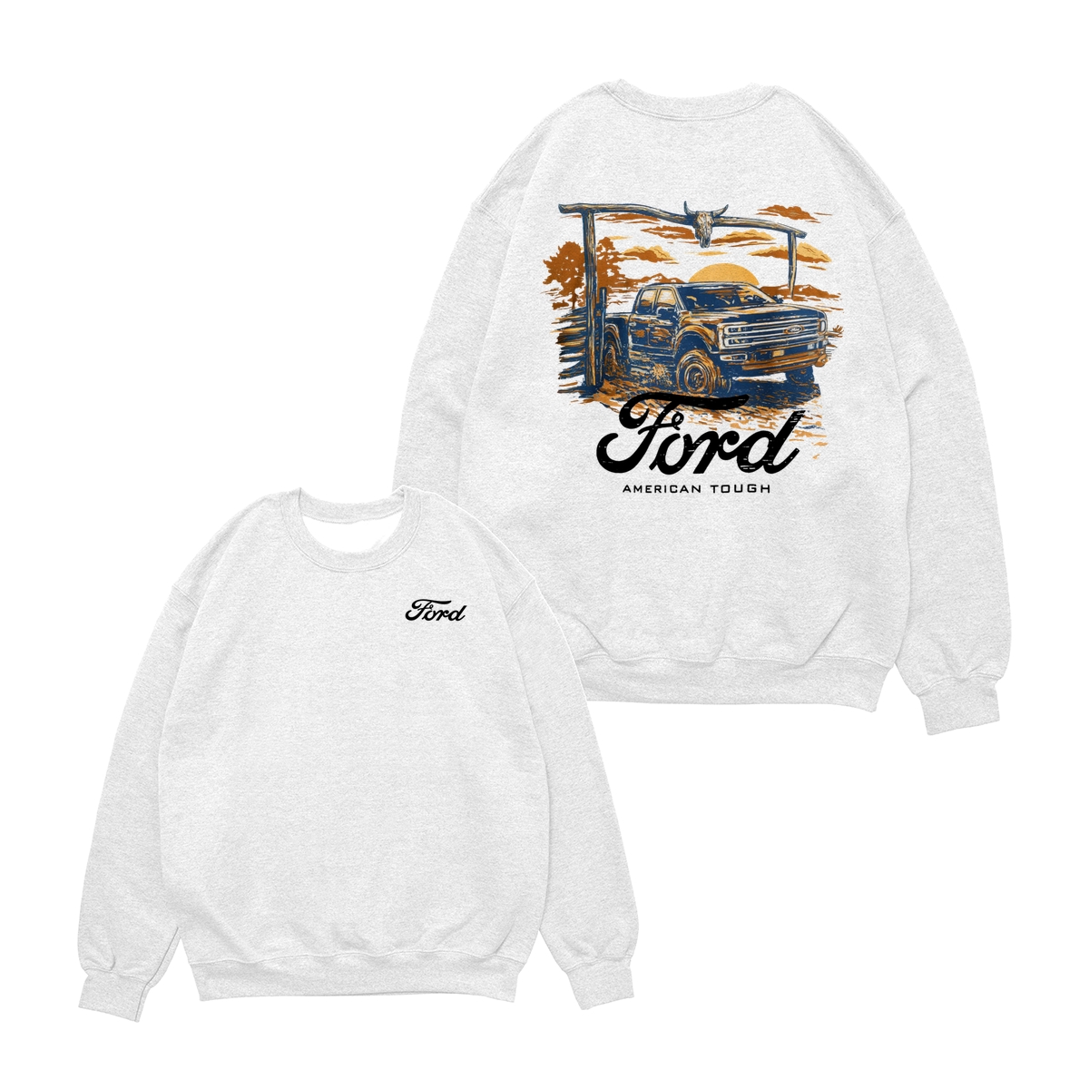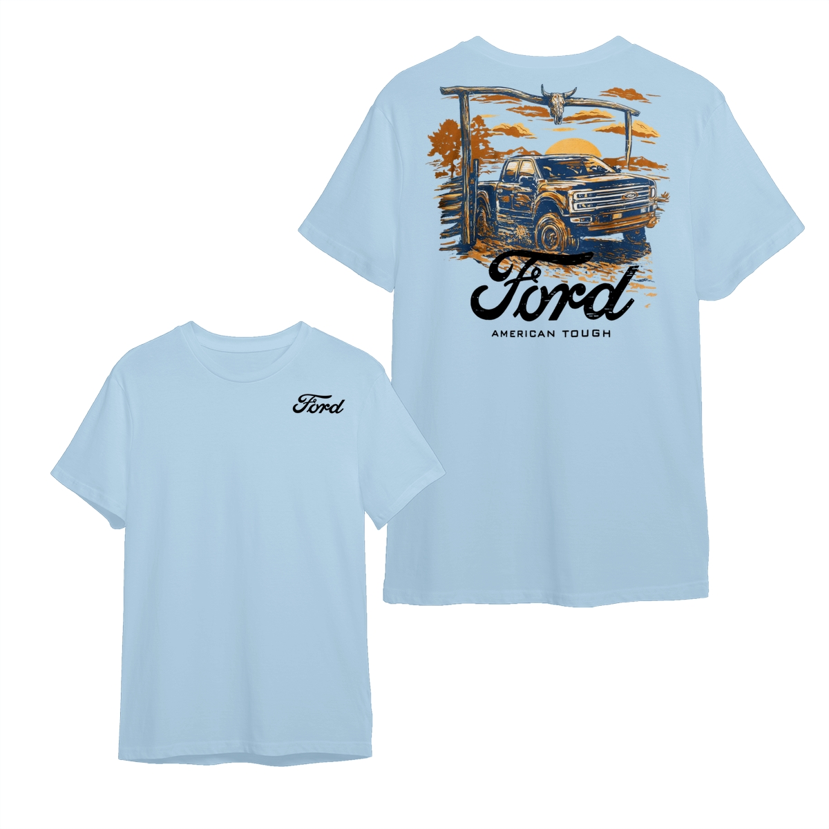 Ford American Tough T-Shirt, Western Sunset Truck Graphic with Longhorn Skull Gate, Rugged Country Design for Pickup Lovers, Ford Truck Fans Tee