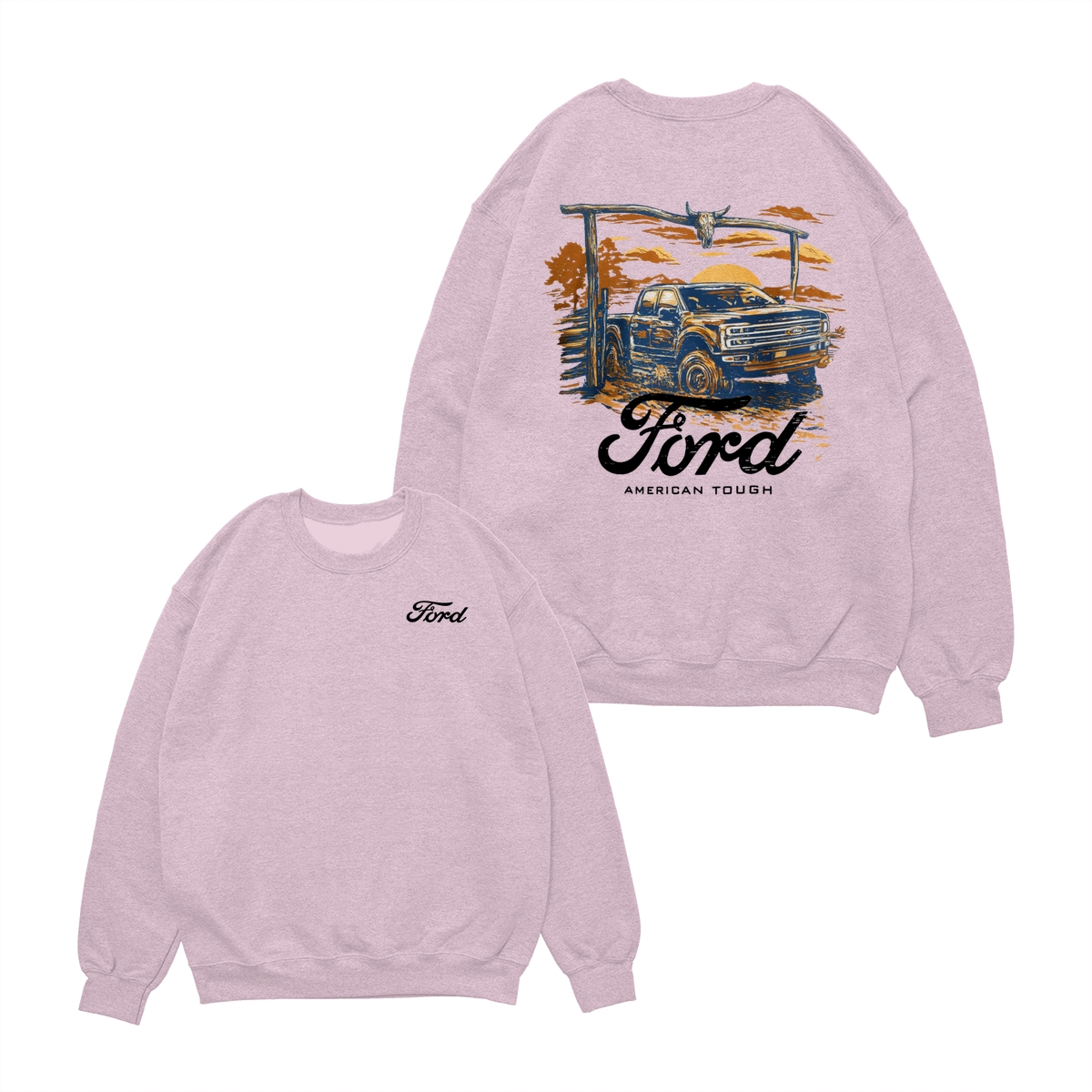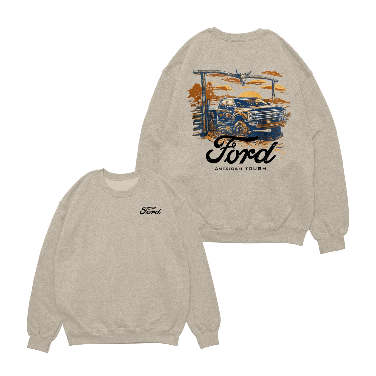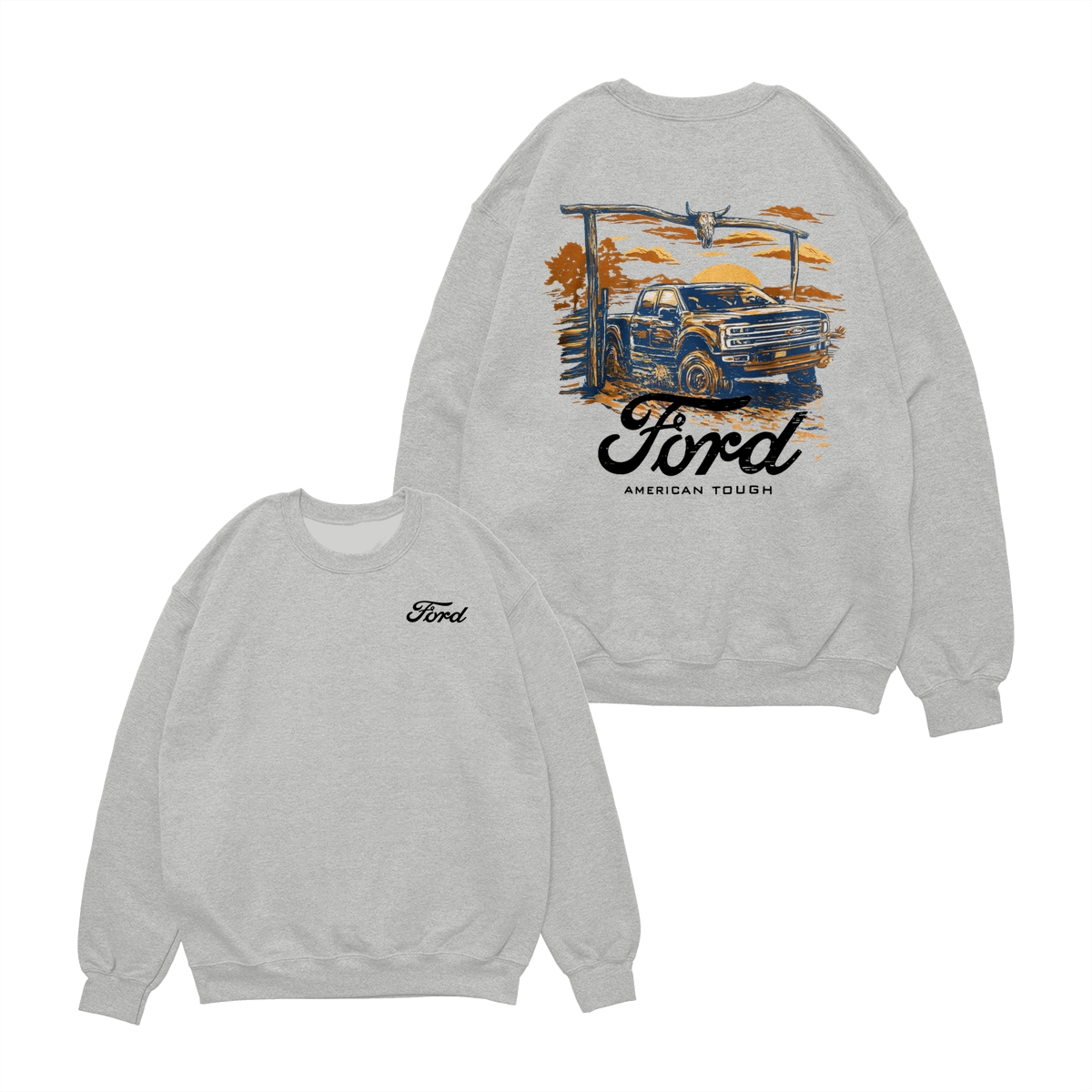Ford American Tough T-Shirt, Western Sunset Truck Graphic with Longhorn Skull Gate, Rugged Country Design for Pickup Lovers, Ford Truck Fans Tee