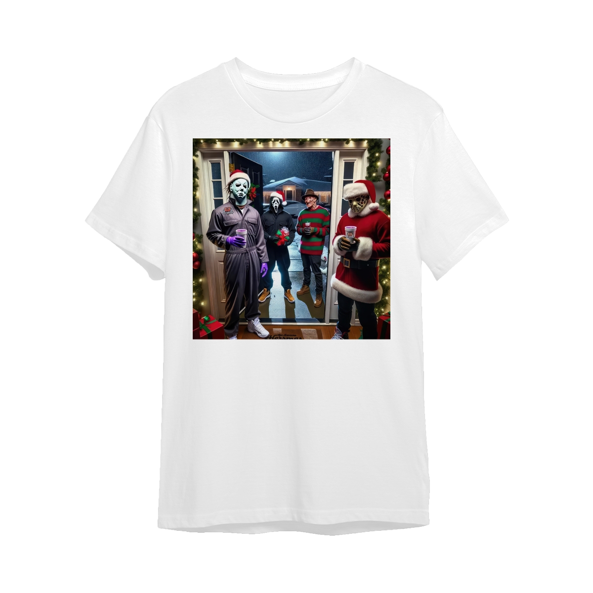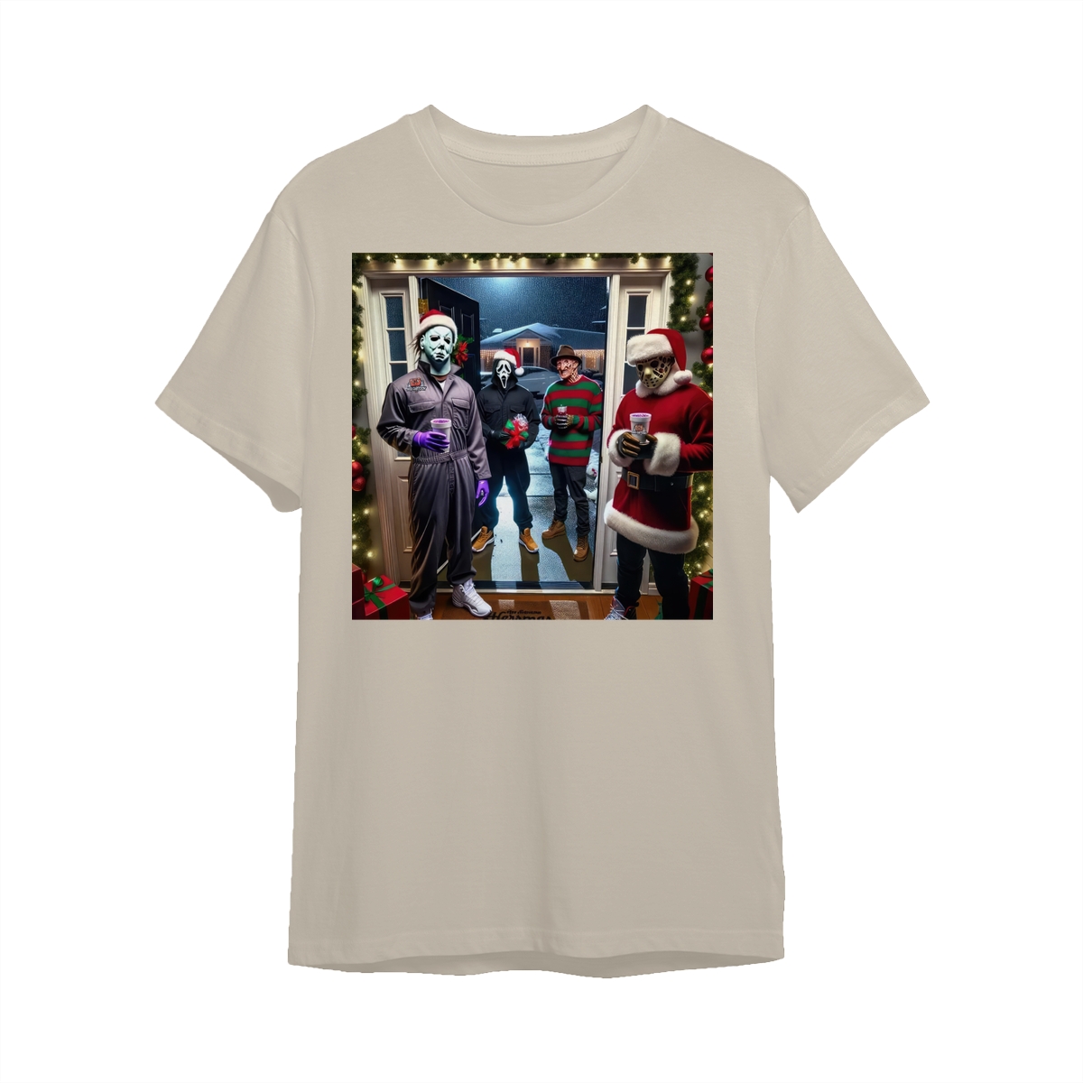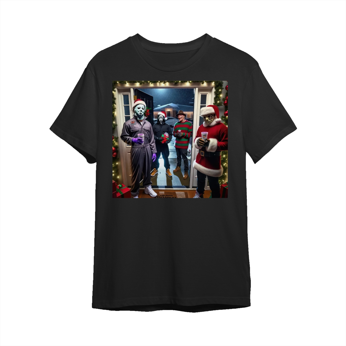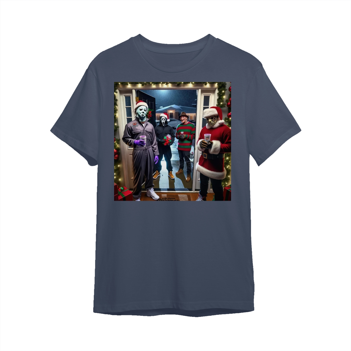 Funny All Character Christmas Horror Movies T-Shirt , Ghost Face x M Myers x Kruger’s Merry Christmas Shirt, Funny Merry Xmas Holiday Shirt, Casual Cotton Shirt for Men and Women, Classic Fashion Comfort