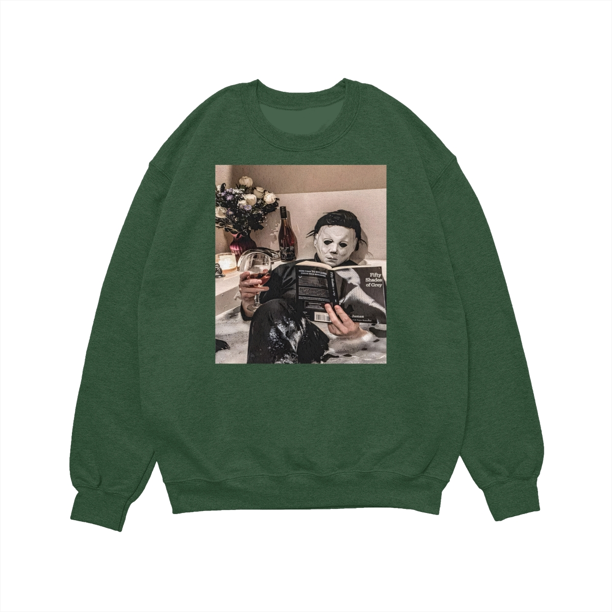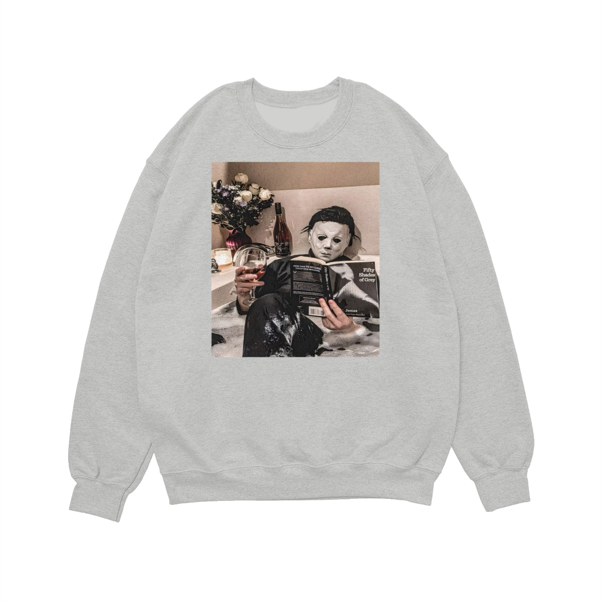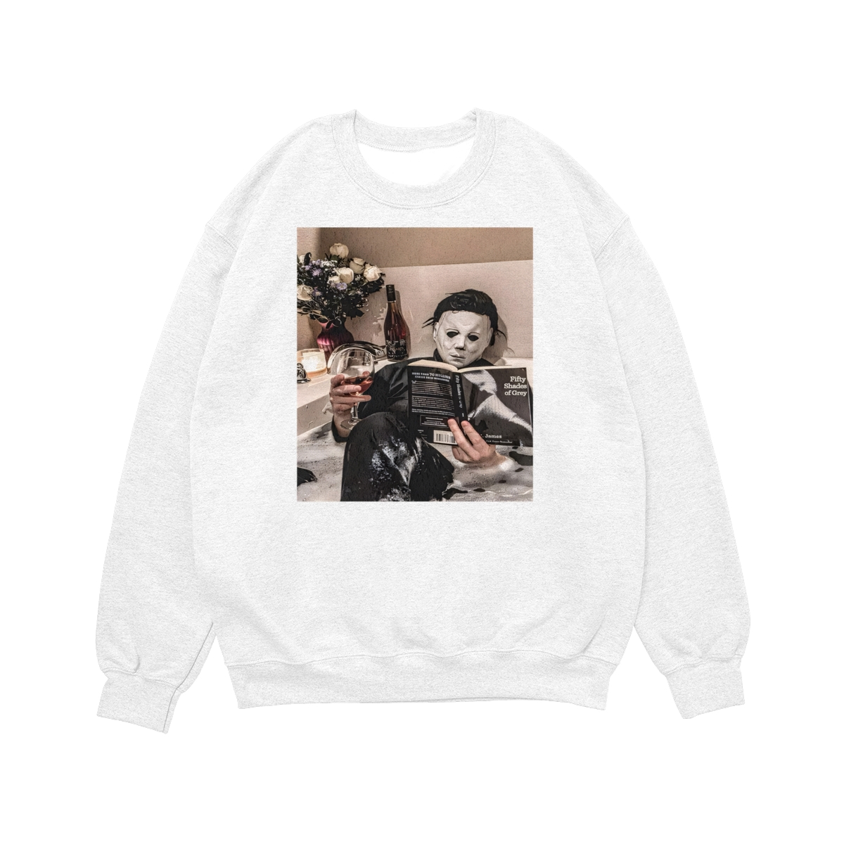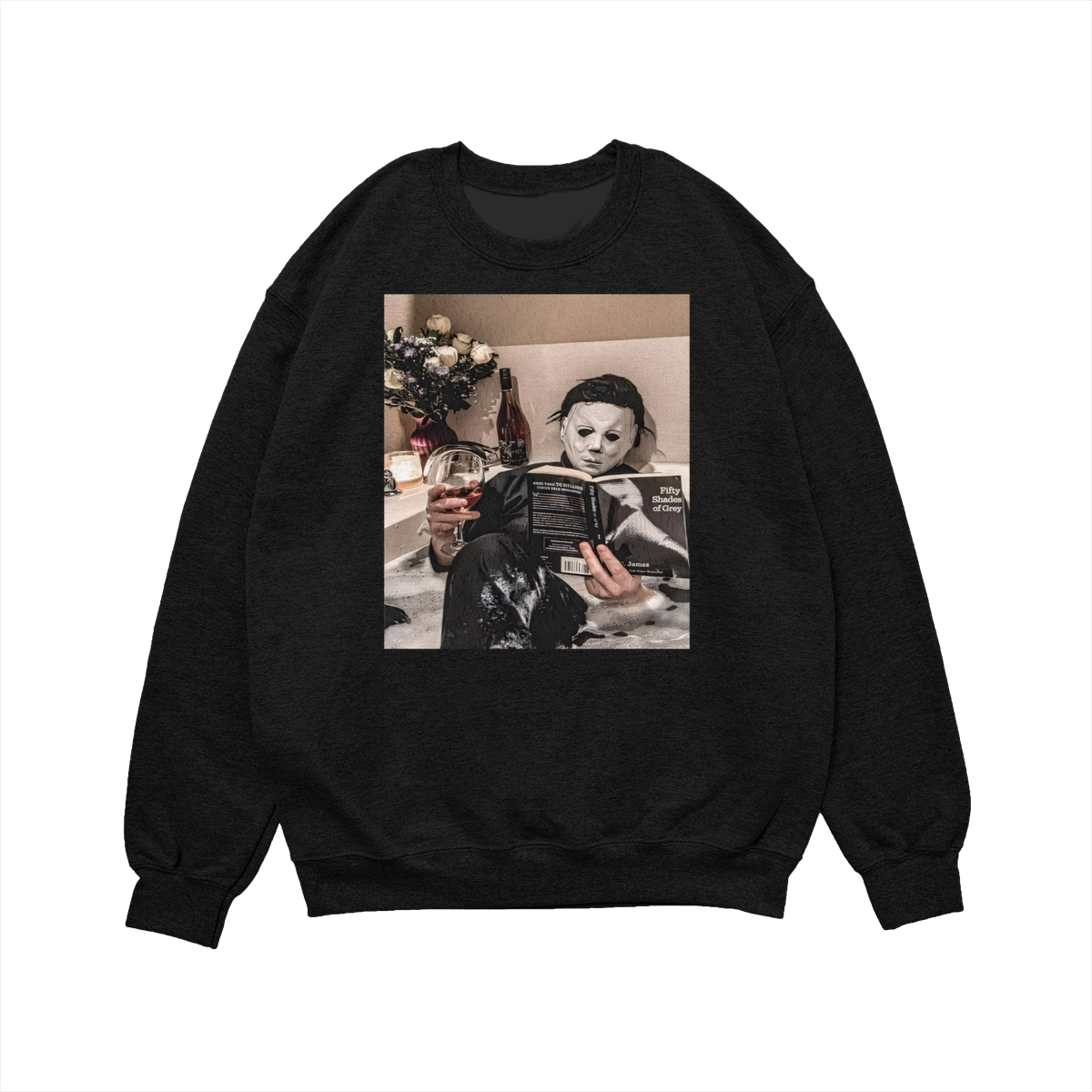 Funny Halloween TShirt/Sweatshirt/Hoodie – Michael Myers Relaxing in Bathtub with Wine & Book Graphic, Cozy Spooky Season Unisex Crewneck for Horror Fans