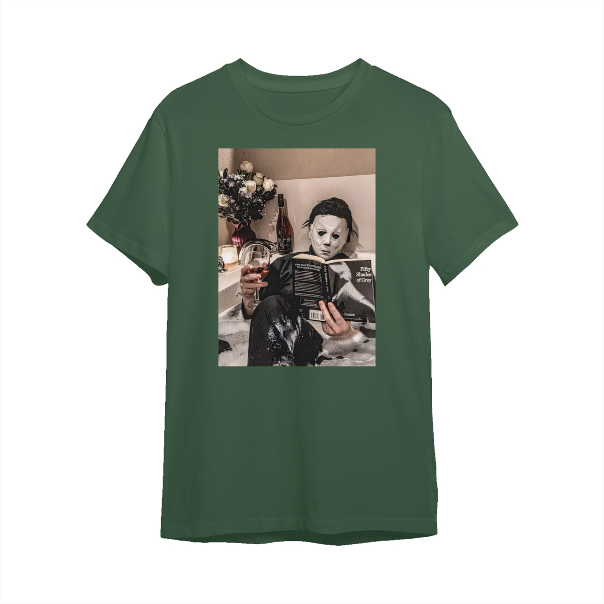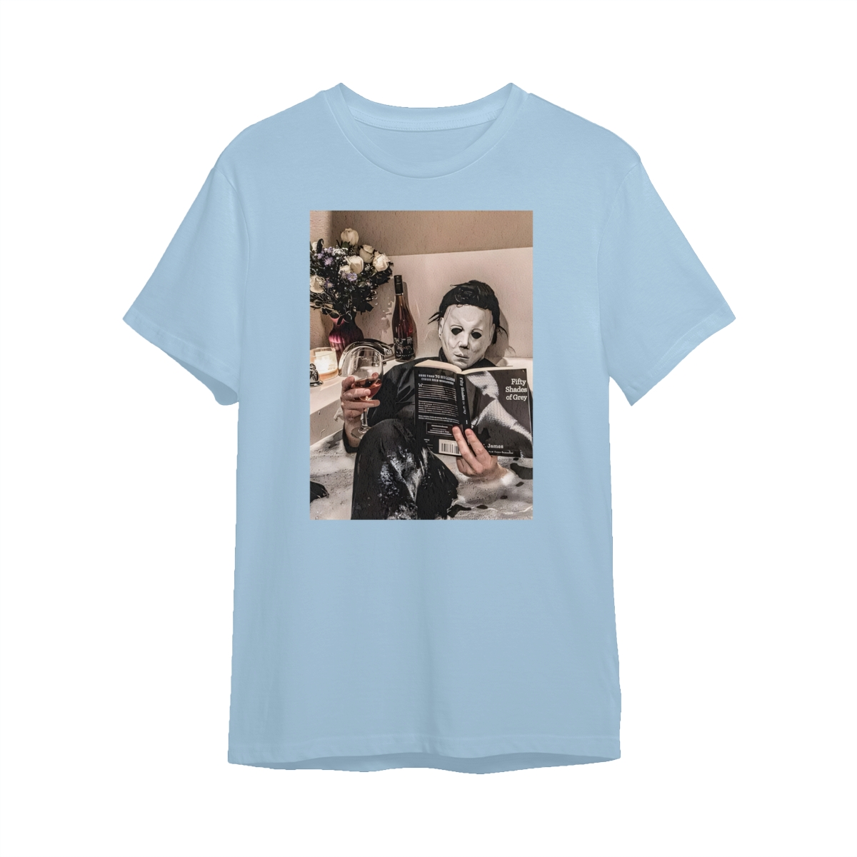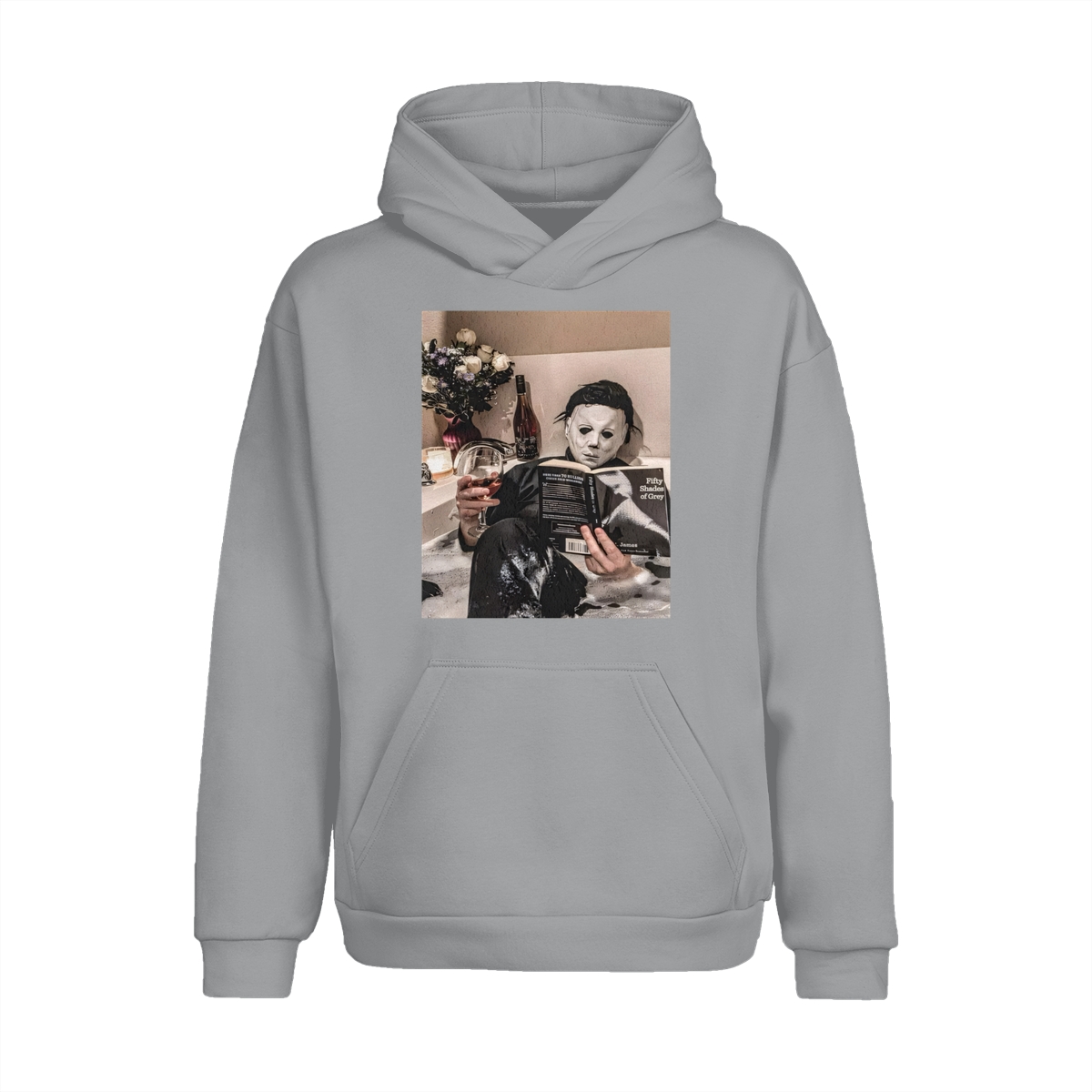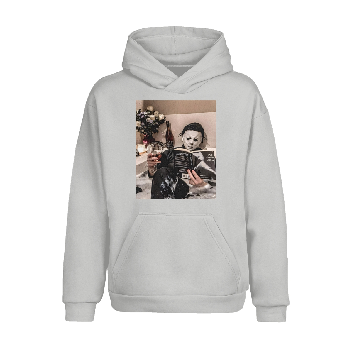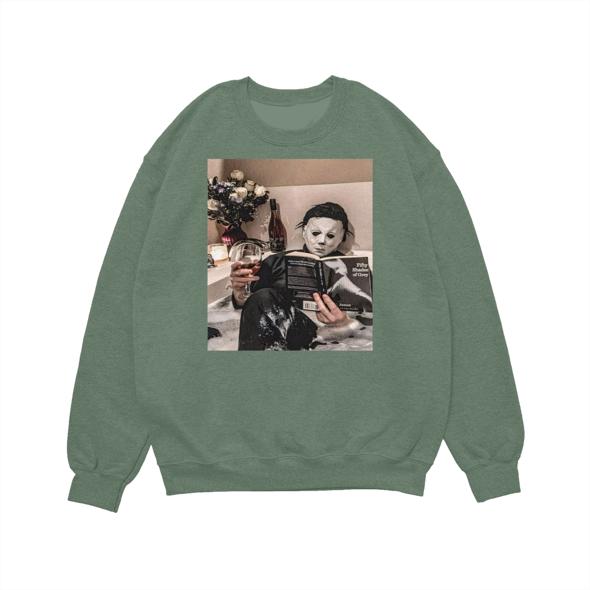 Funny Halloween TShirt/Sweatshirt/Hoodie – Michael Myers Relaxing in Bathtub with Wine & Book Graphic, Cozy Spooky Season Unisex Crewneck for Horror Fans