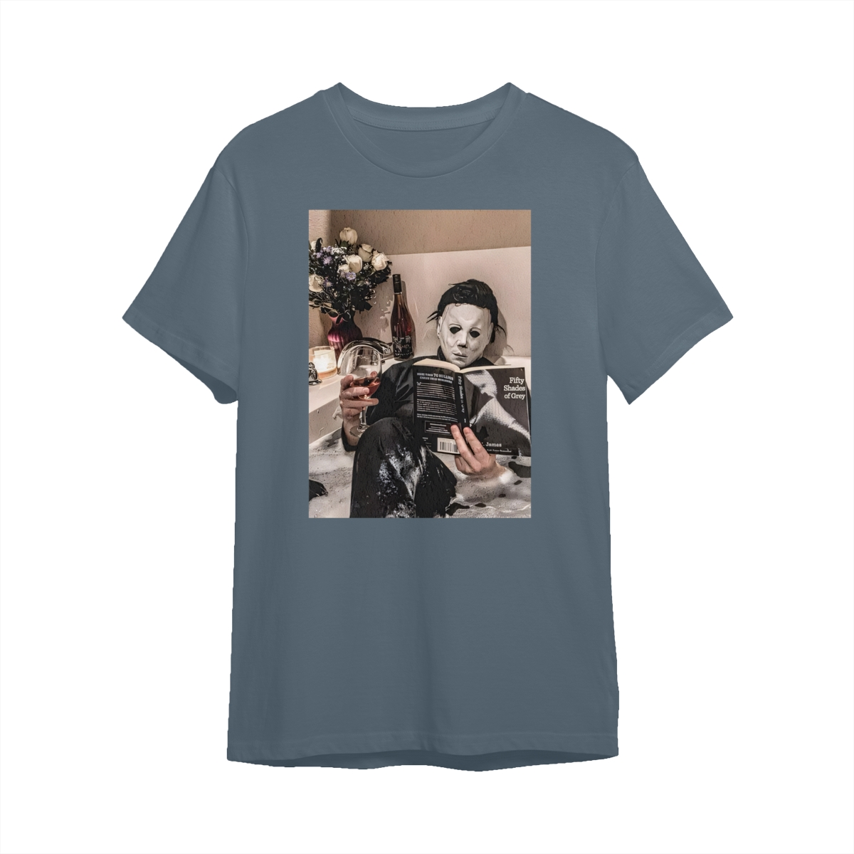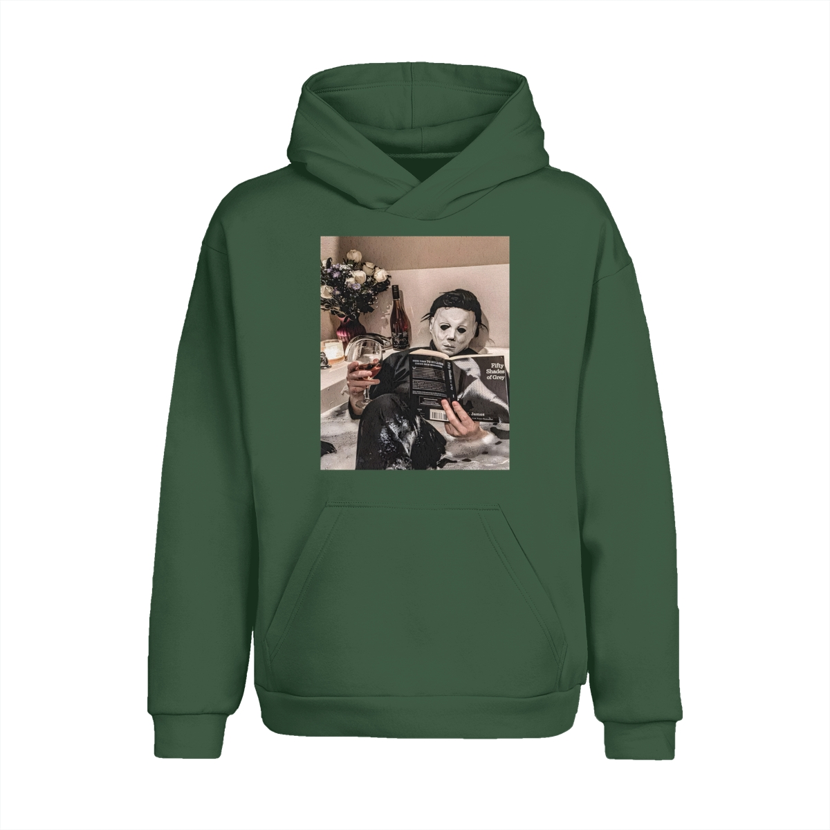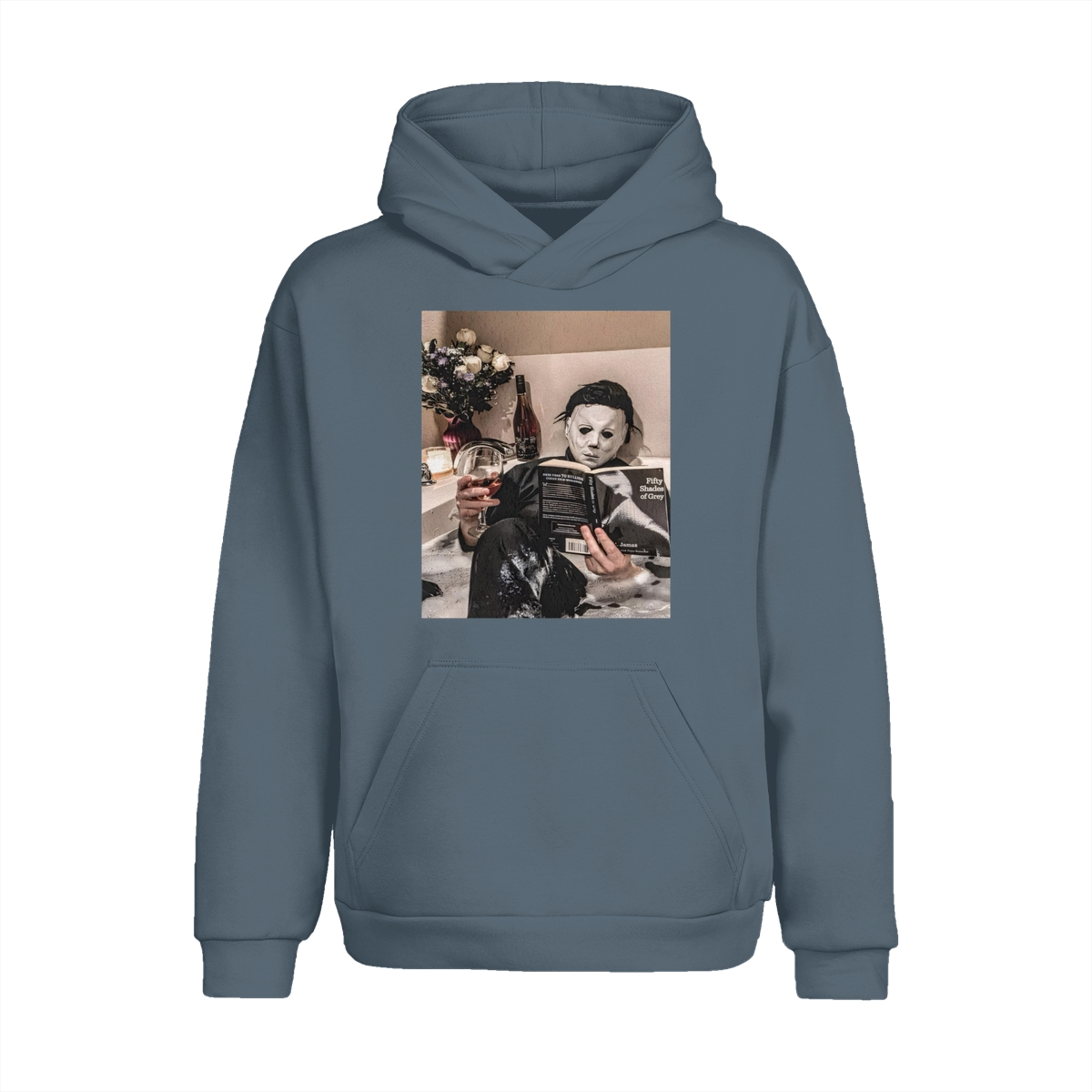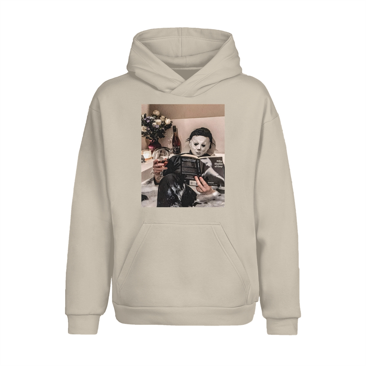 Funny Halloween TShirt/Sweatshirt/Hoodie – Michael Myers Relaxing in Bathtub with Wine & Book Graphic, Cozy Spooky Season Unisex Crewneck for Horror Fans