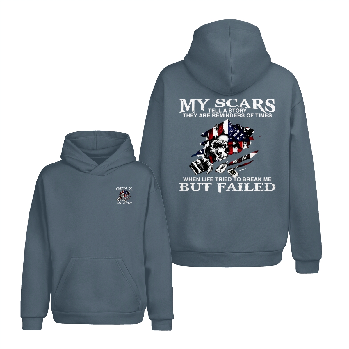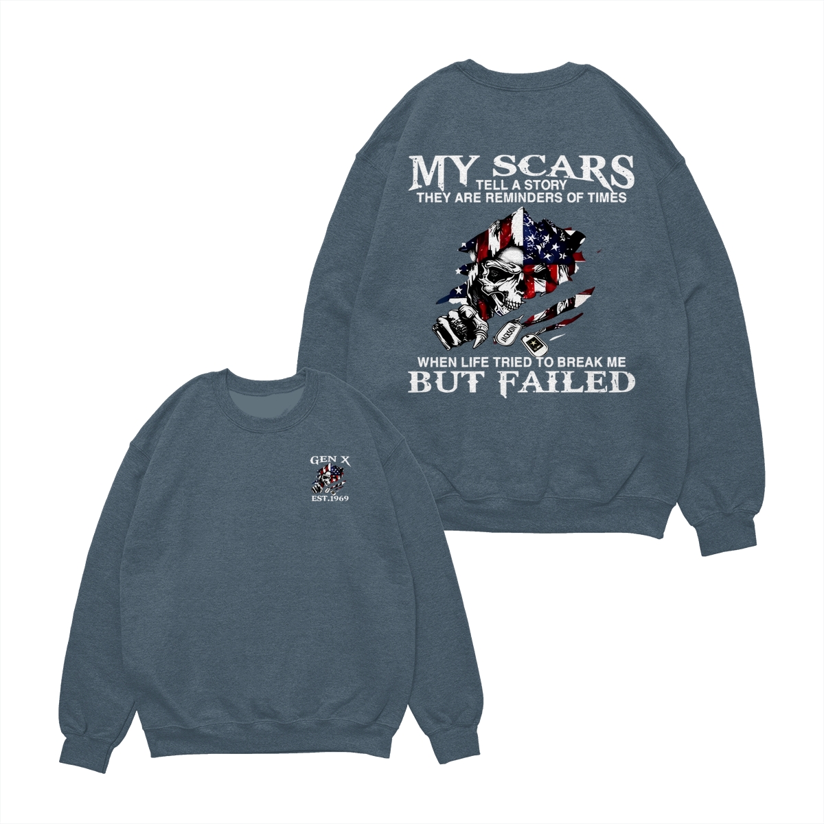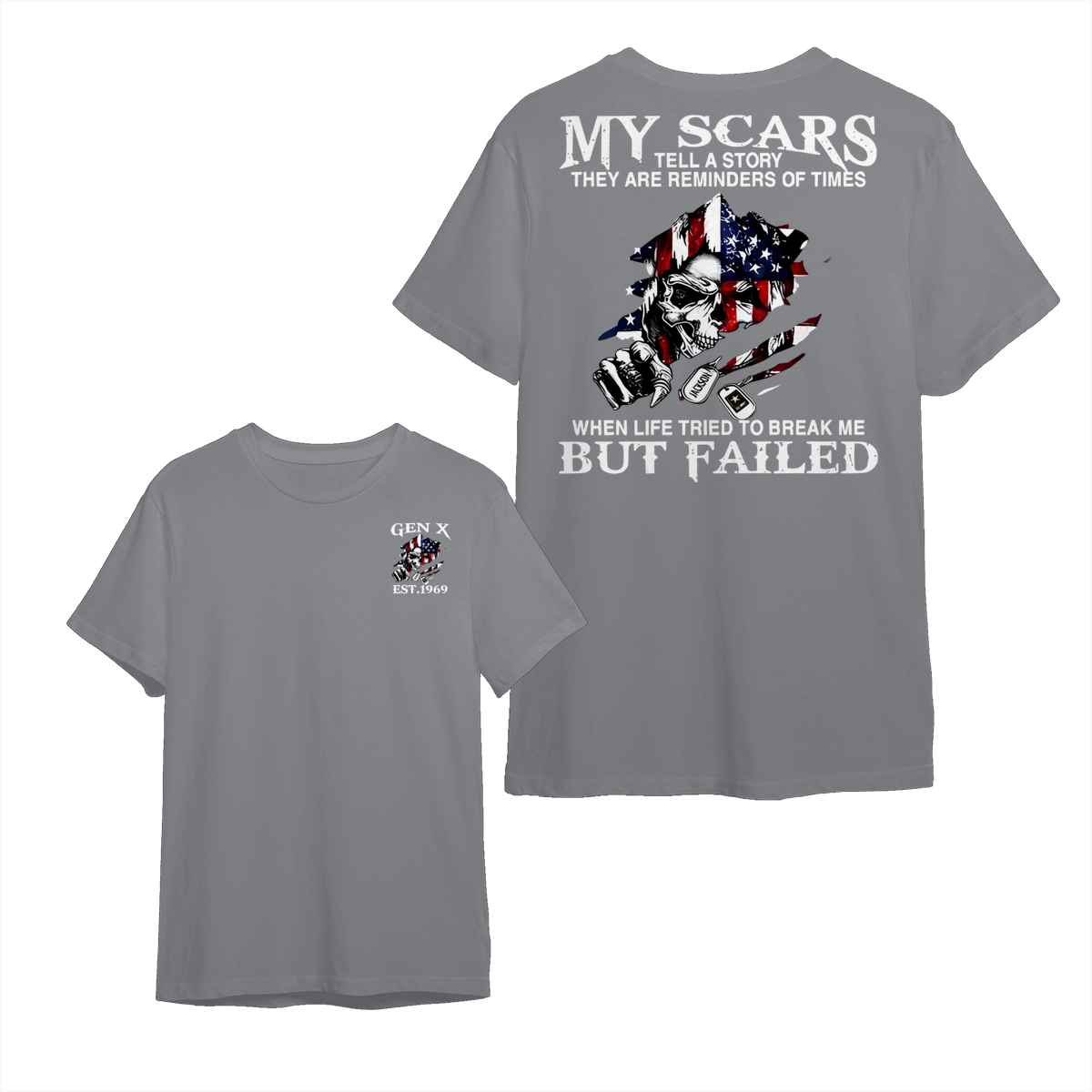 Gen X Custom Year Gen X T-Shirt, ‘My Scars Tell A Story’ Skull with American Flag & Dog Tags Graphic, Bold Patriotic Cotton Tee for Men and Women