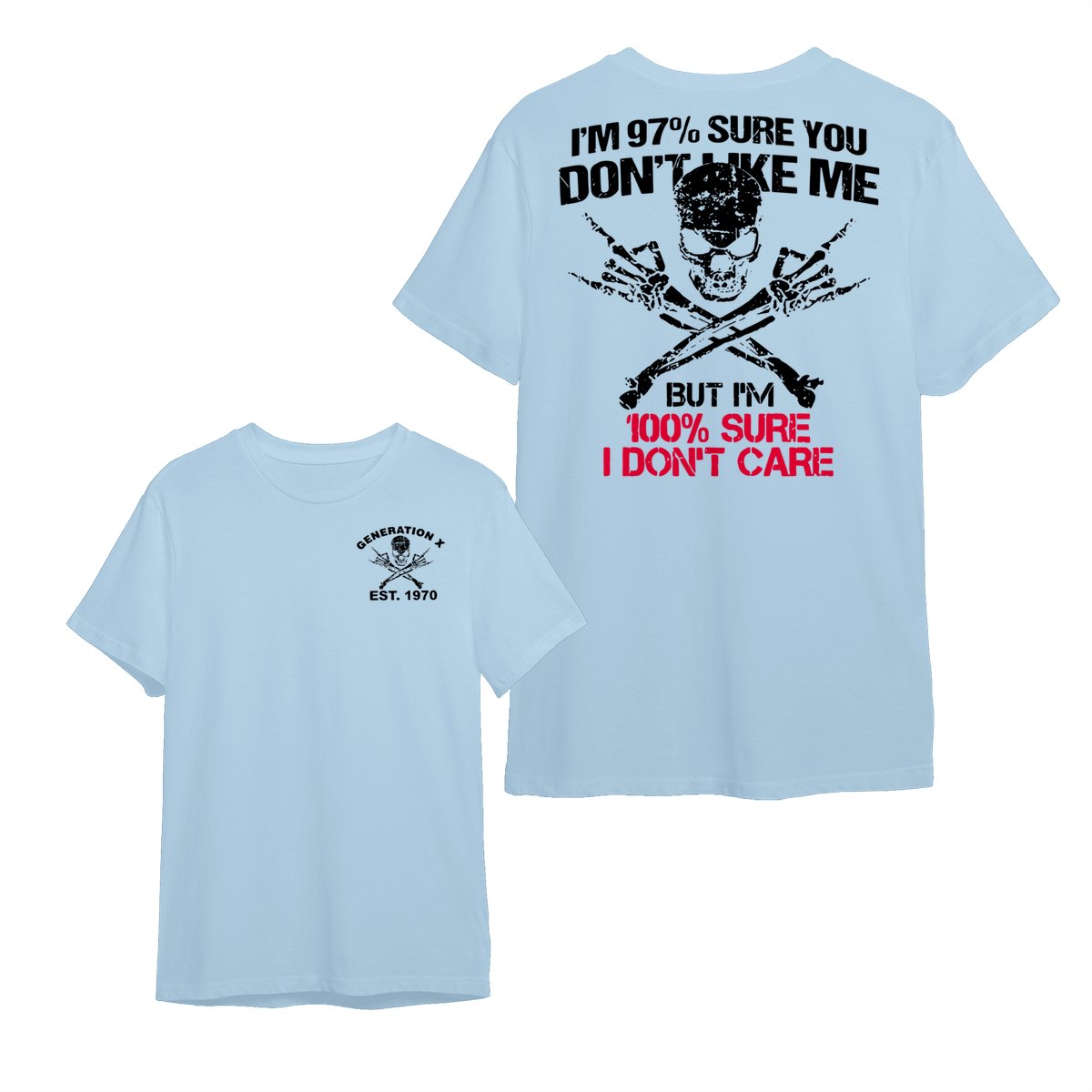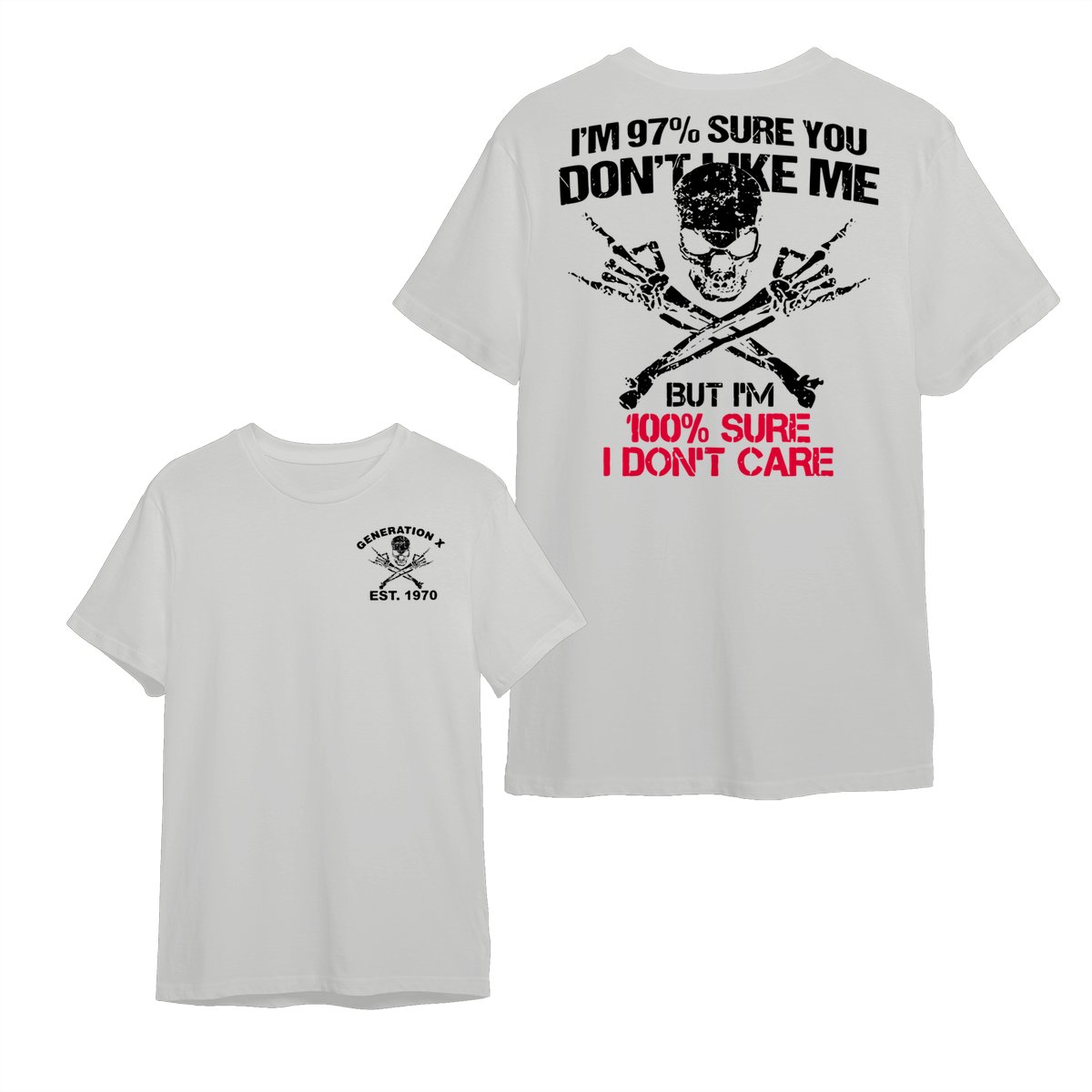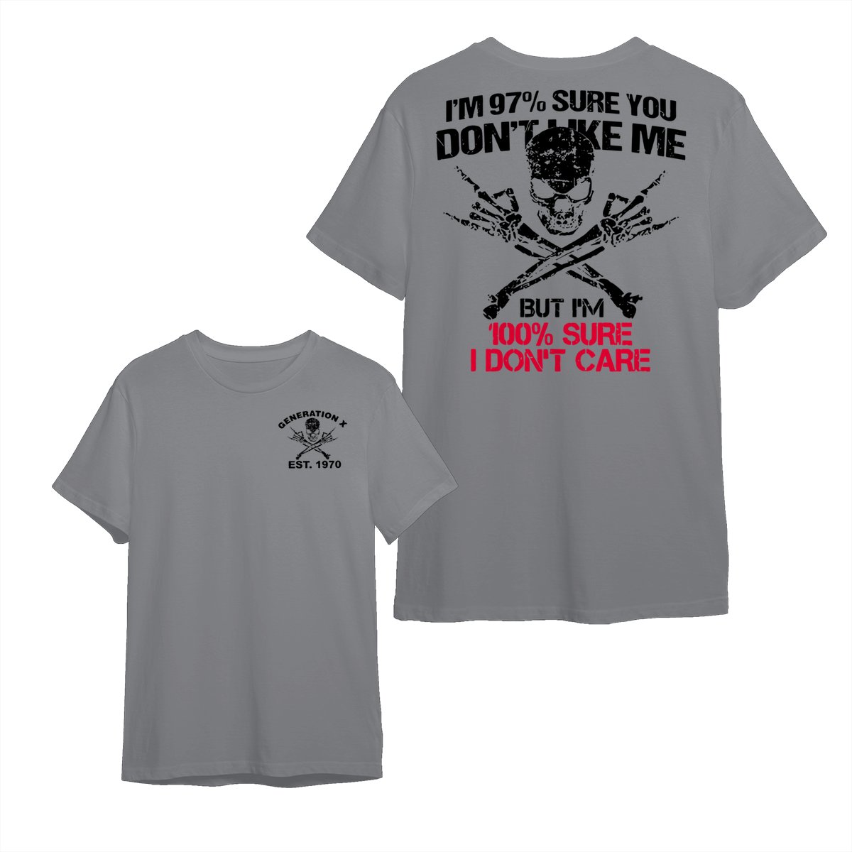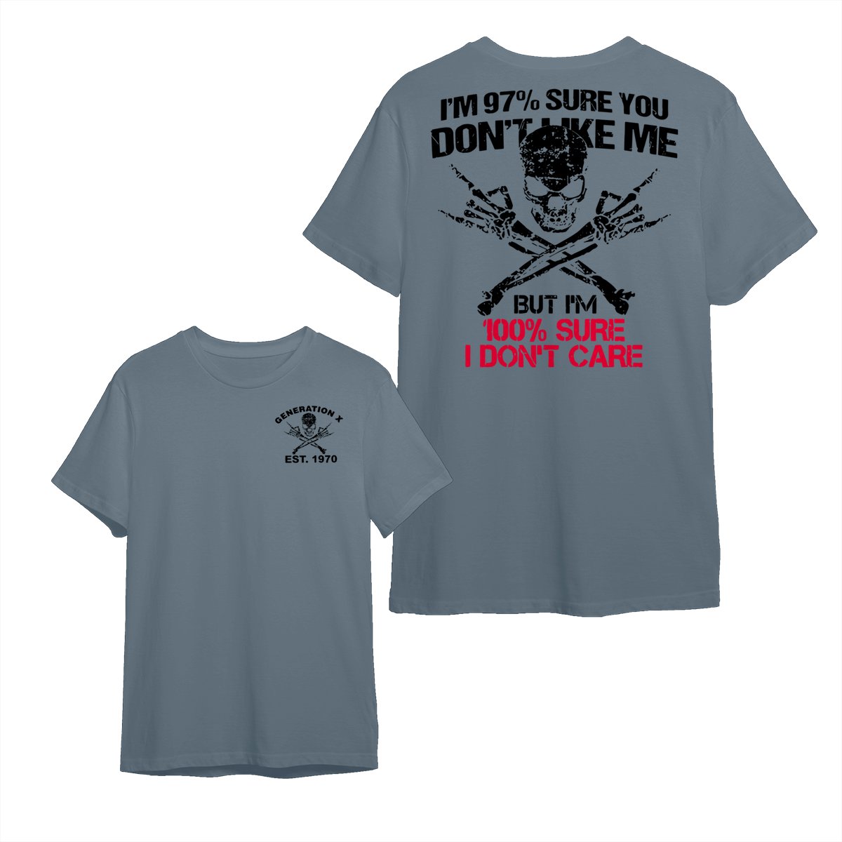 Generation X Skull T-Shirt, 97% Sure You Don’t Like Me Graphic Tee, 100% I Don’t Care Slogan Shirt, Funny Skull & Bones Design for Gen X, Rebel Attitude Apparel