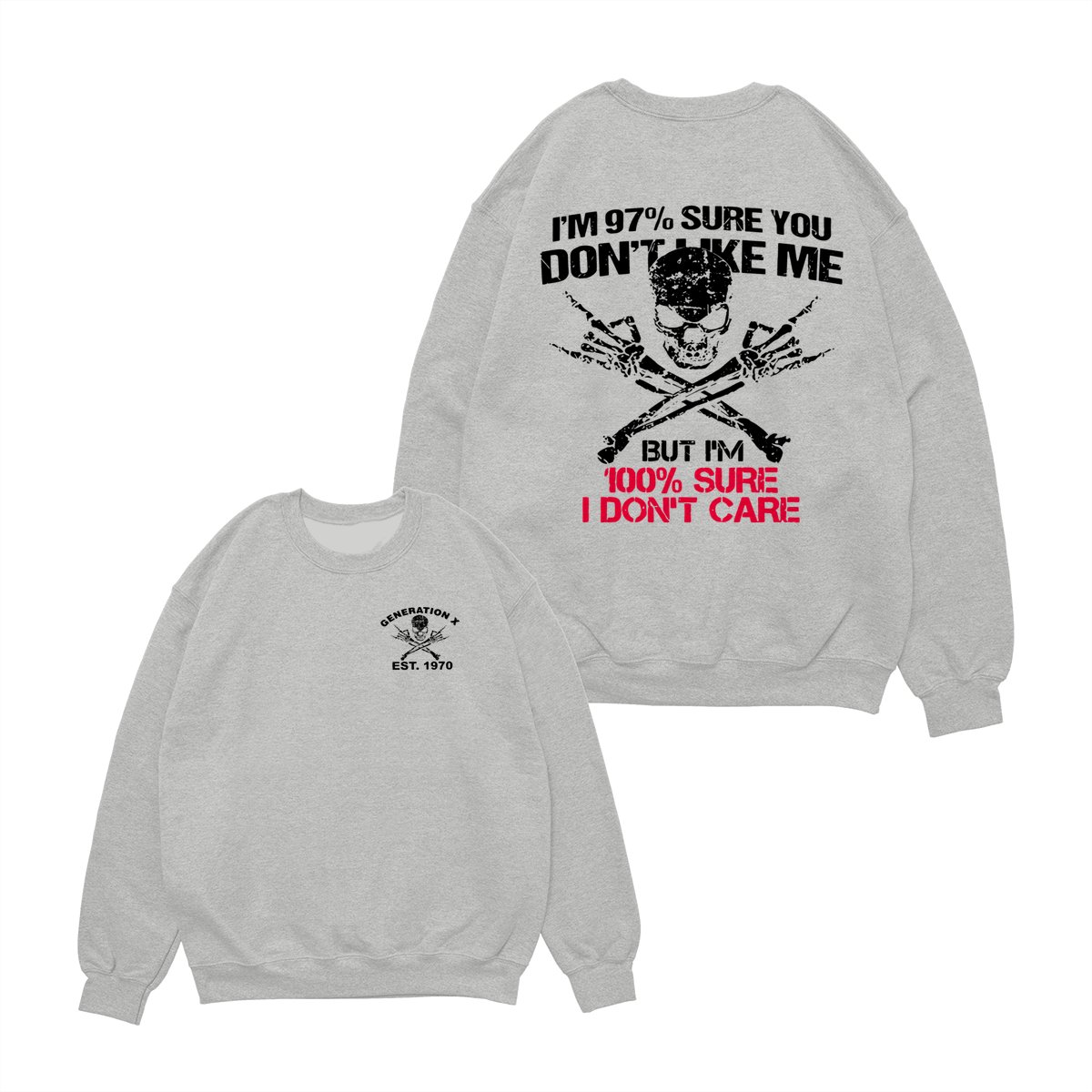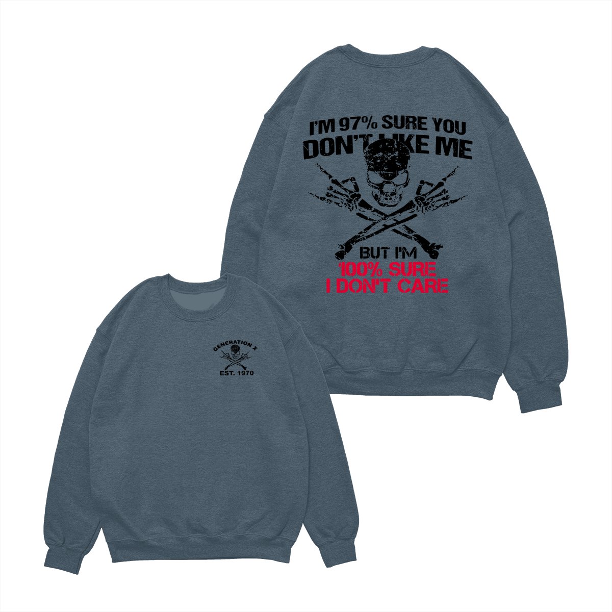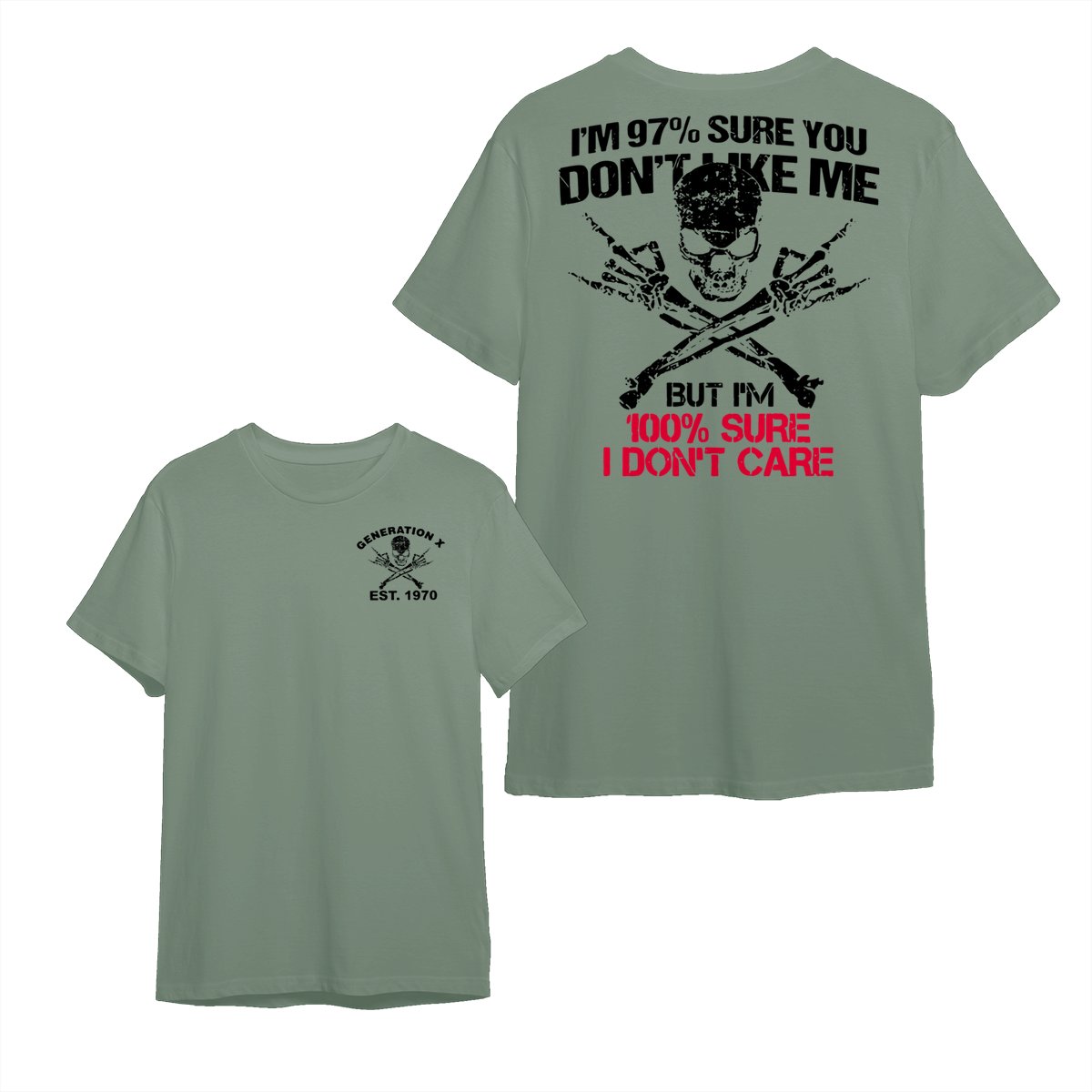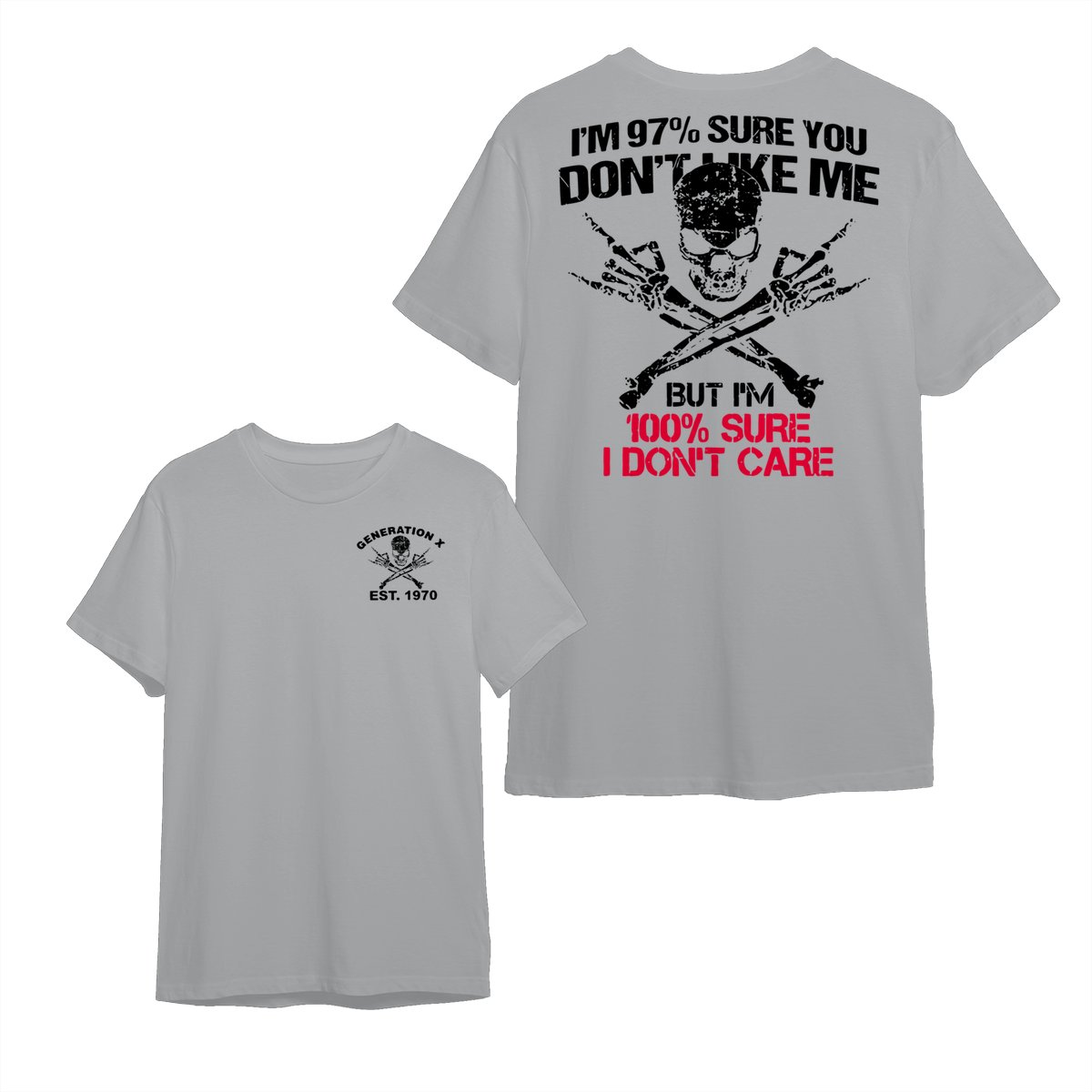 Generation X Skull T-Shirt, 97% Sure You Don’t Like Me Graphic Tee, 100% I Don’t Care Slogan Shirt, Funny Skull & Bones Design for Gen X, Rebel Attitude Apparel