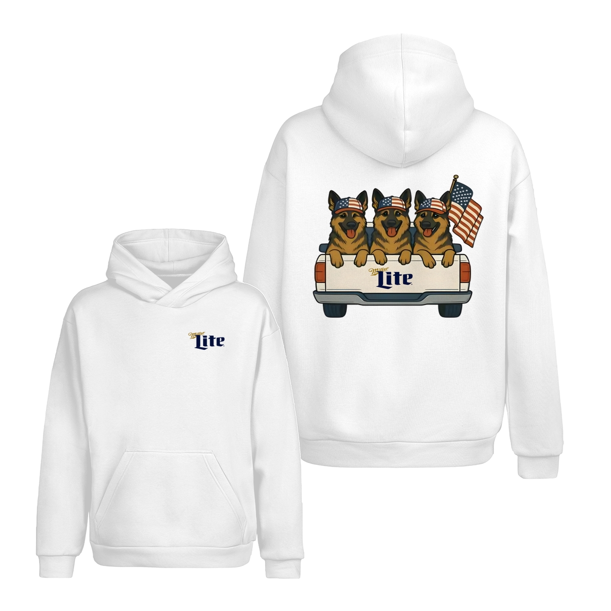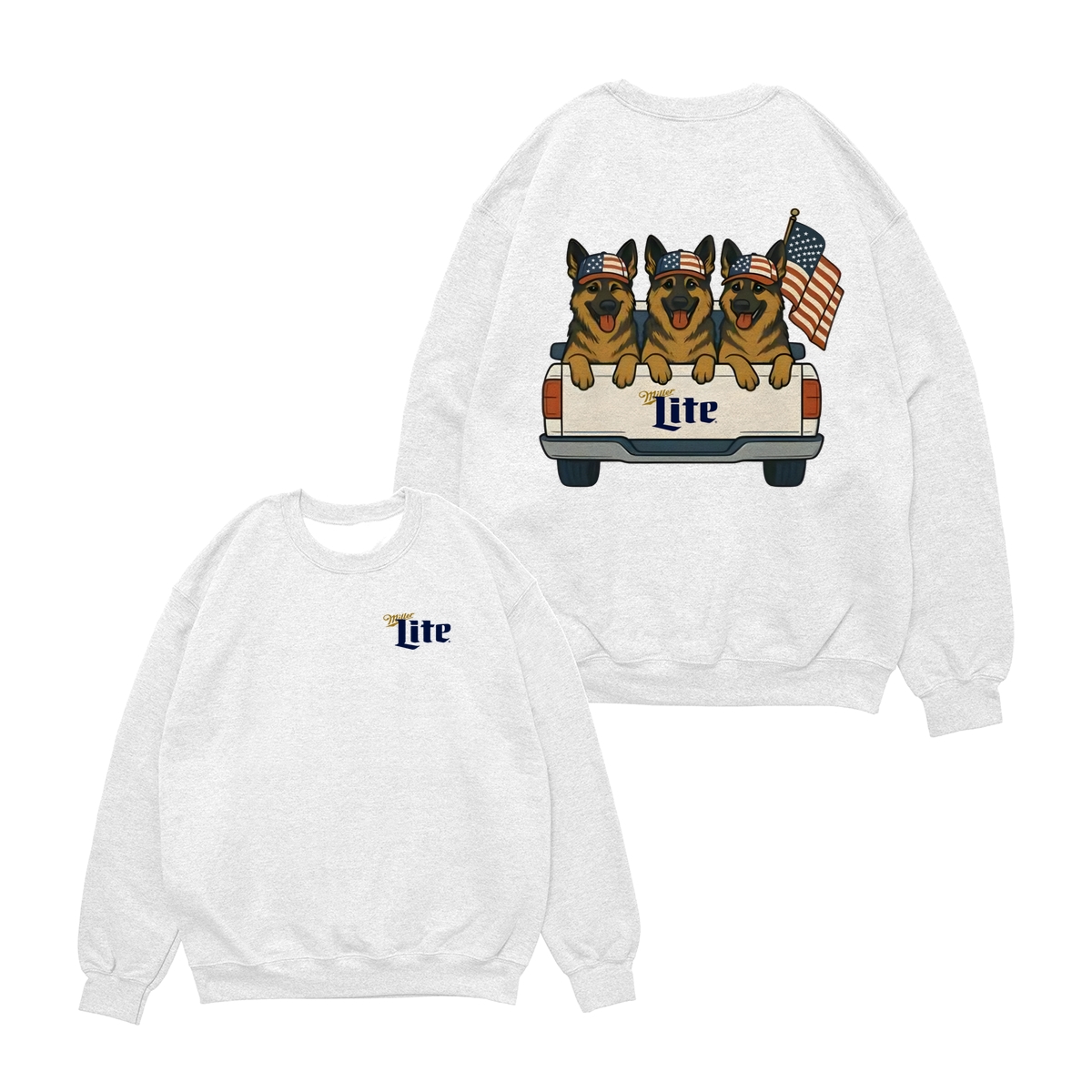 German Shepherd Miller-Lite 2 Sides T-Shirt, Dog in Truck 4th Of July Cotton Tee, Patriotic USA Flag, America Independence Day Shirt