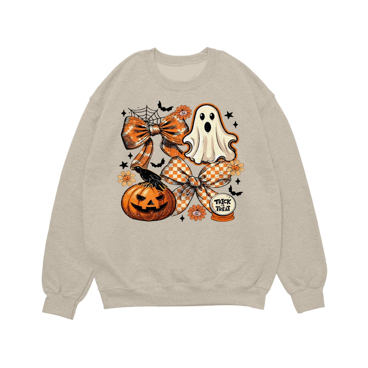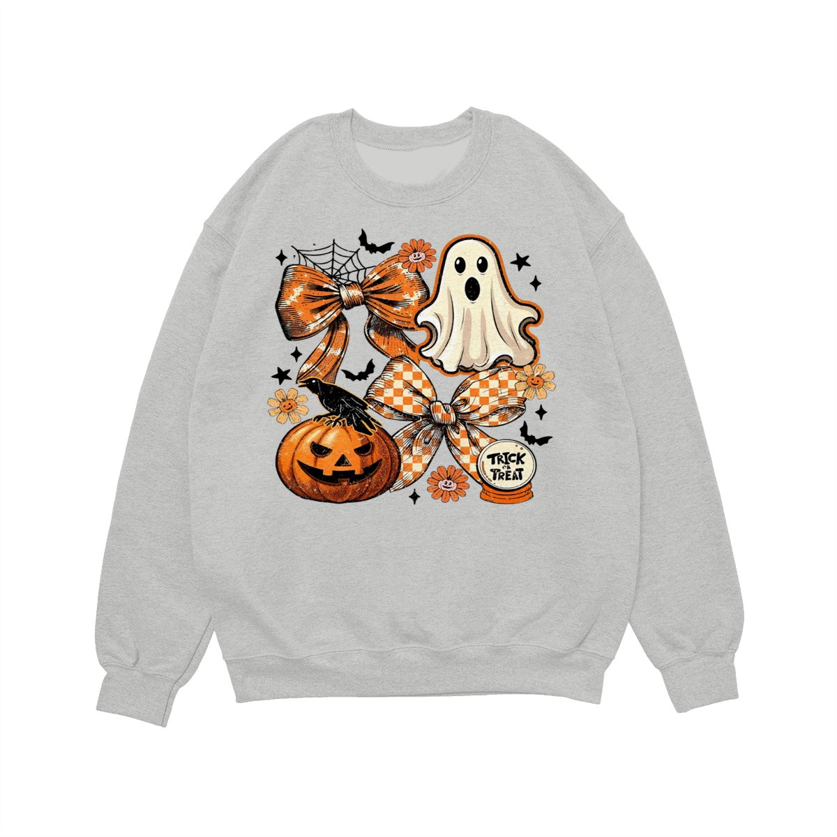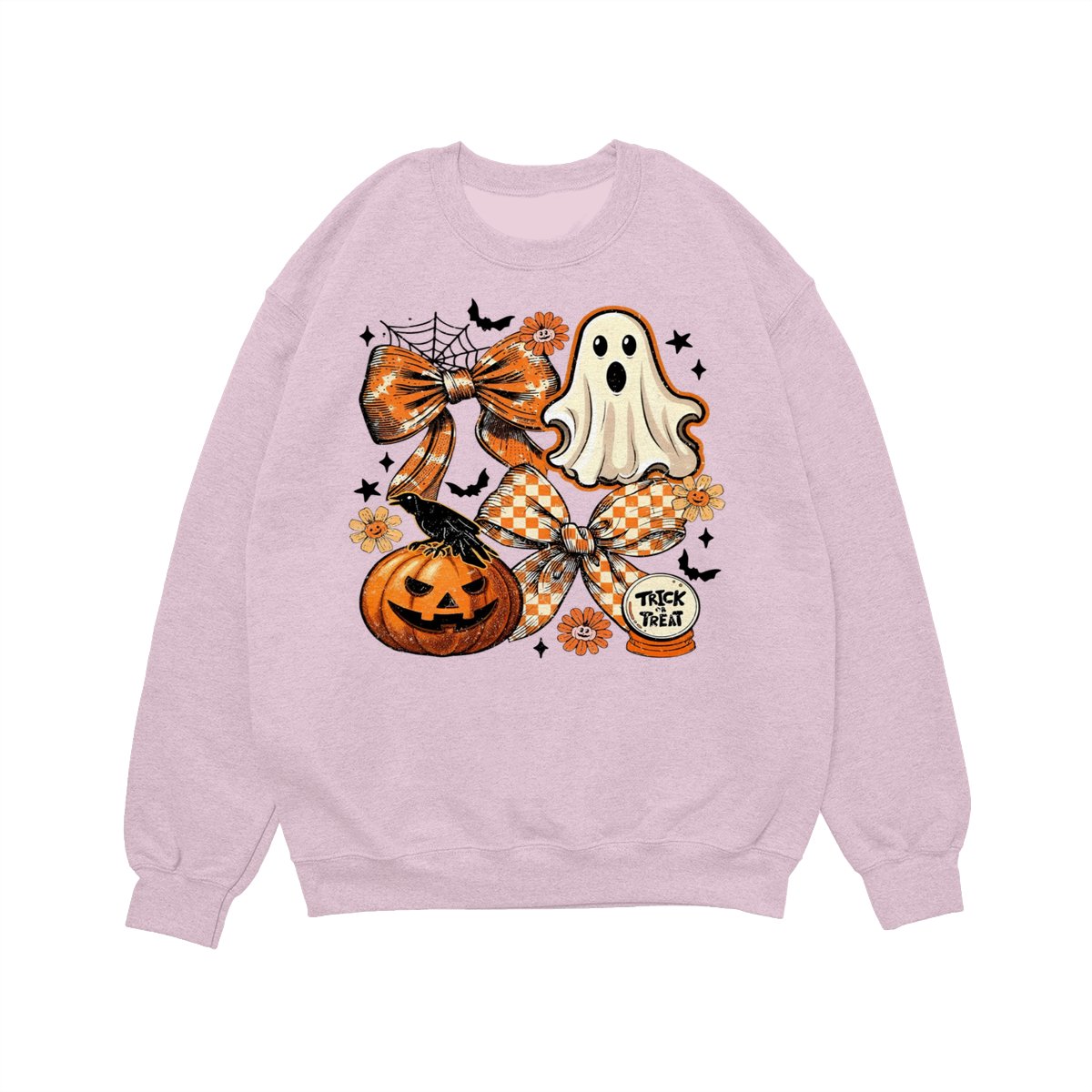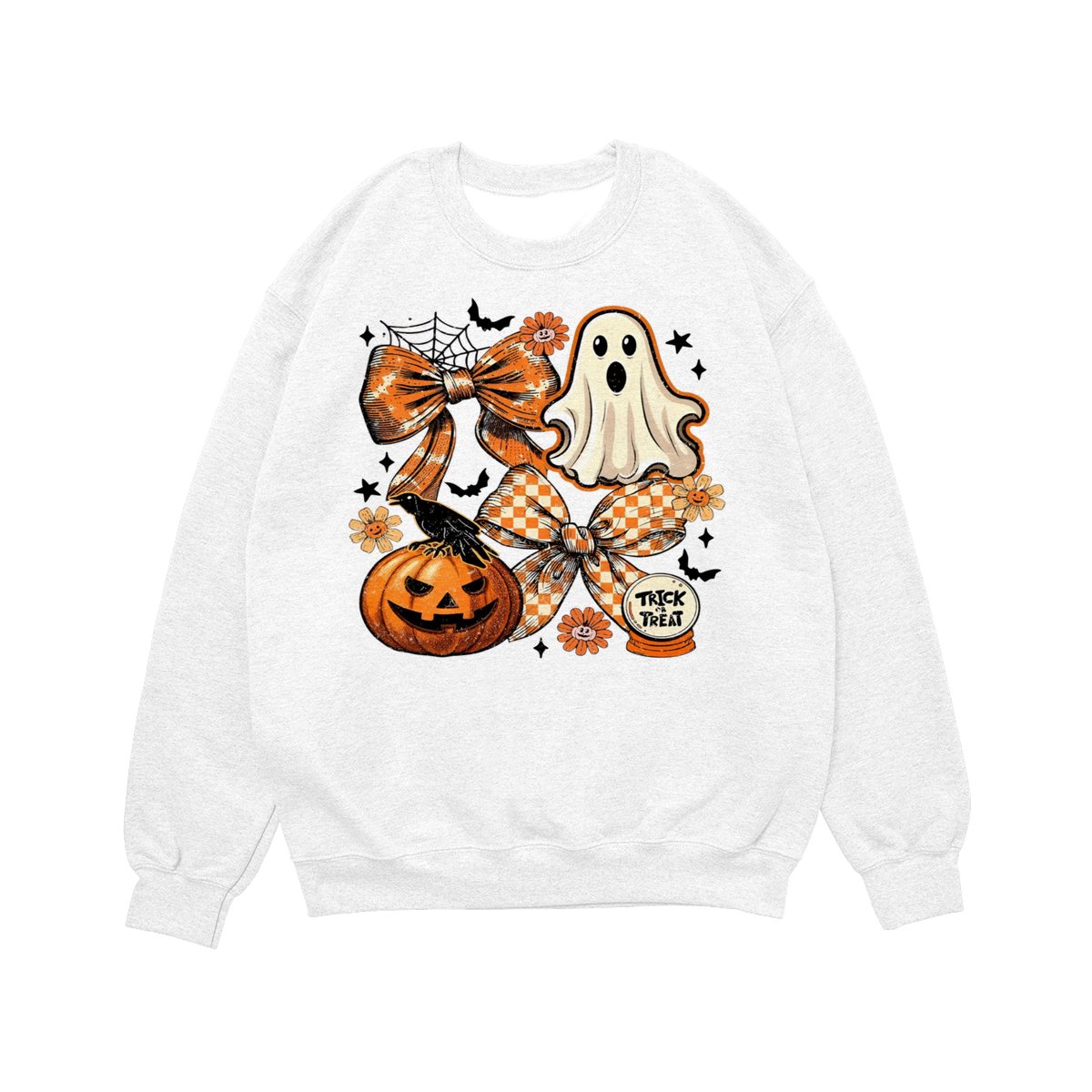 Ghost and Pumpkin Halloween Sweatshirt – Cute Fall Graphic with Bows, Trick or Treat, and Spooky Details