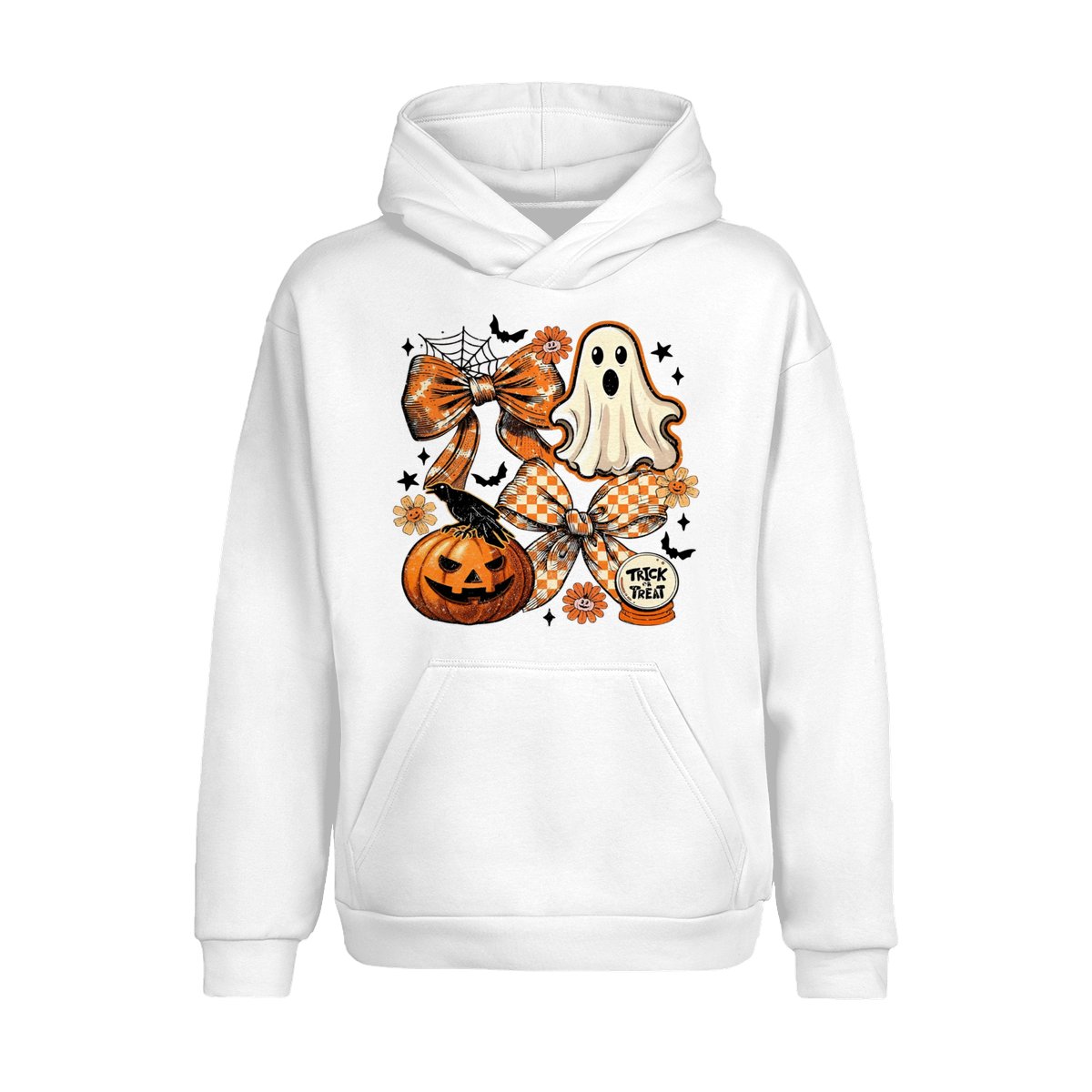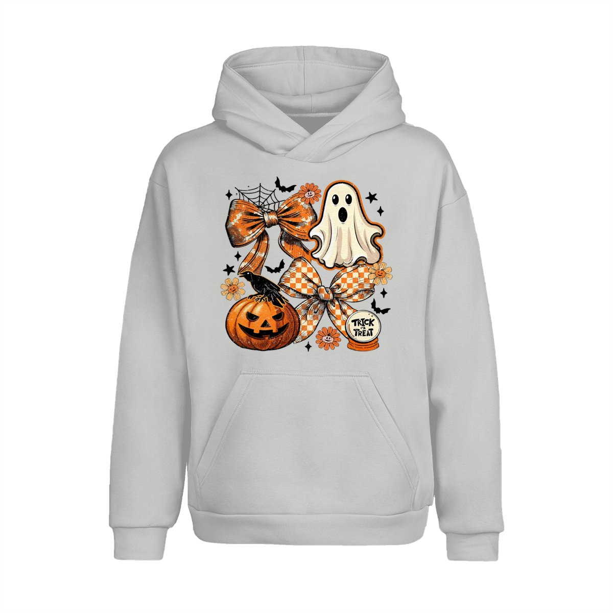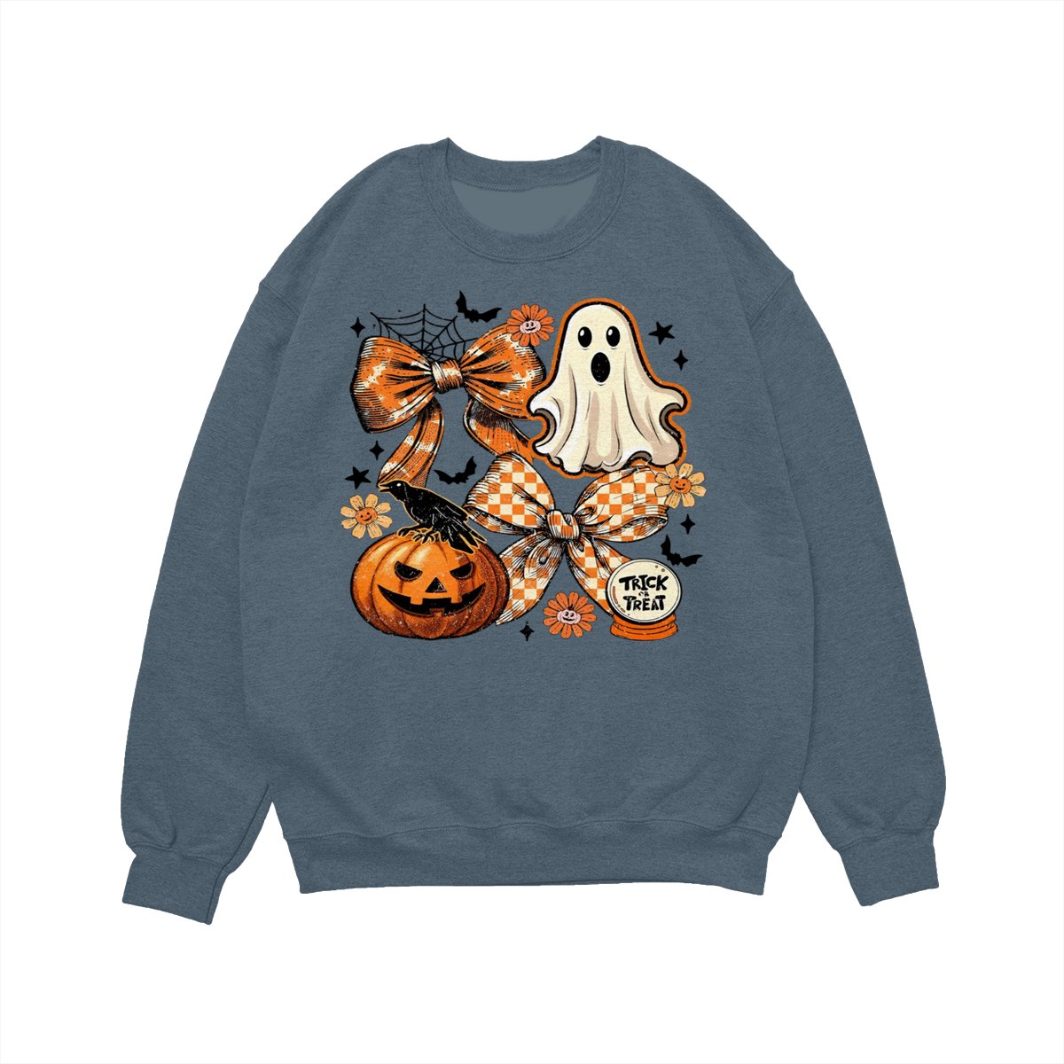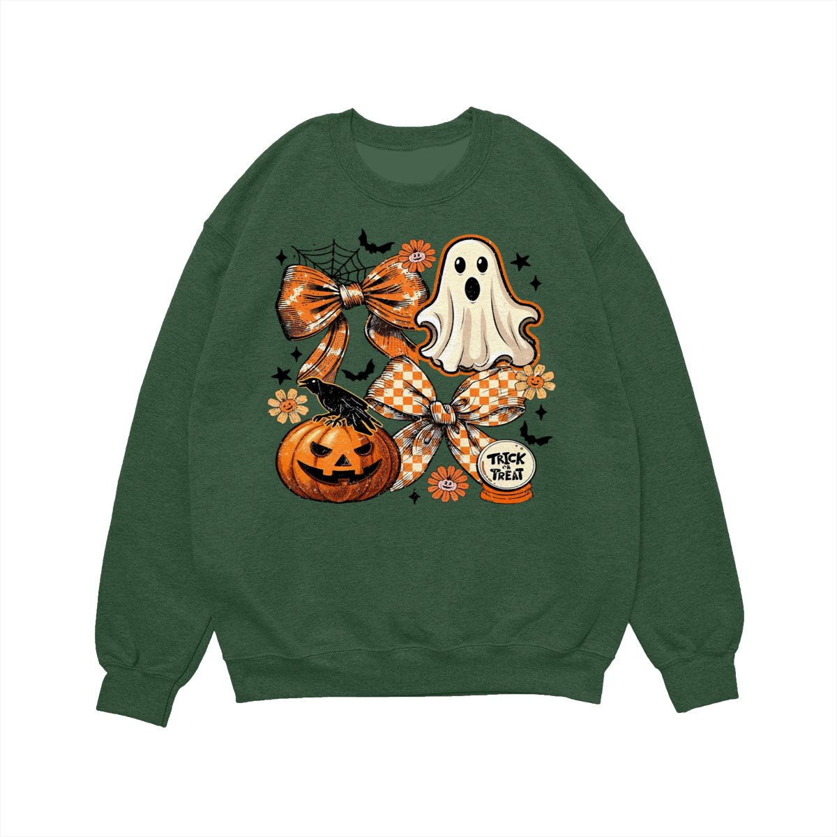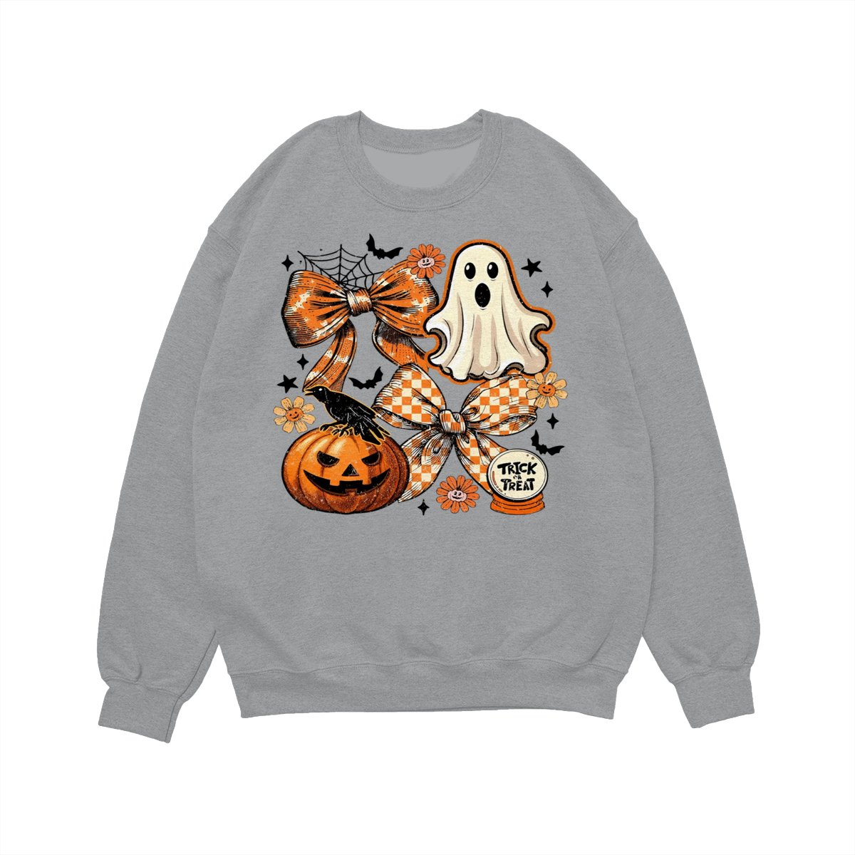 Ghost and Pumpkin Halloween Sweatshirt – Cute Fall Graphic with Bows, Trick or Treat, and Spooky Details