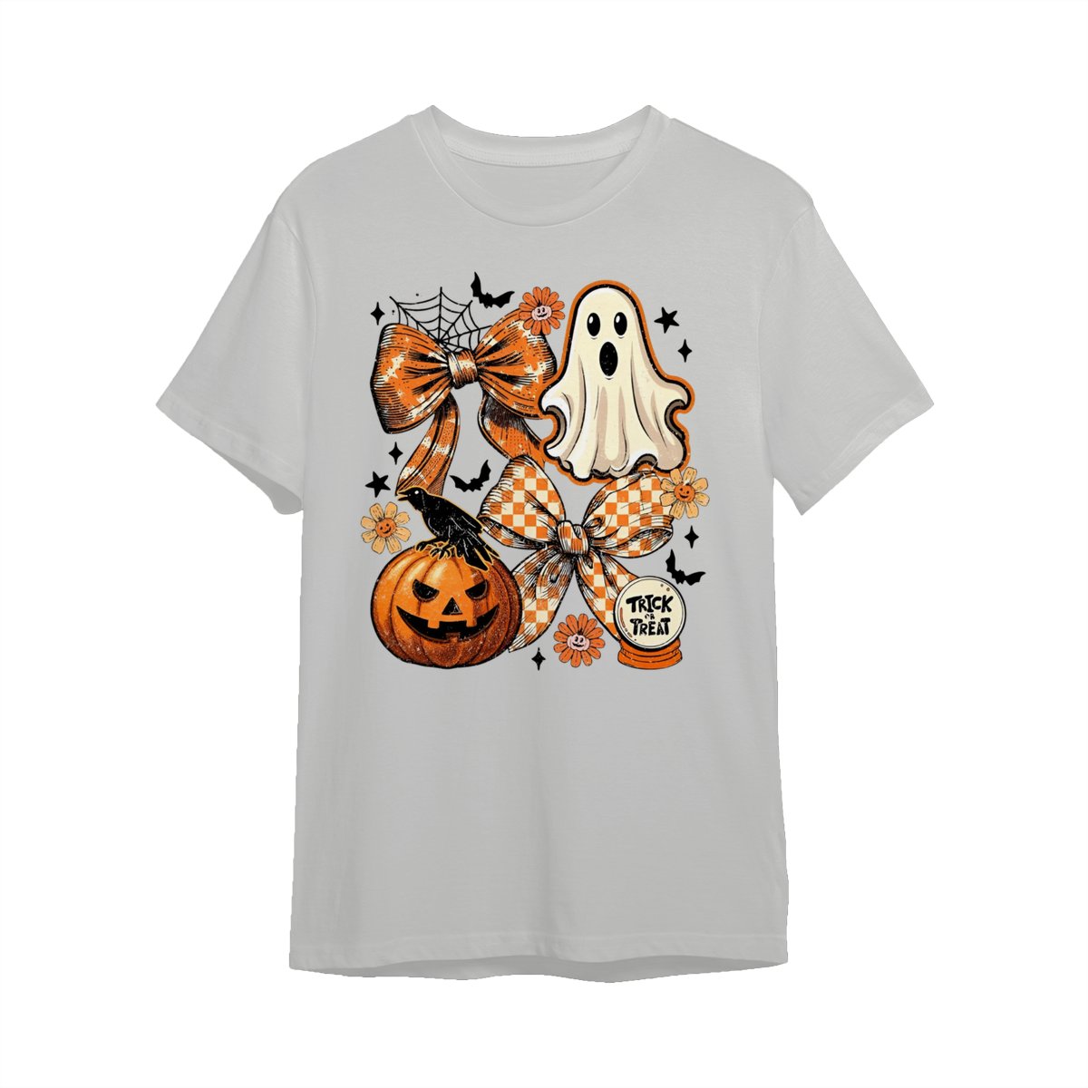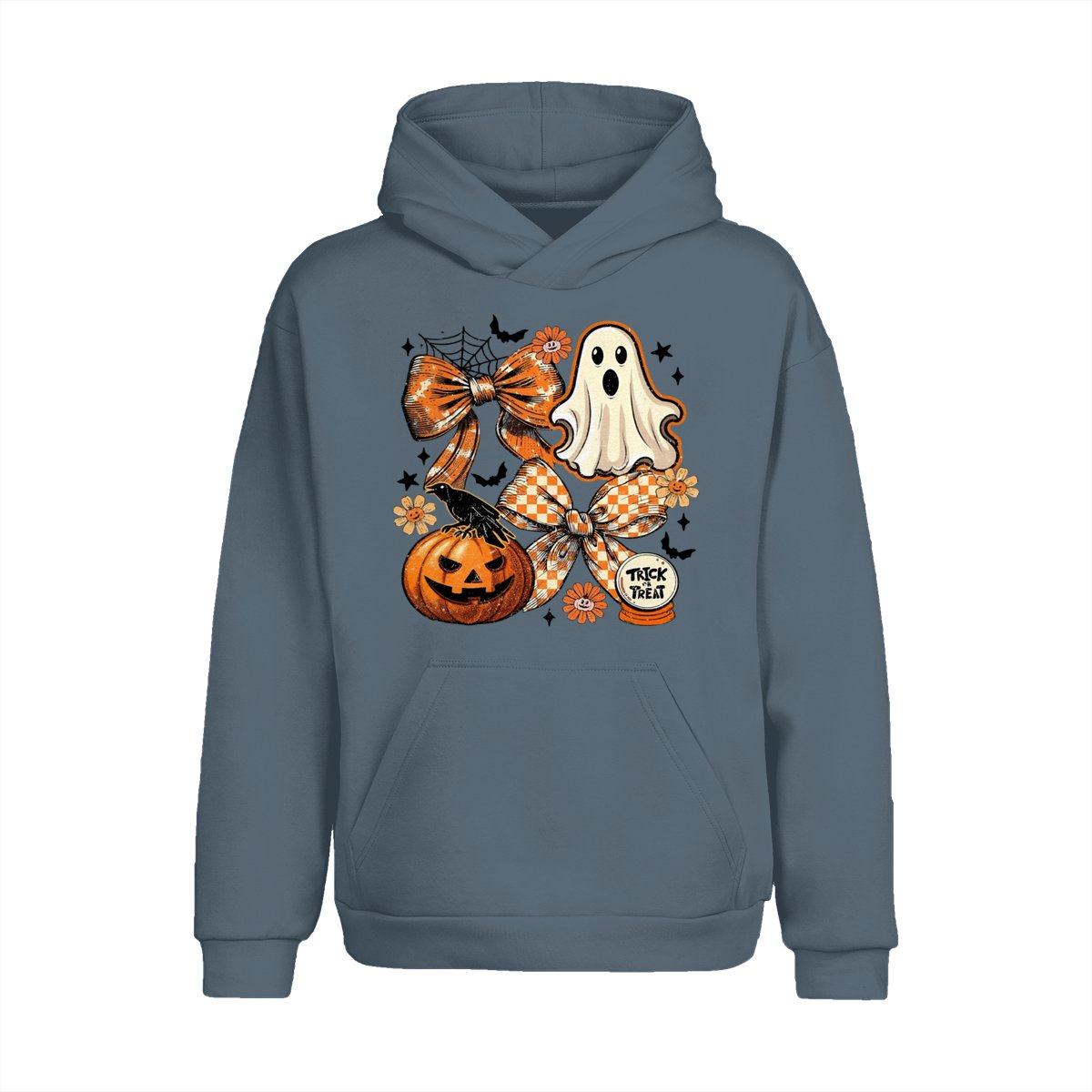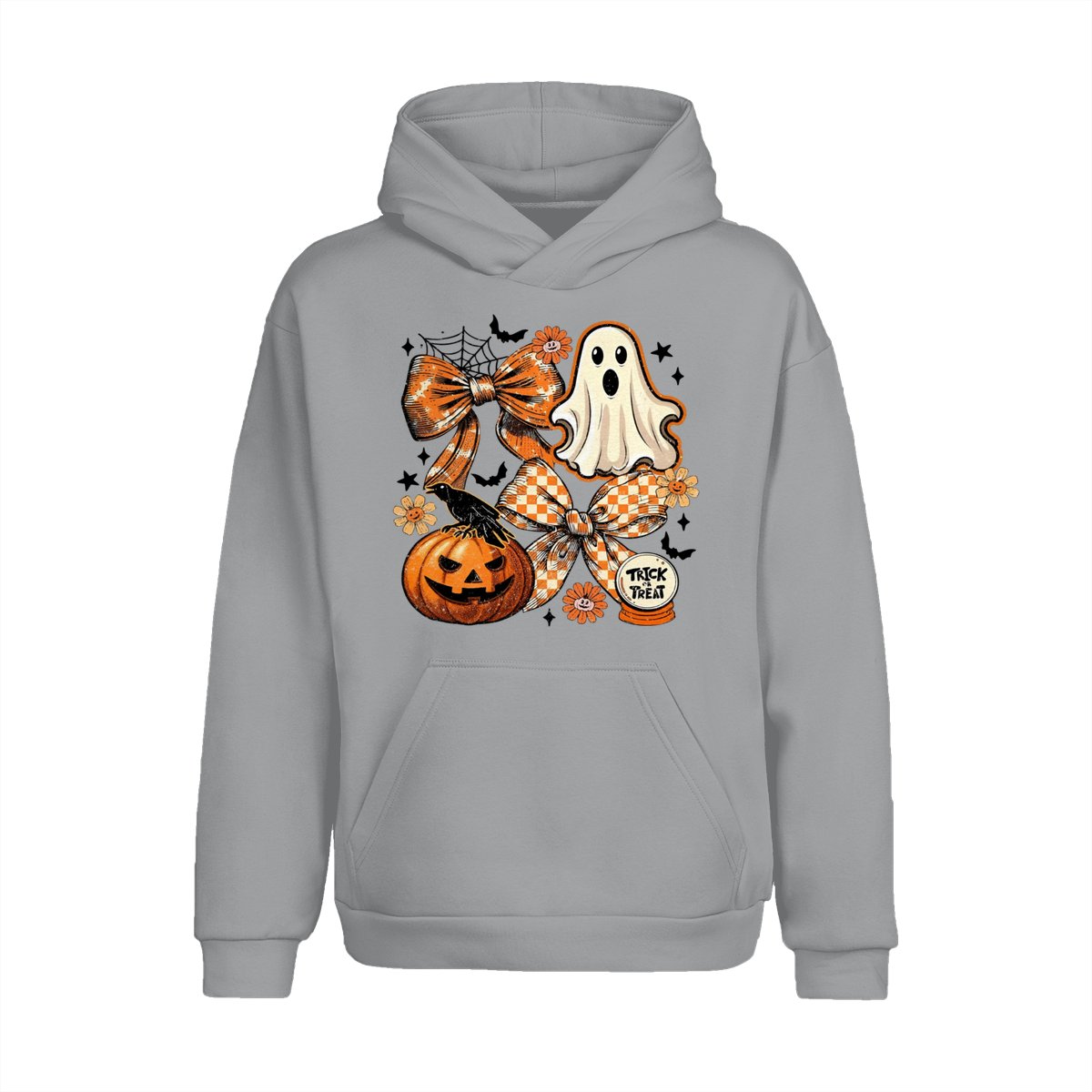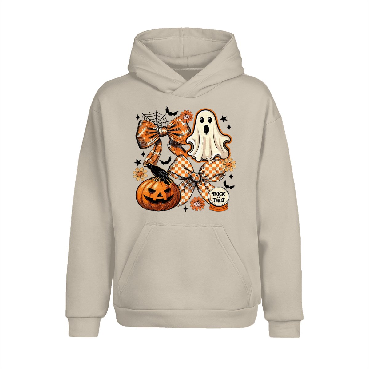 Ghost and Pumpkin Halloween Sweatshirt – Cute Fall Graphic with Bows, Trick or Treat, and Spooky Details
