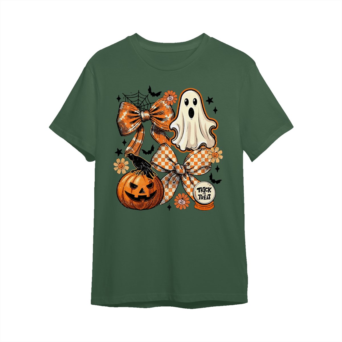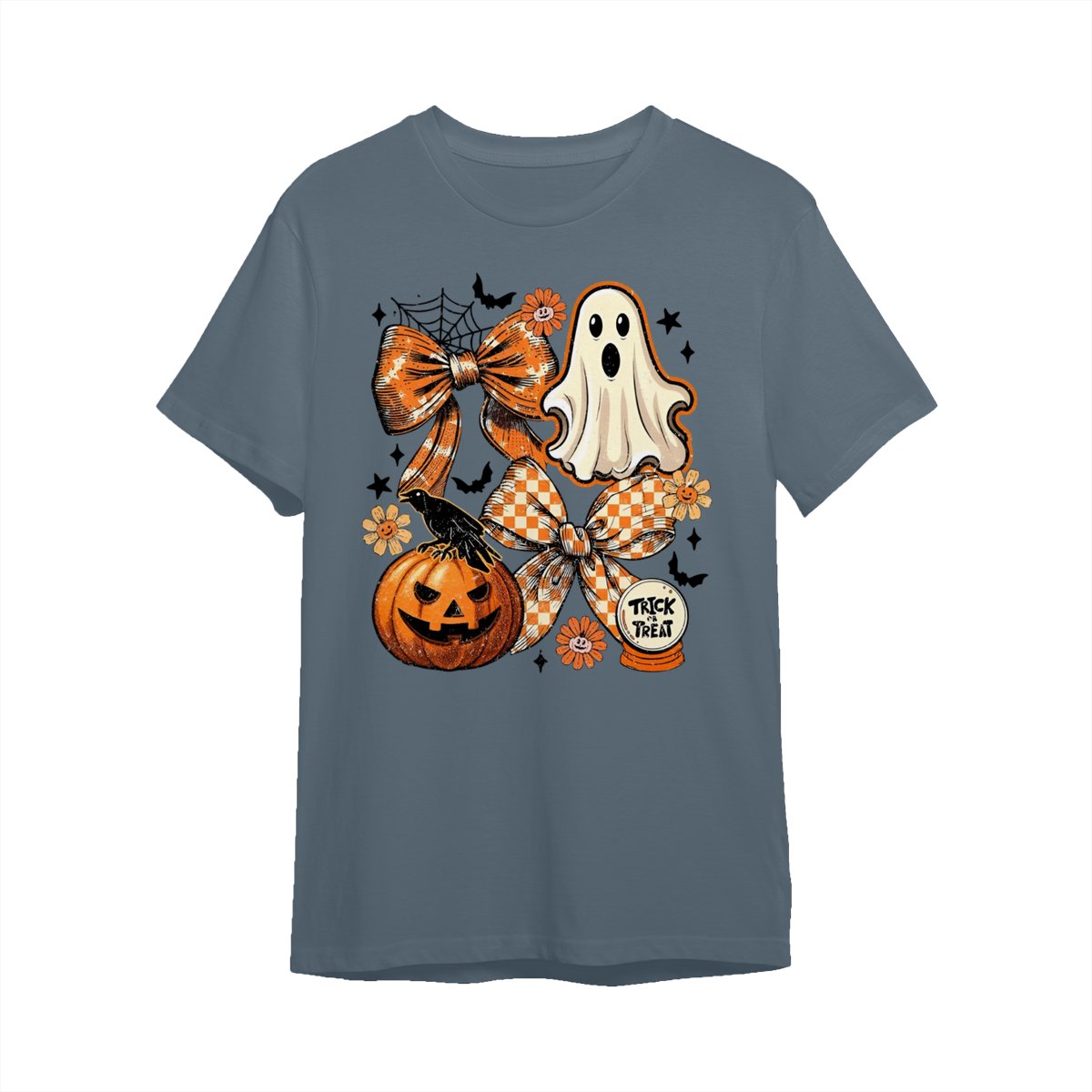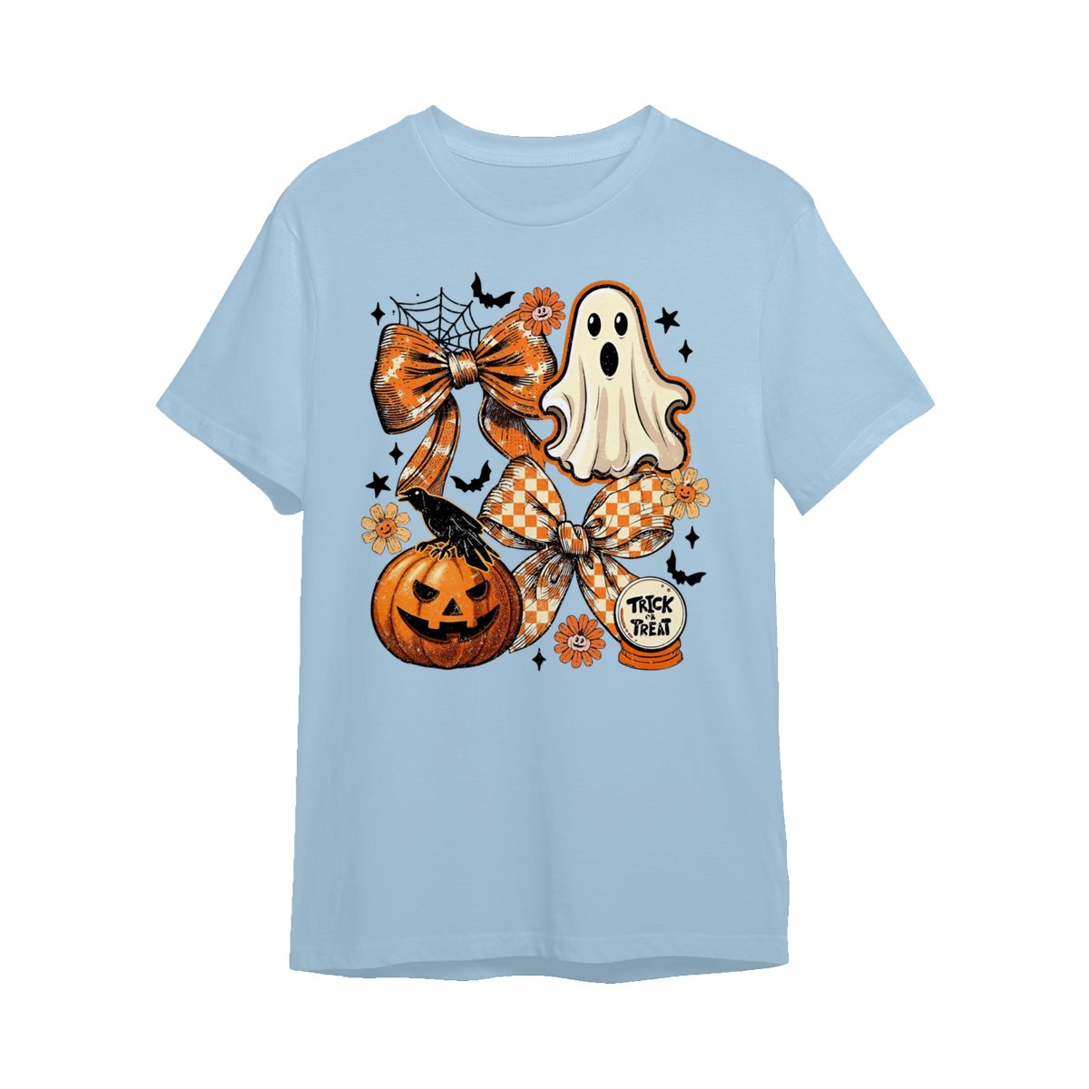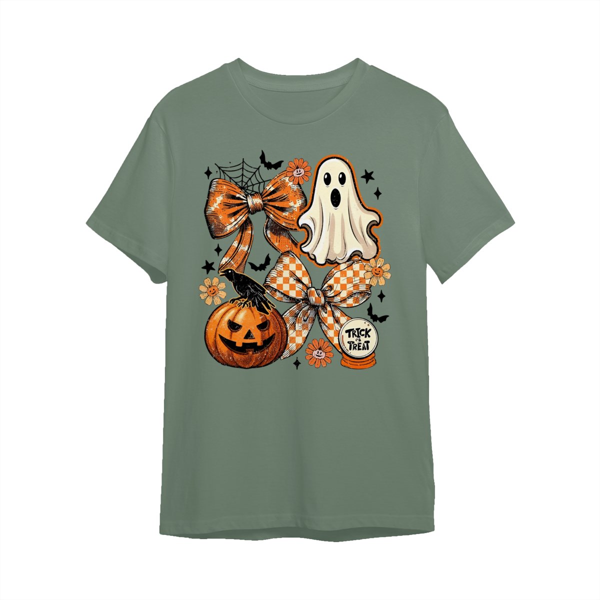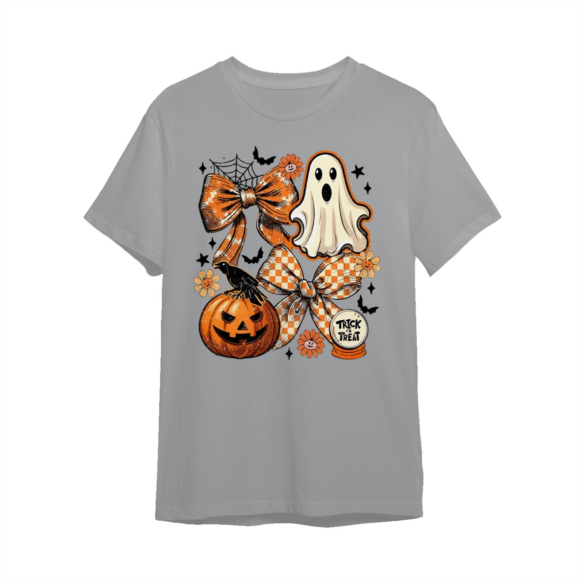 Ghost and Pumpkin Halloween Sweatshirt – Cute Fall Graphic with Bows, Trick or Treat, and Spooky Details
