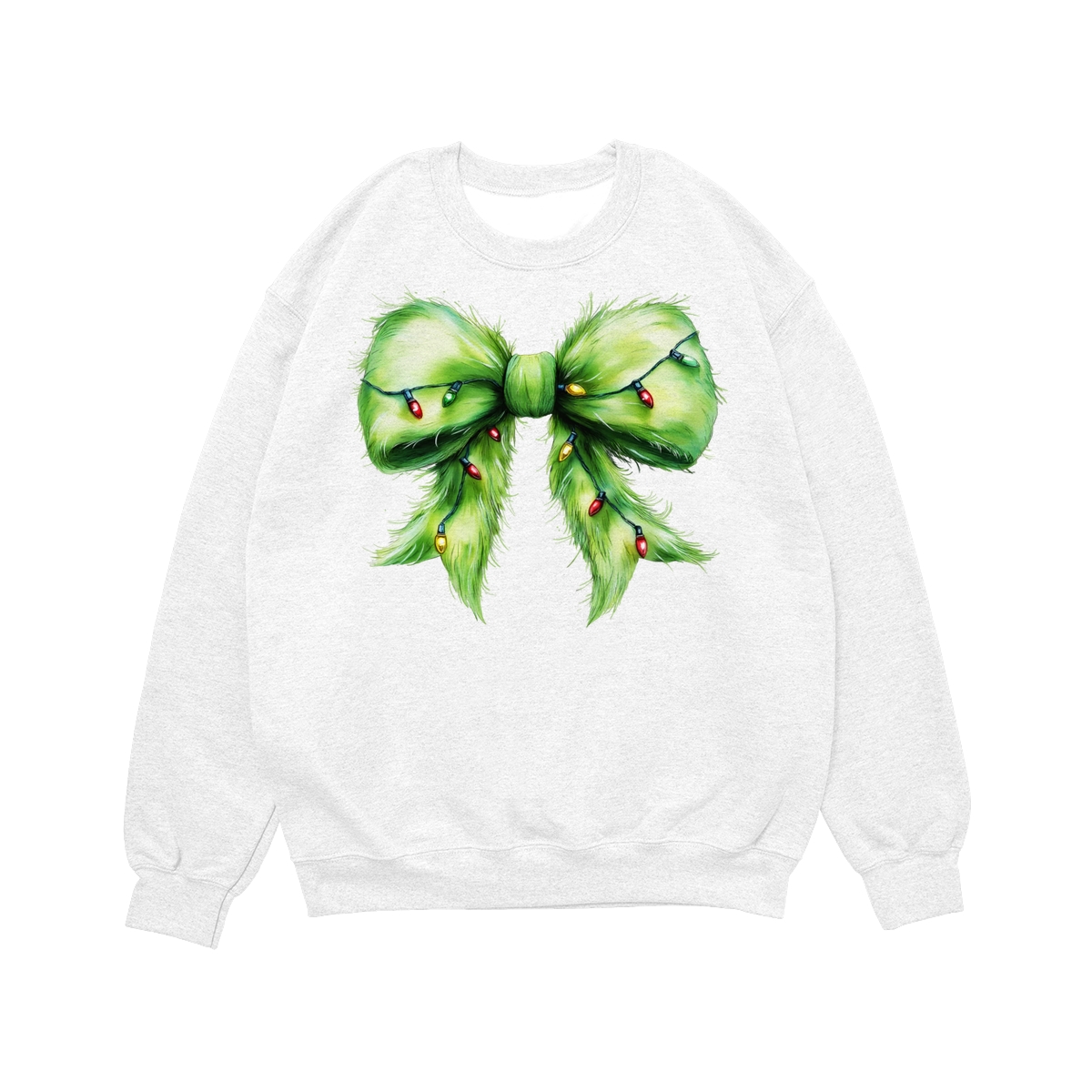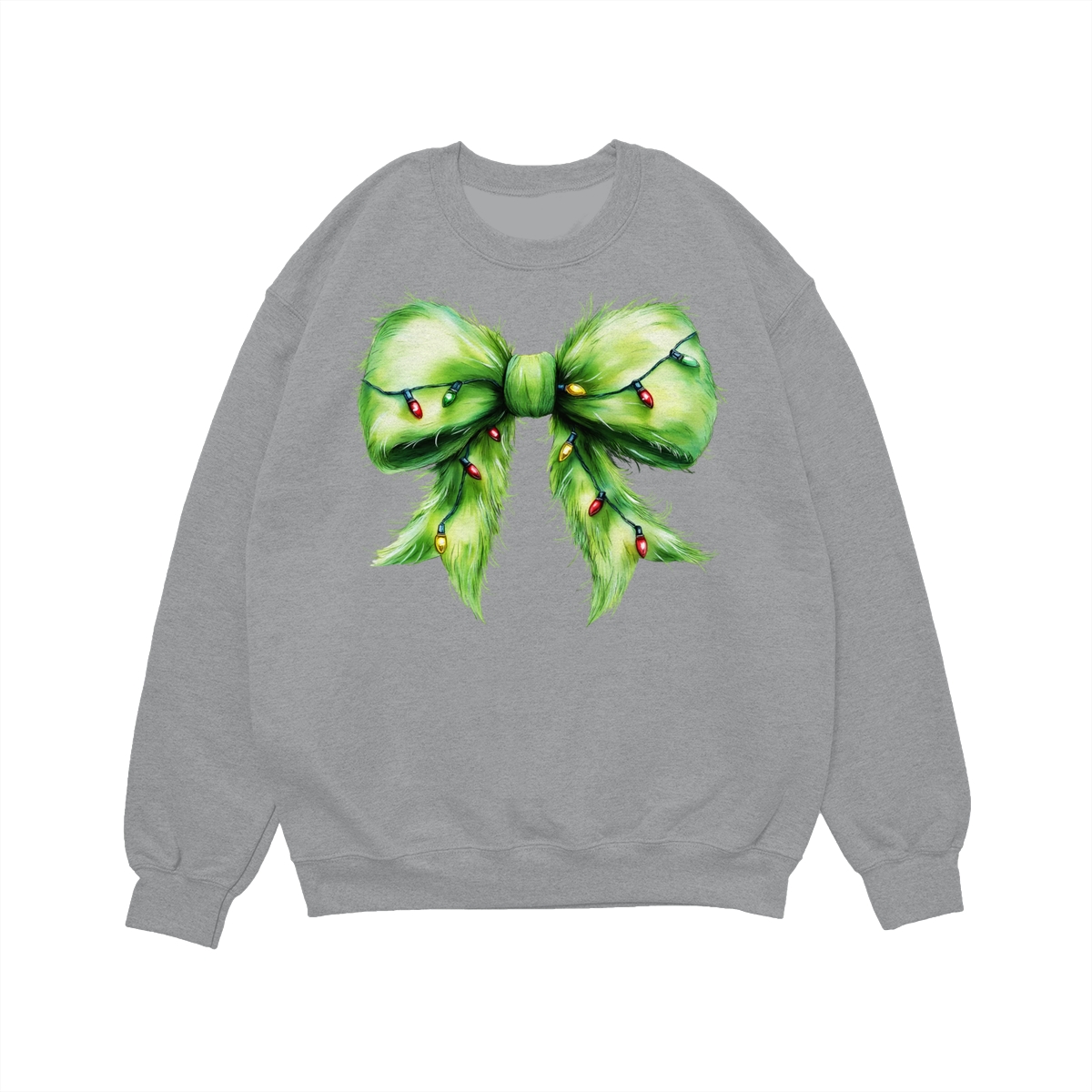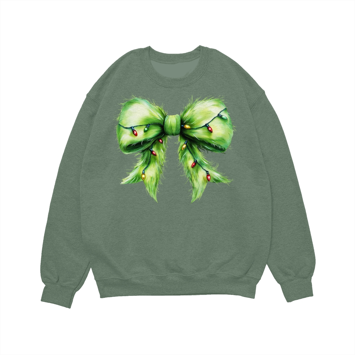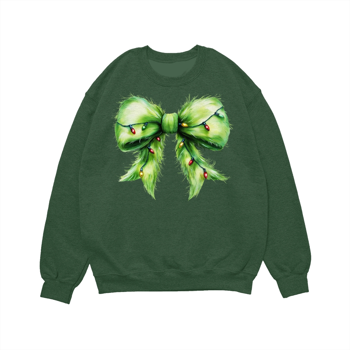 Grinchmas Coquette Bow Sweatshirt, Green Fur Christmas Lights Bow Retro Christmas Womenswear Fit Printed Tops
