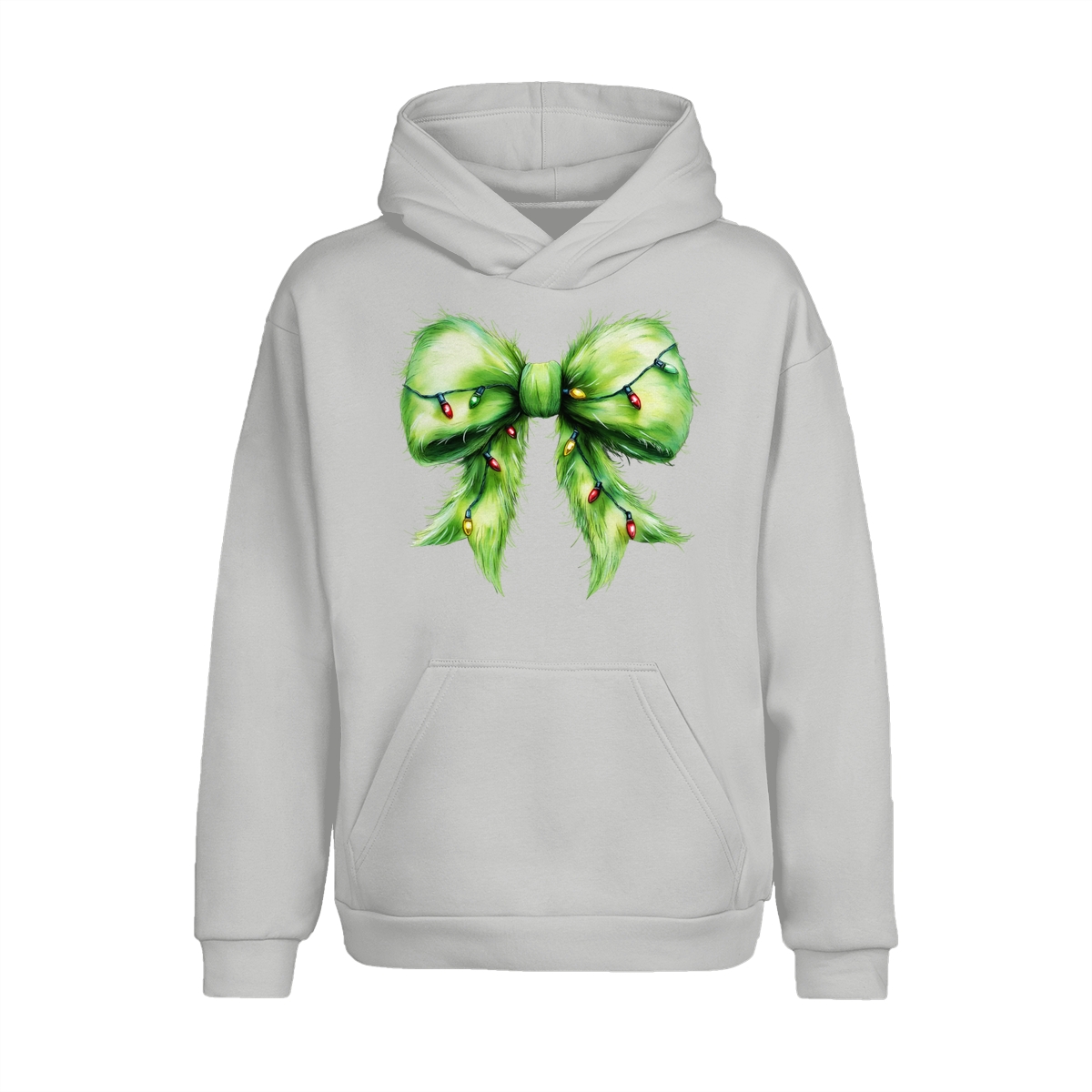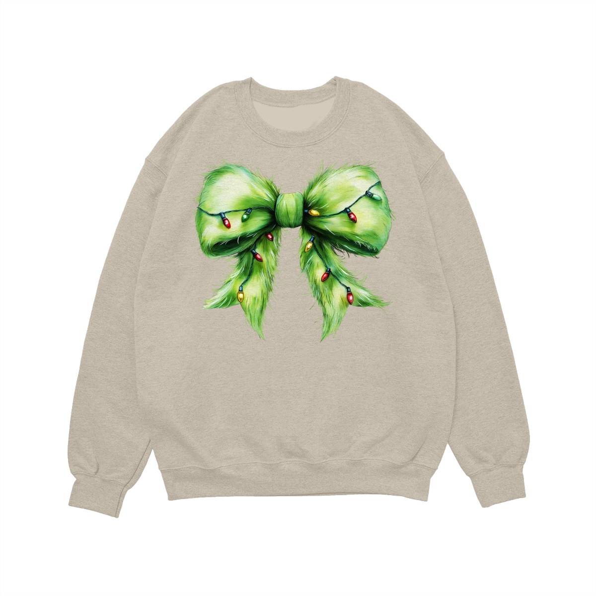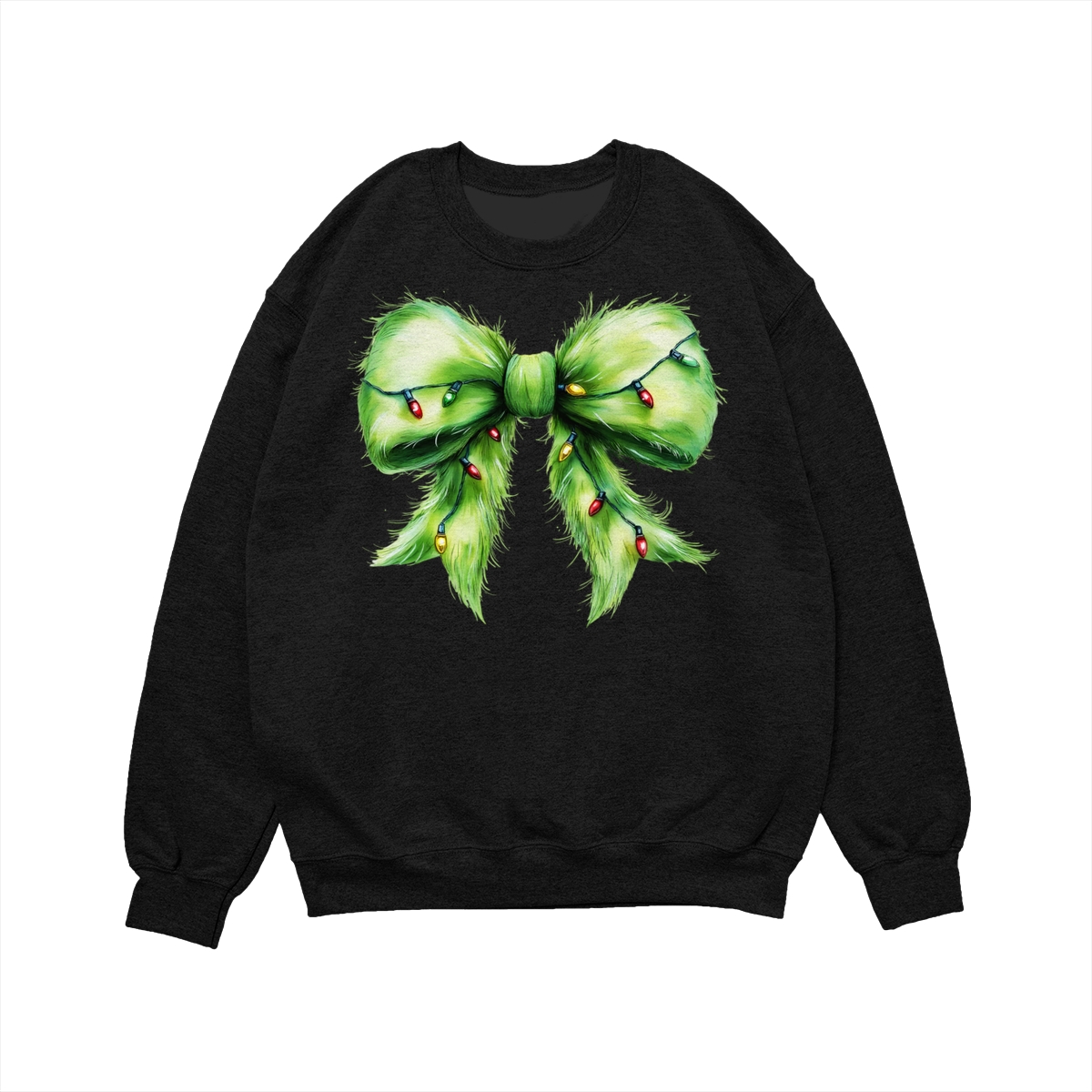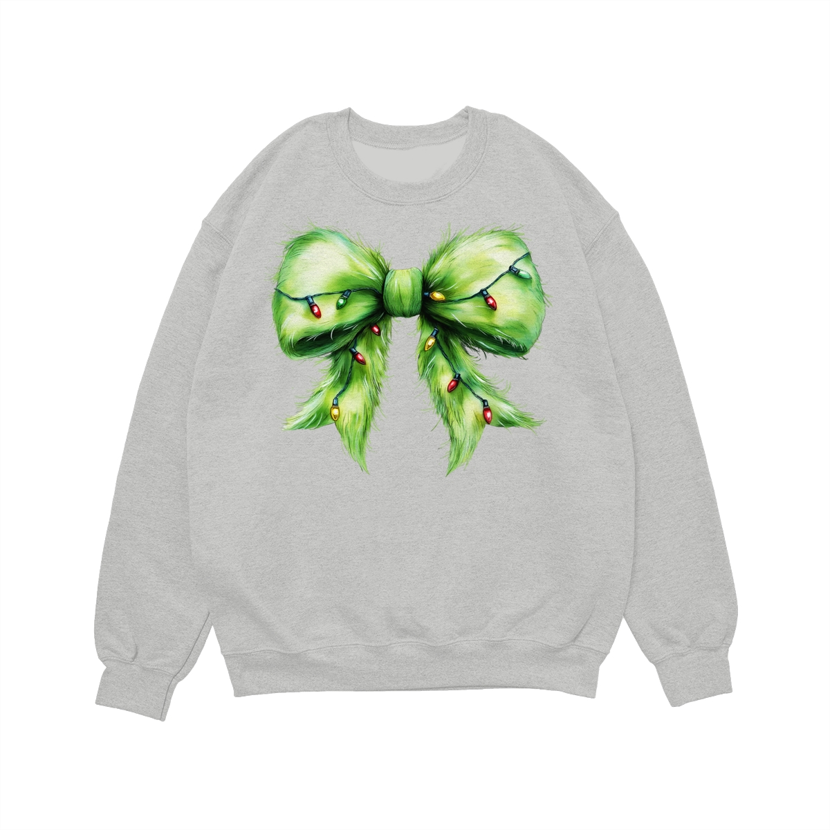 Grinchmas Coquette Bow Sweatshirt, Green Fur Christmas Lights Bow Retro Christmas Womenswear Fit Printed Tops