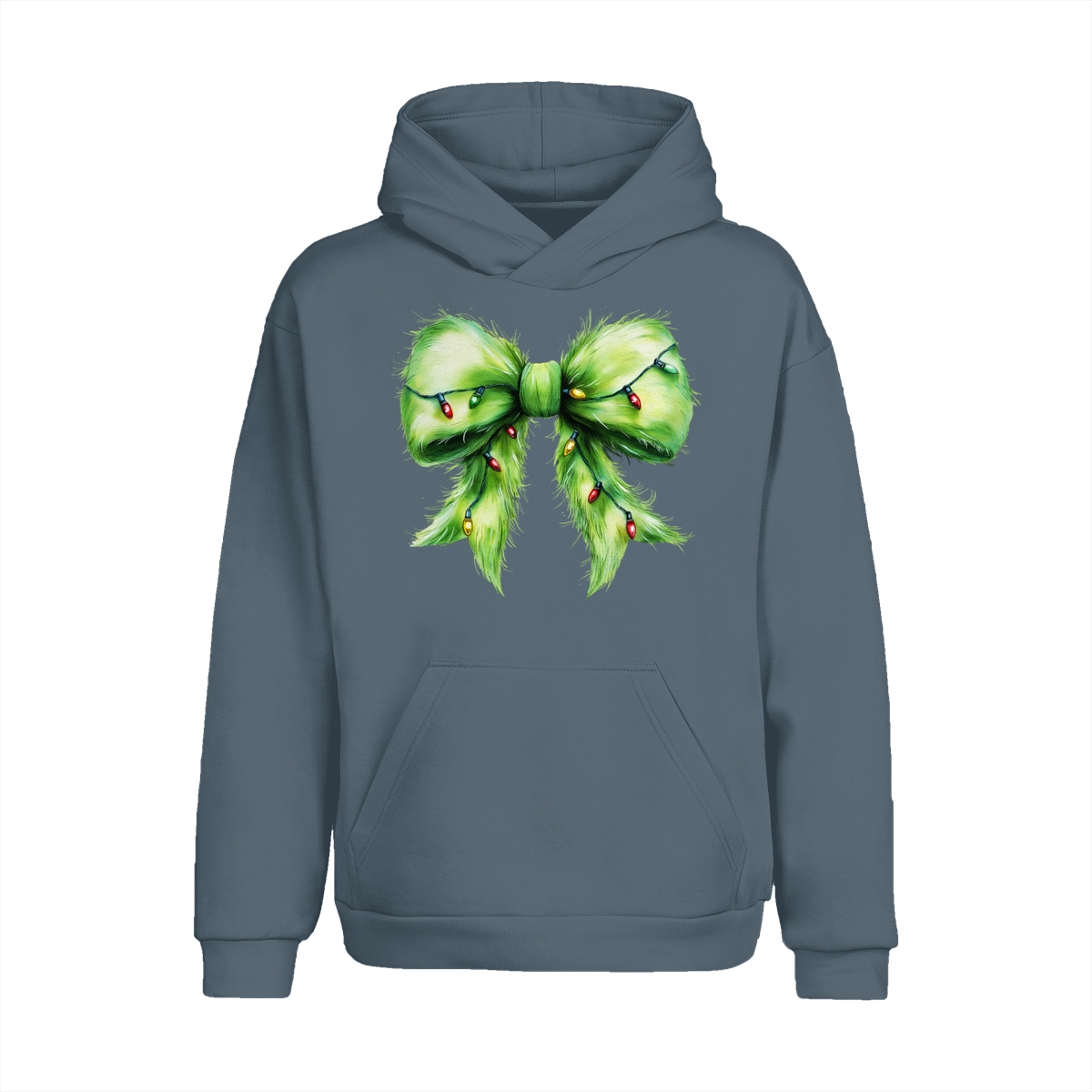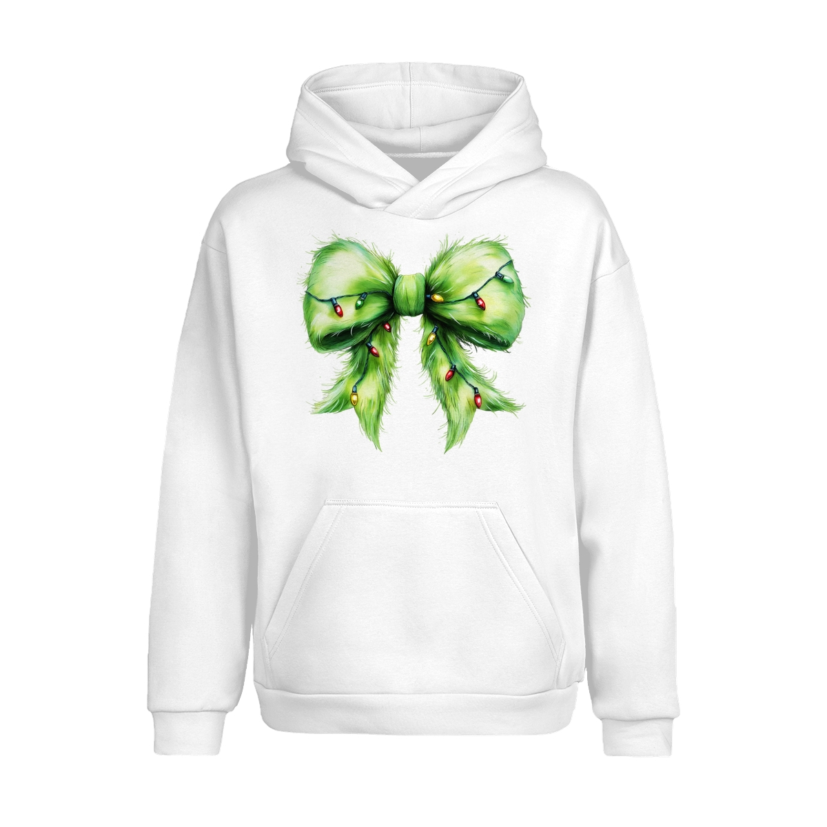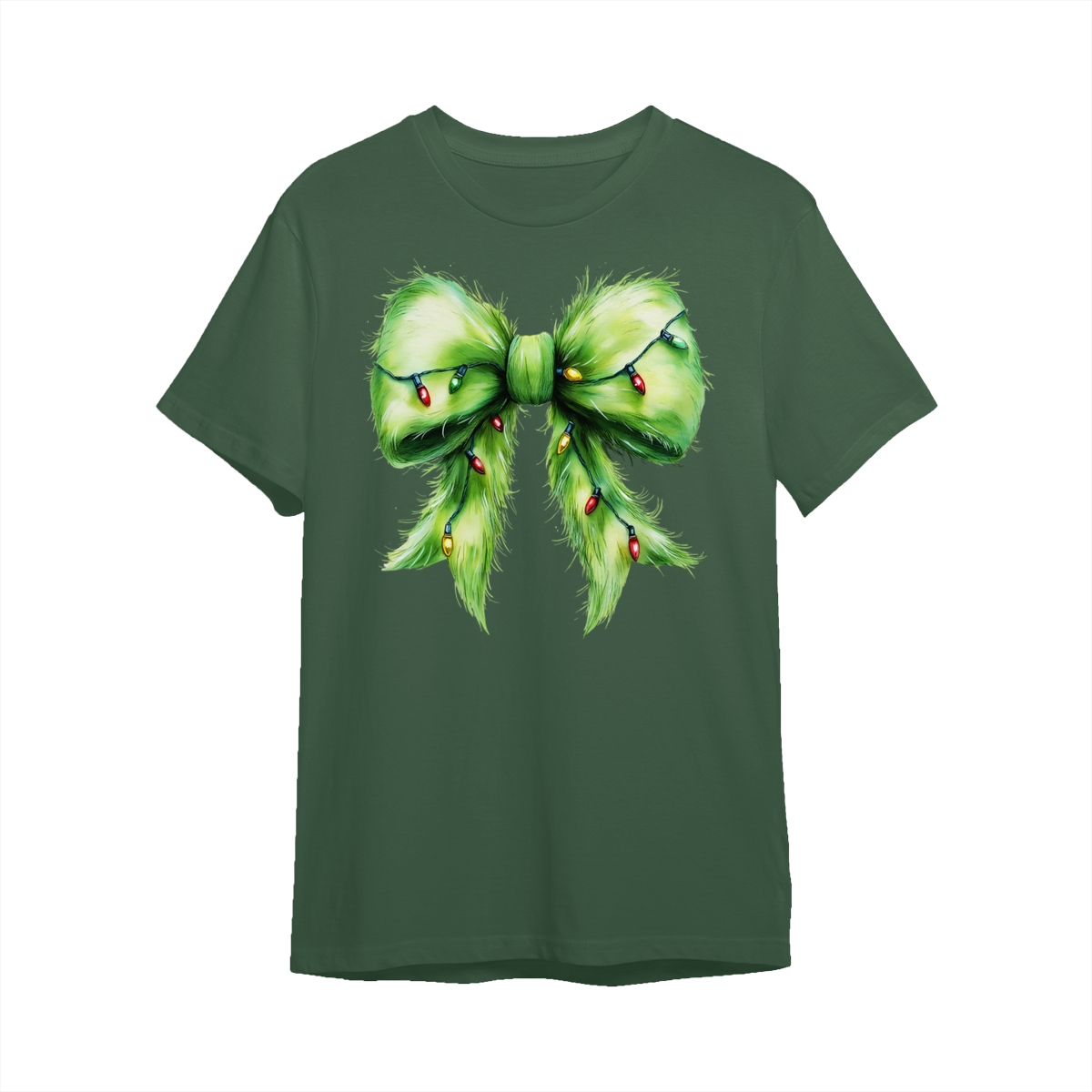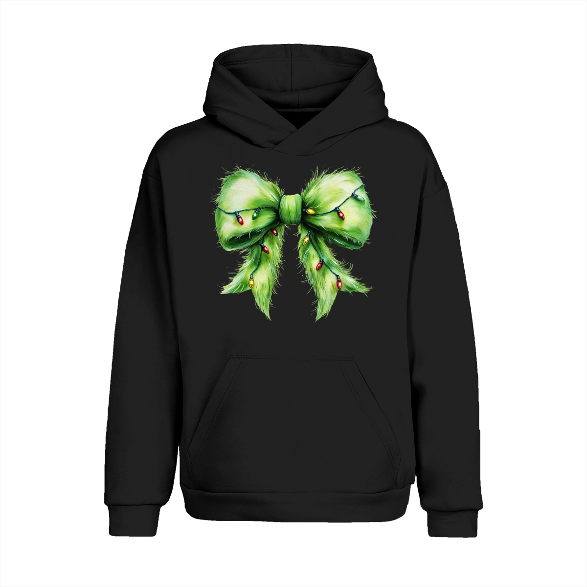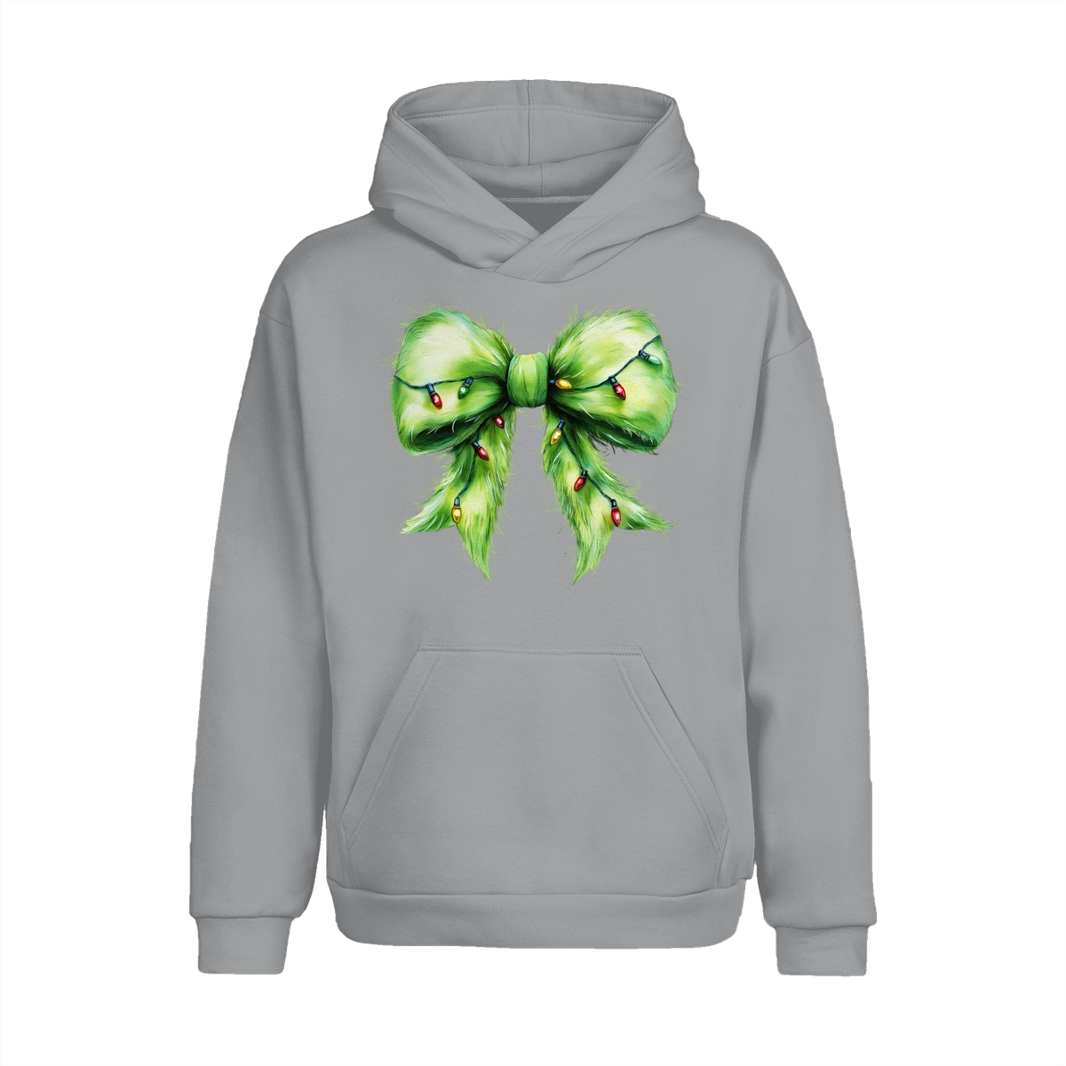 Grinchmas Coquette Bow Sweatshirt, Green Fur Christmas Lights Bow Retro Christmas Womenswear Fit Printed Tops