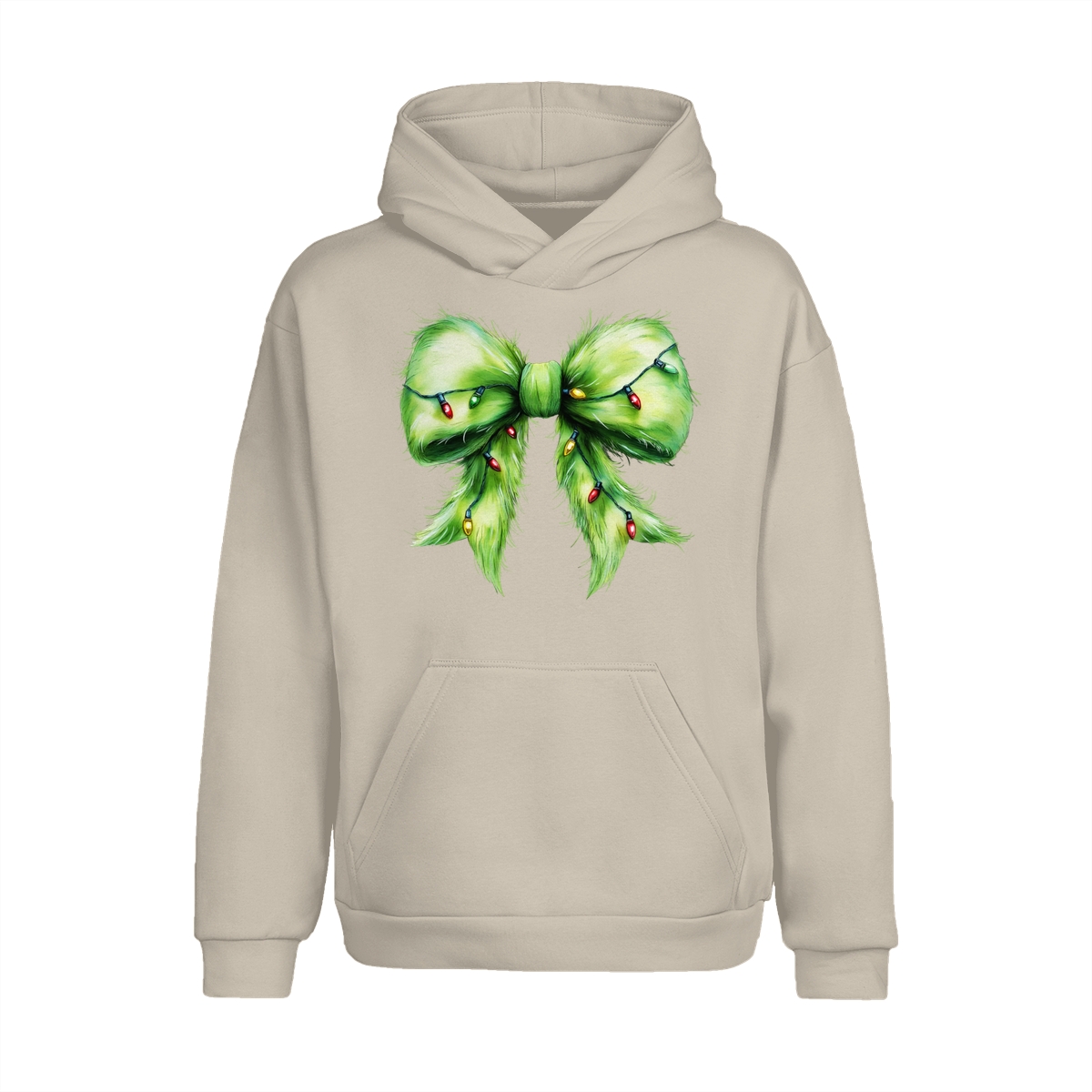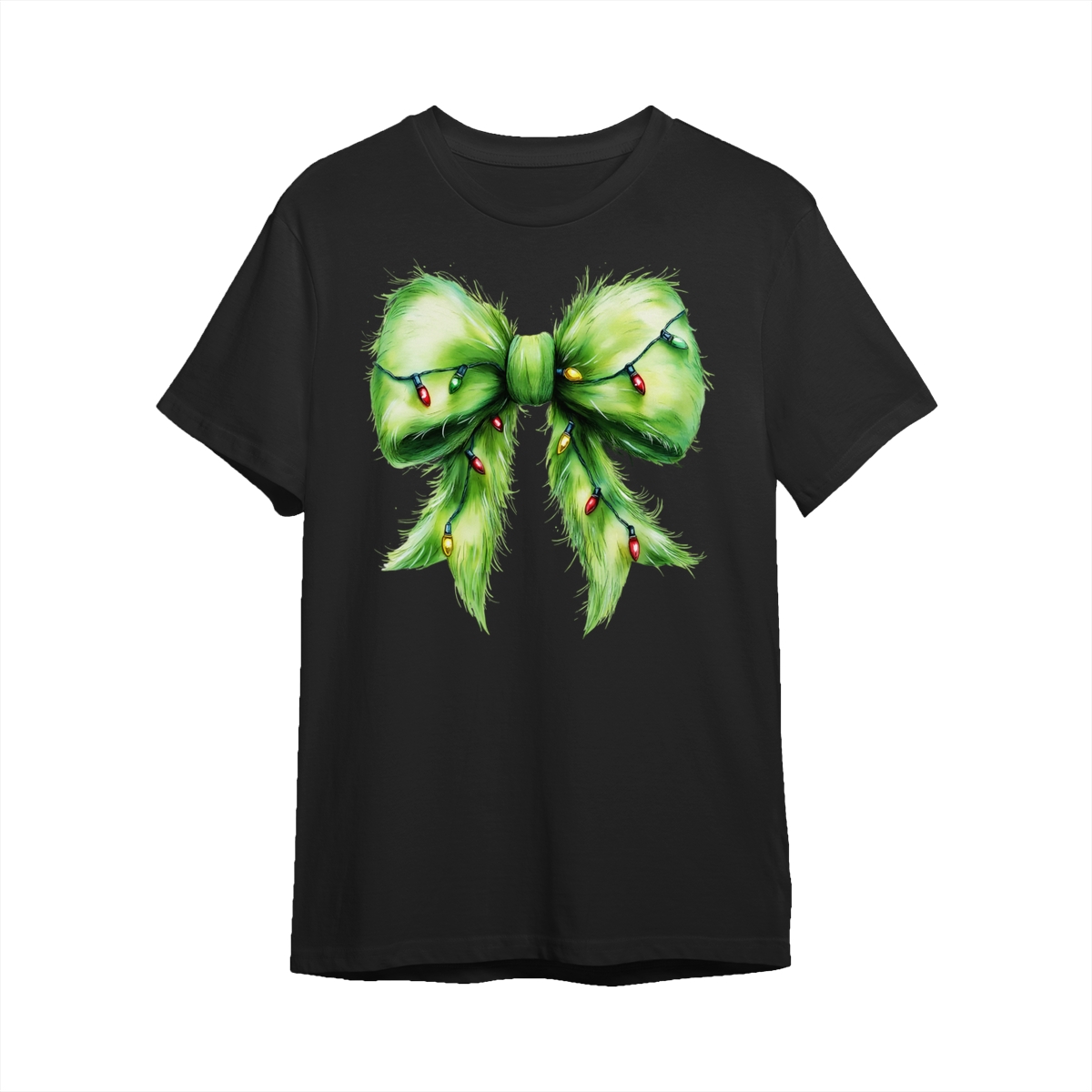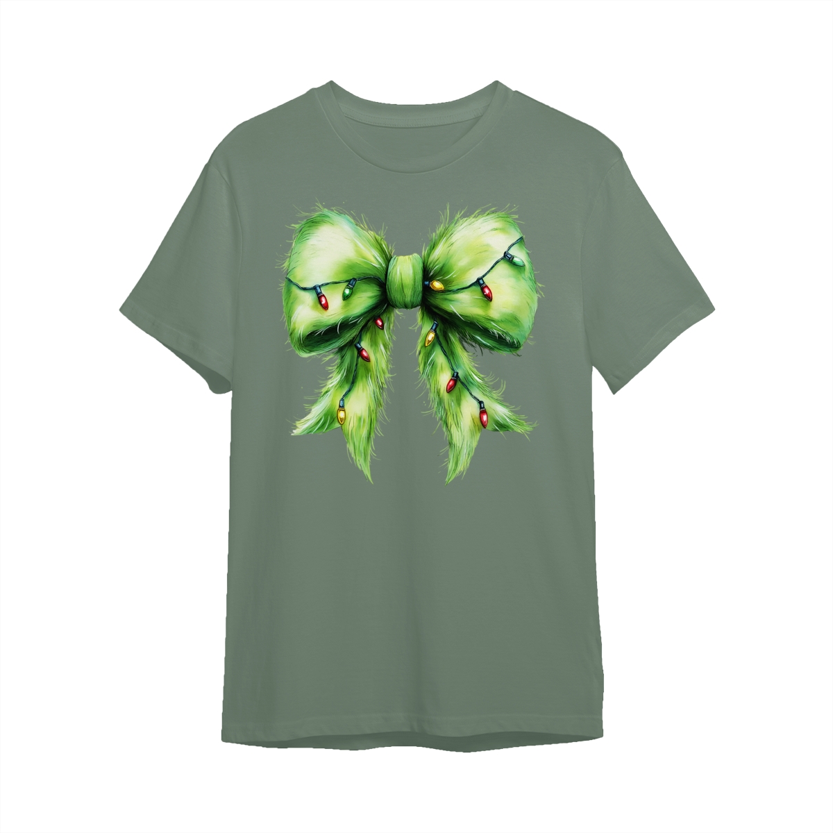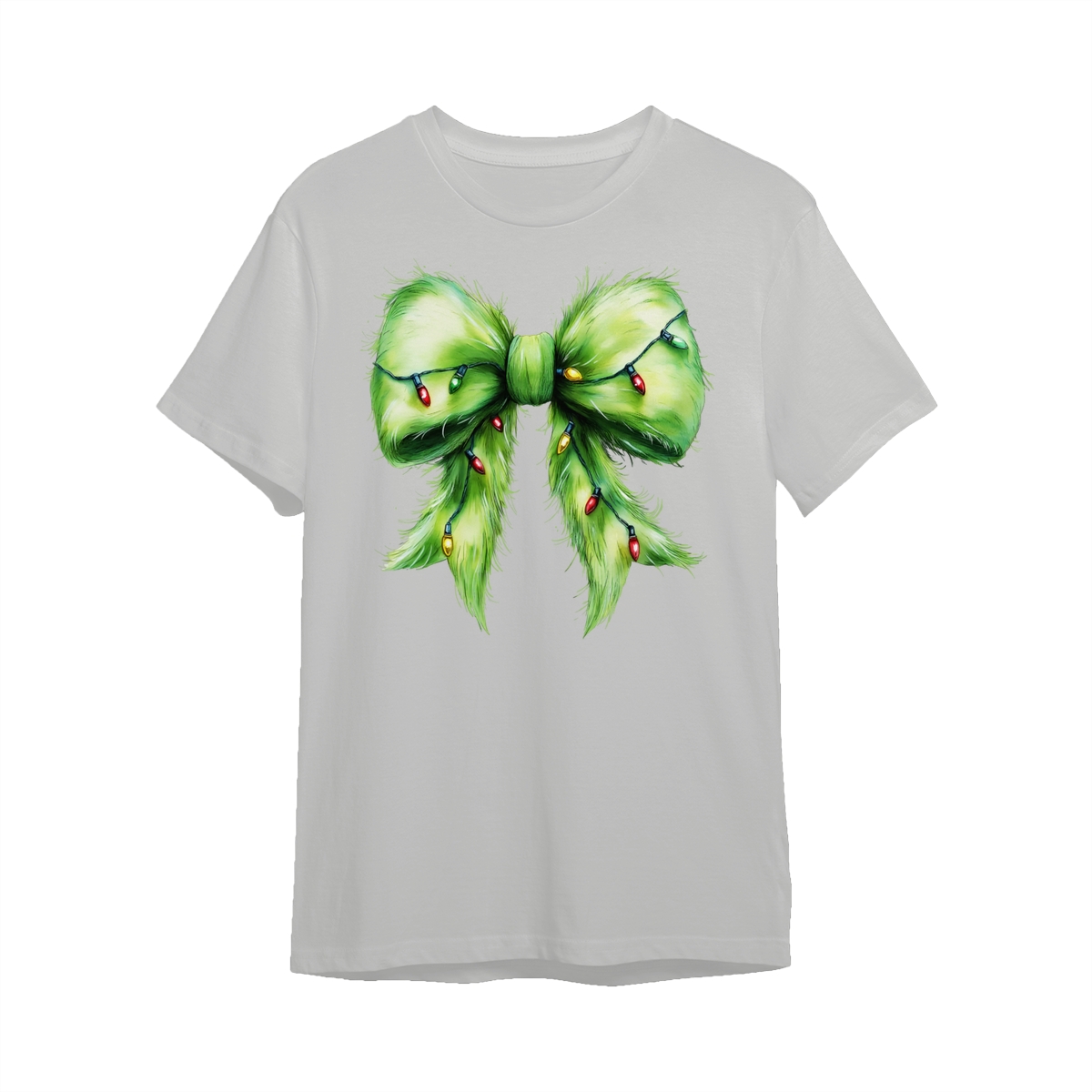 Grinchmas Coquette Bow Sweatshirt, Green Fur Christmas Lights Bow Retro Christmas Womenswear Fit Printed Tops