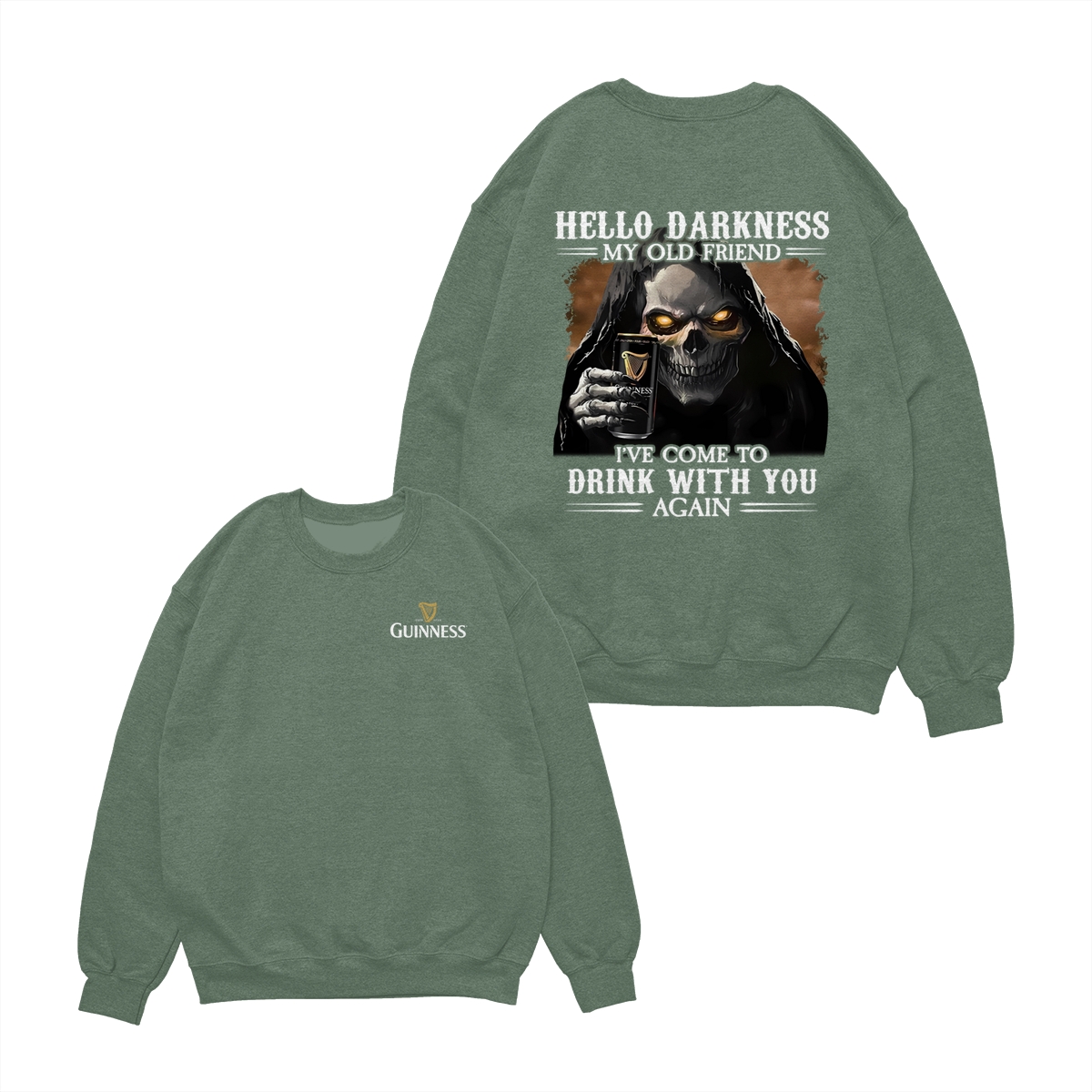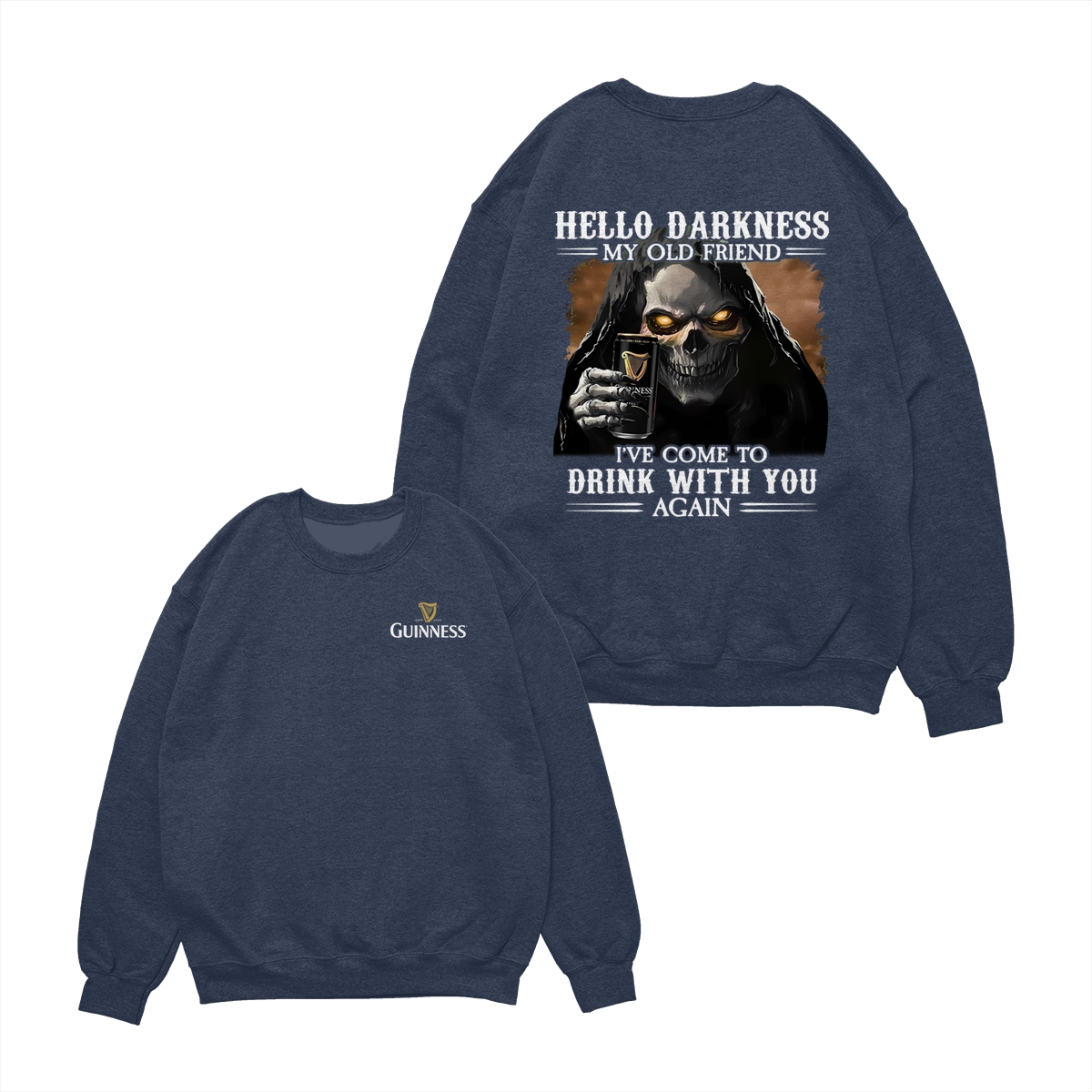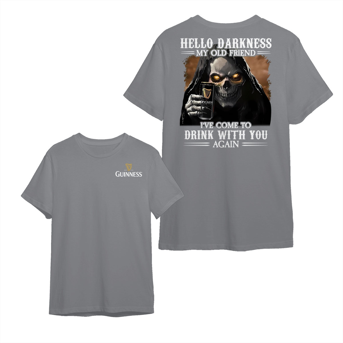Guinness Hello Darkness T-Shirt, Grim Reaper with Beer Can Graphic, Edgy Casual Style for Beer Lovers & Nightlife, Comfortable Fit & Durable Fabric Menswear Top