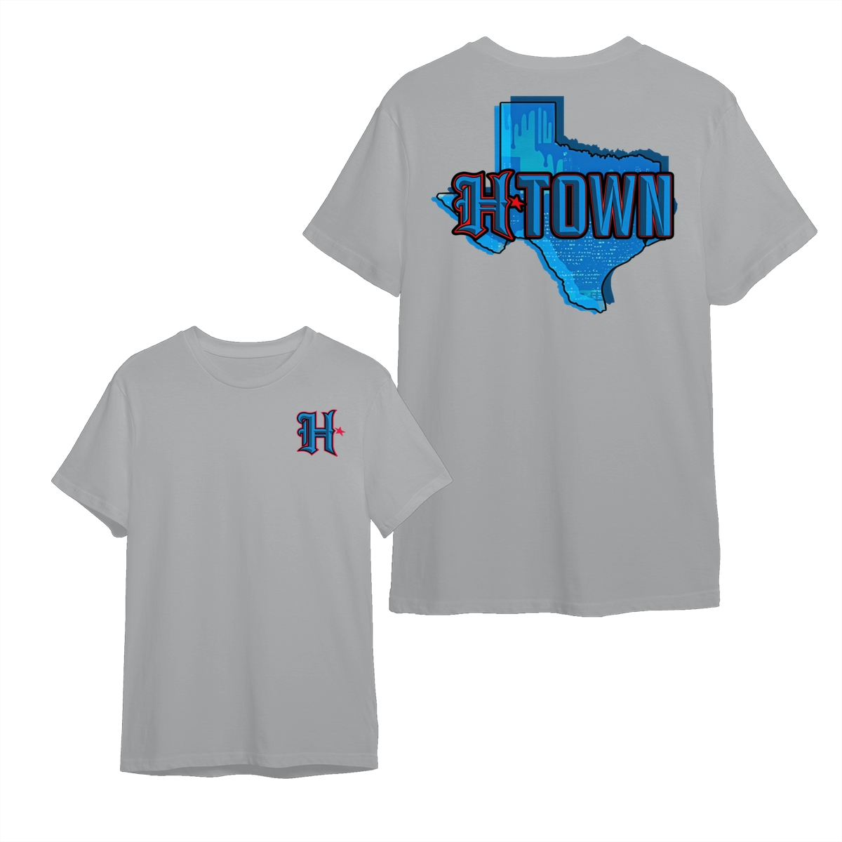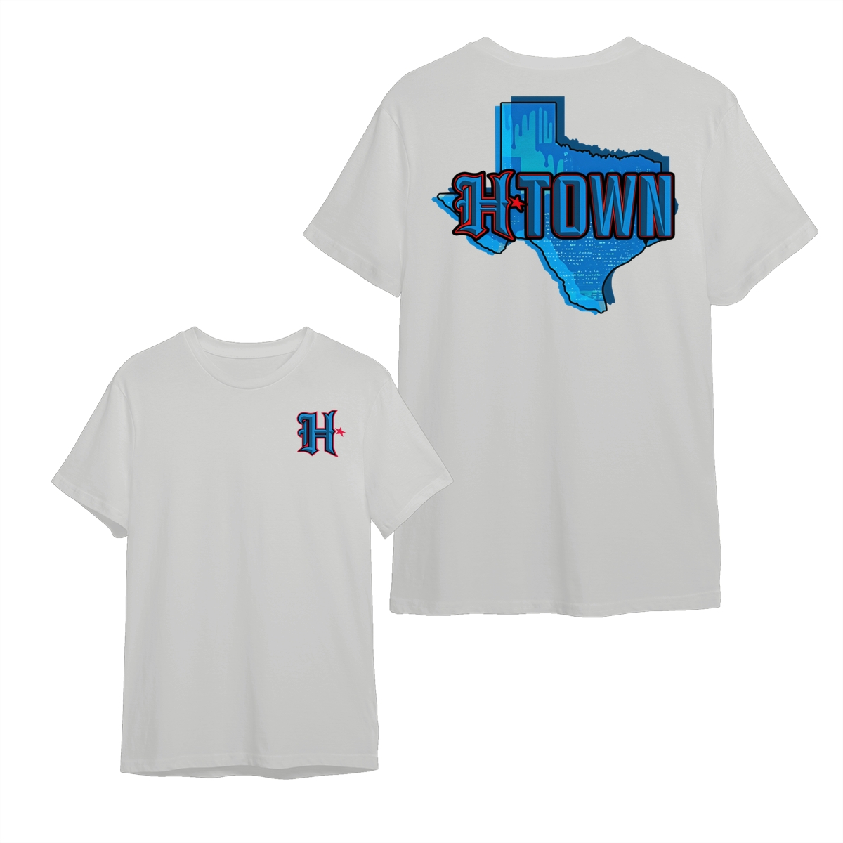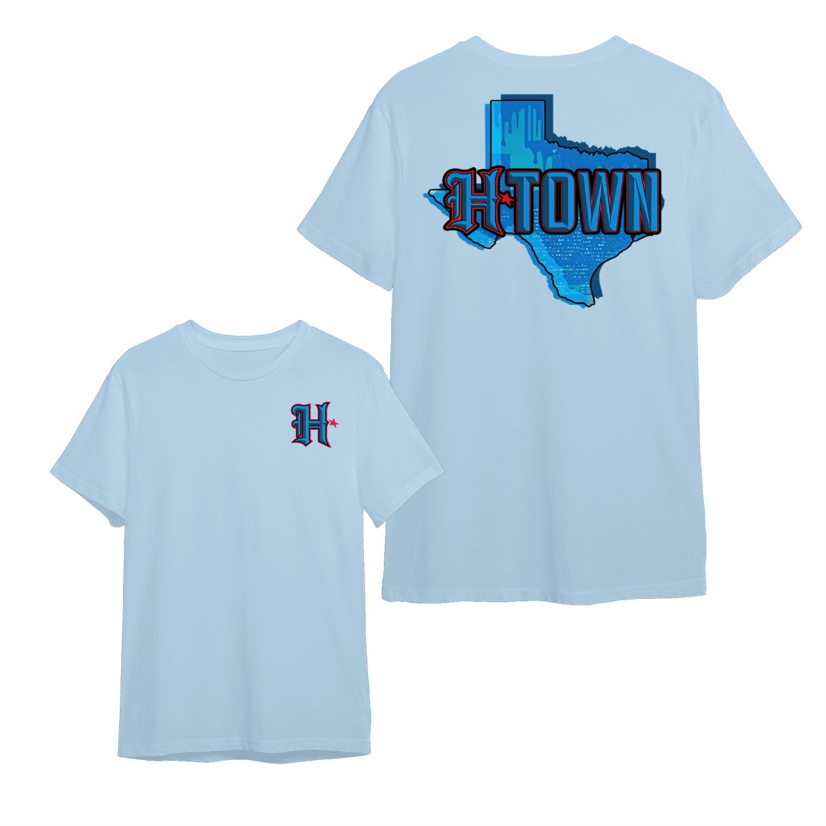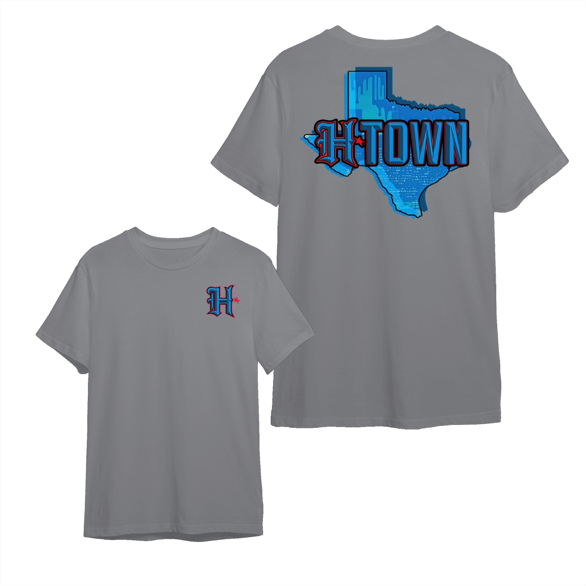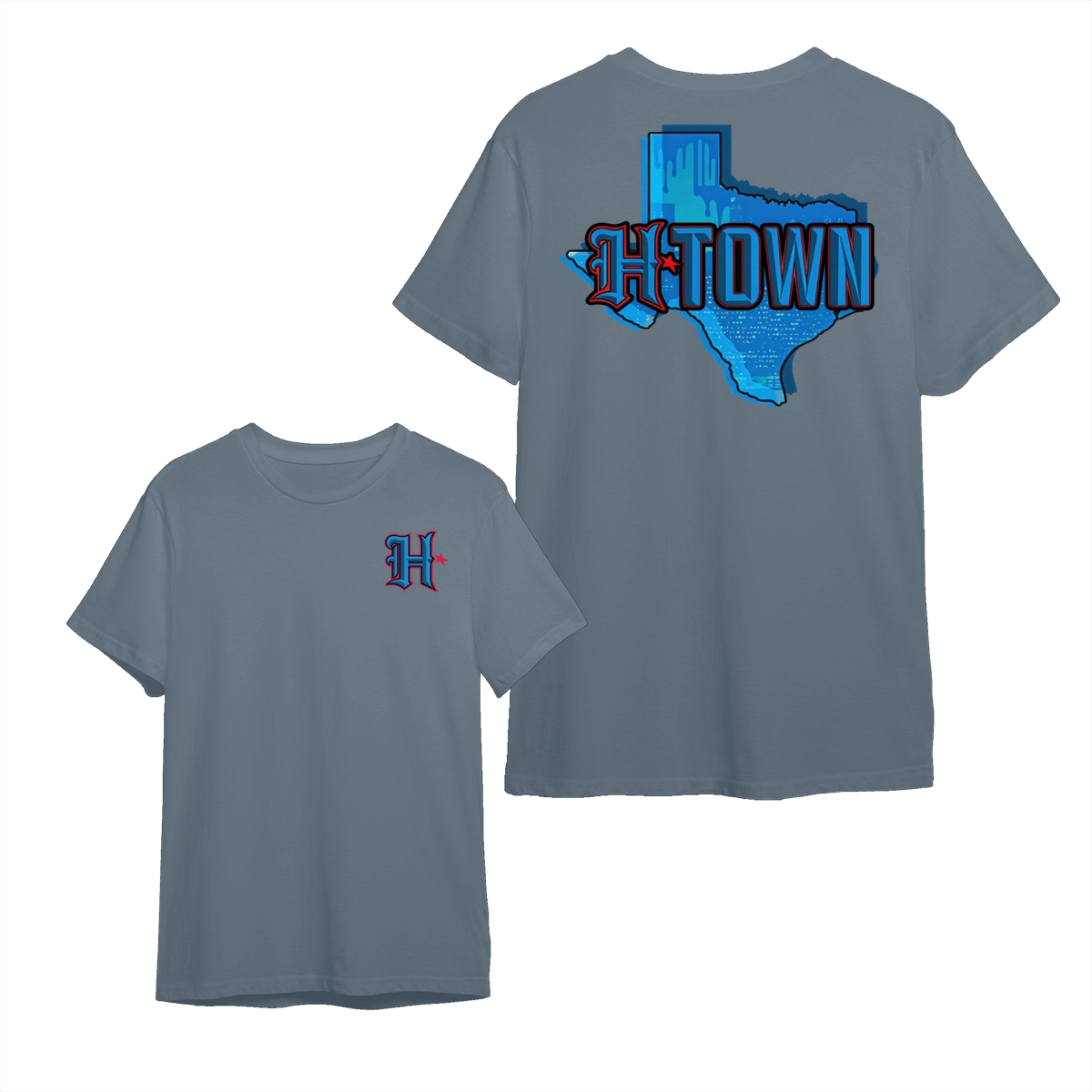 H-Town Texas Pride Men’s T-Shirt – Bold Blue State Outline Graphic Tee, Houston Street Style Tee for Men, Southern Urban Fashion Gift Idea, Trendy Top,