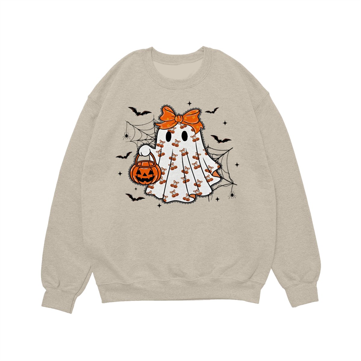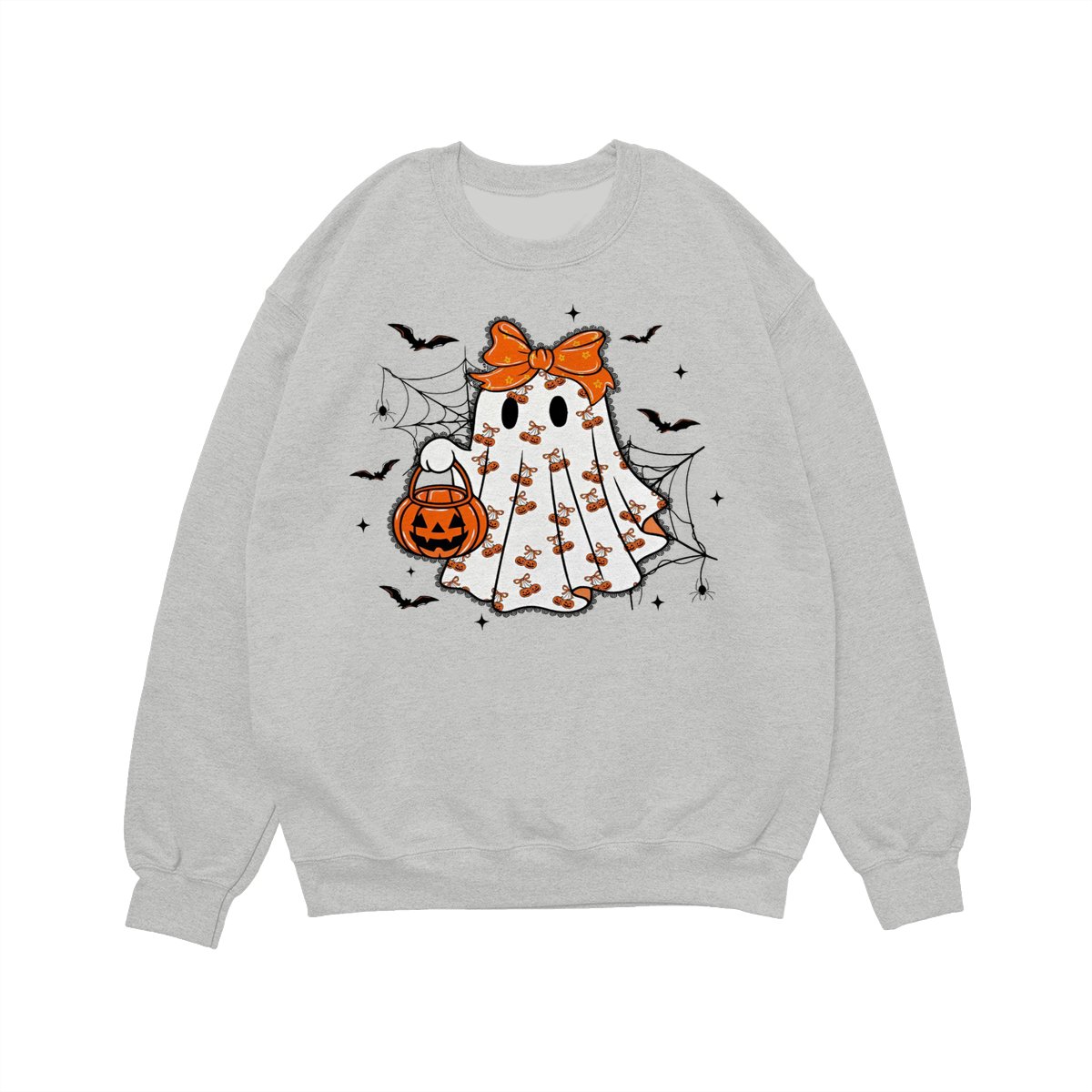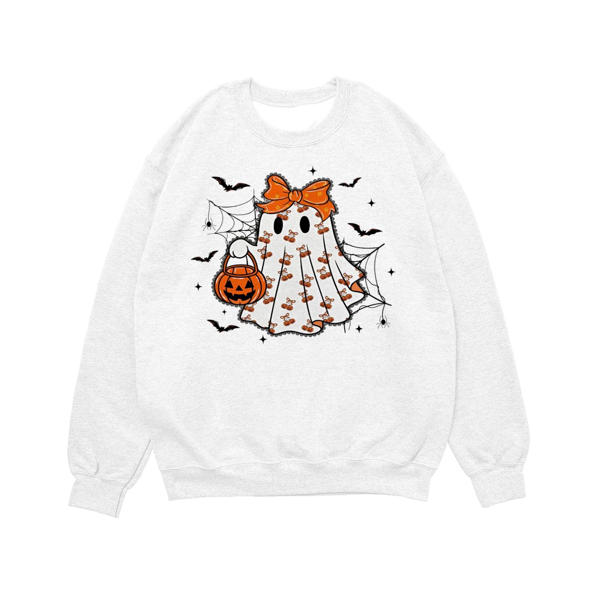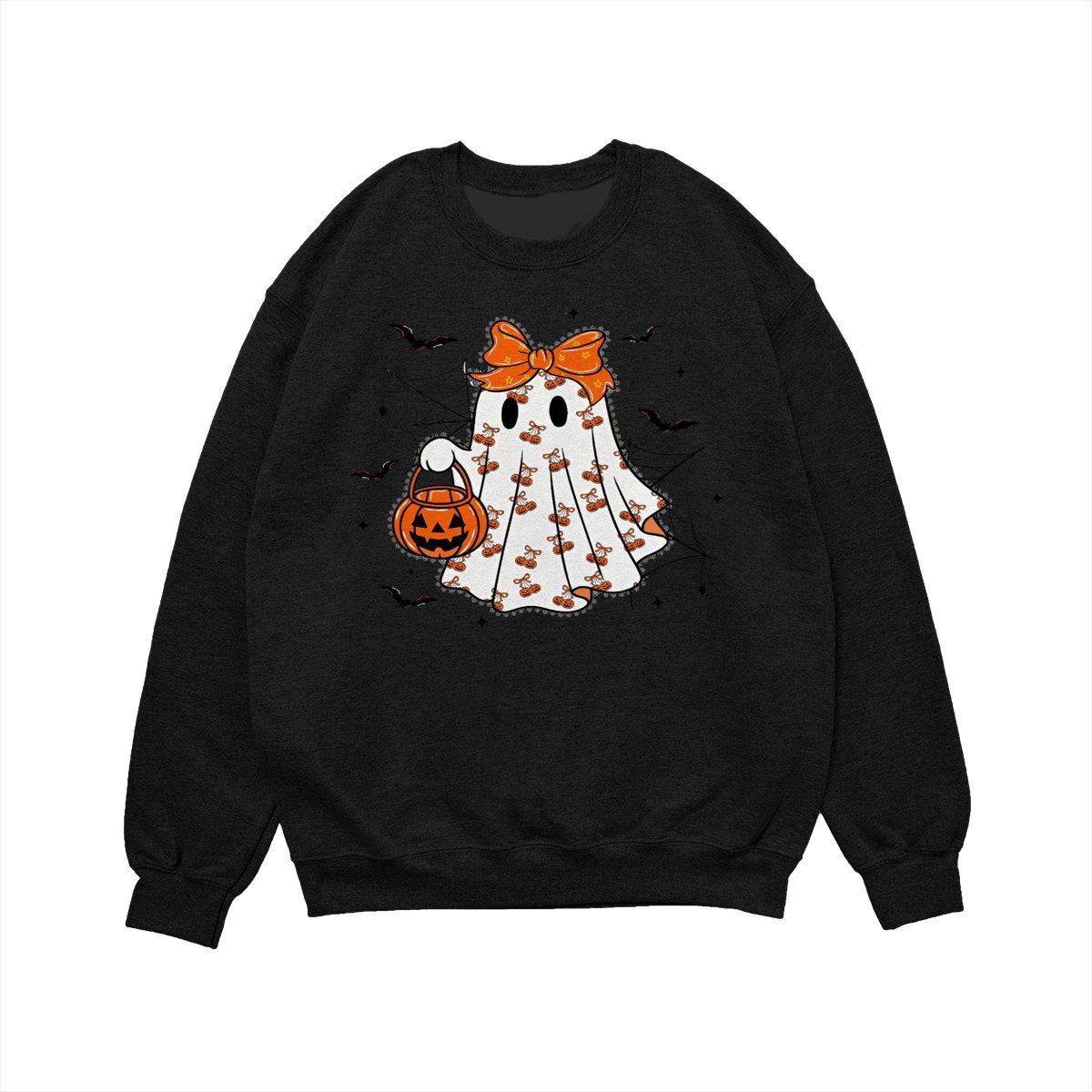 Halloween 2025 Cute Ghost Shirt, Spooky Orange Bow Pumpkin Trick Or Treat Pullover, Vintage Kawaii Ghost Graphic Top, Cozy Fall Winter Streetwear For Women And Men