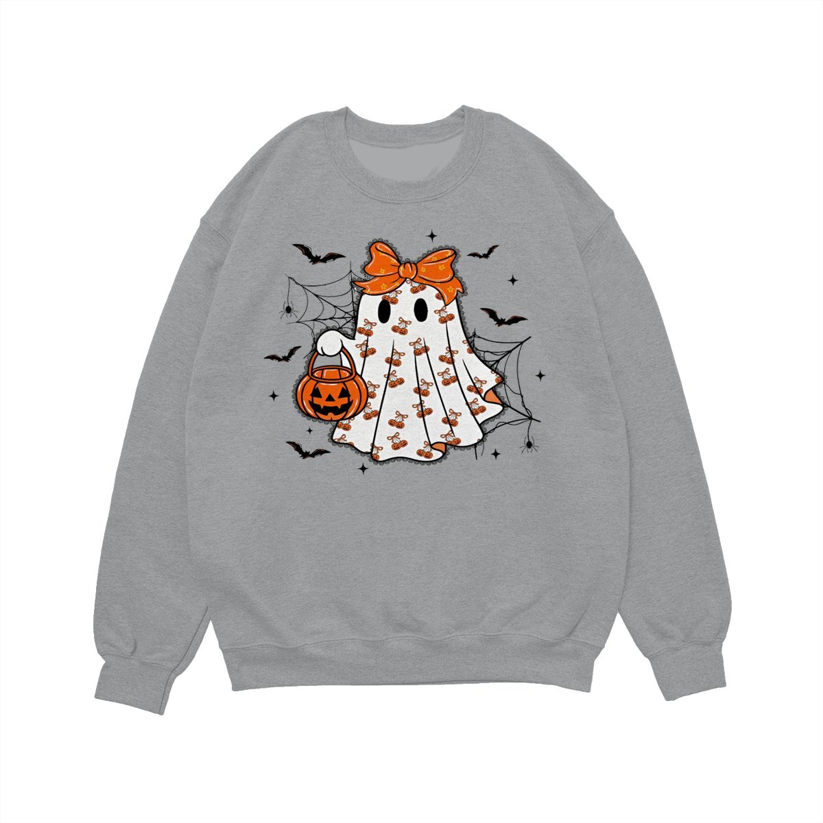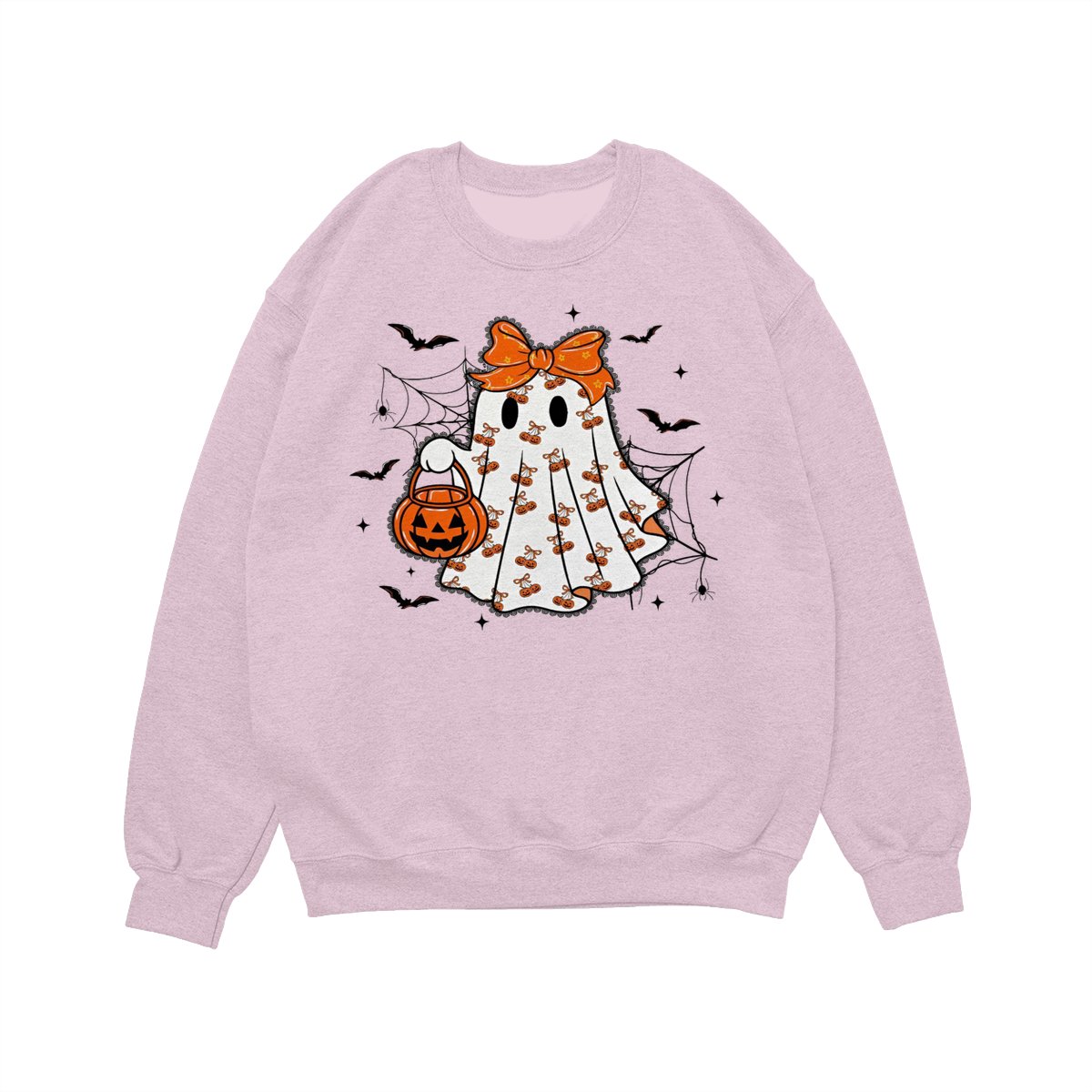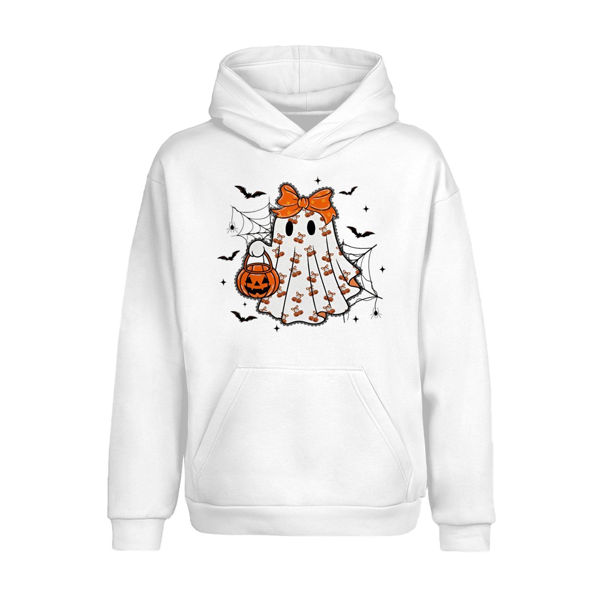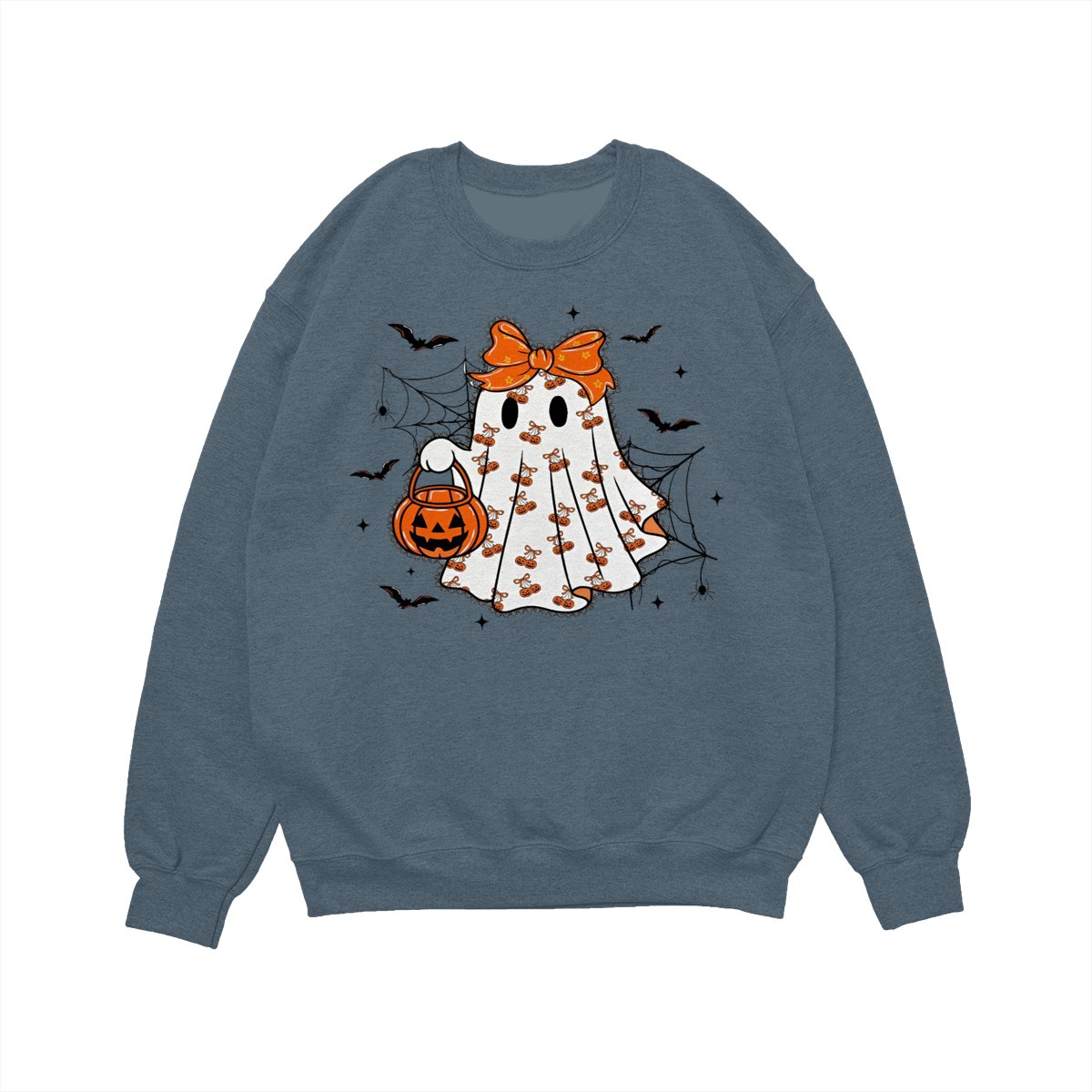 Halloween 2025 Cute Ghost Shirt, Spooky Orange Bow Pumpkin Trick Or Treat Pullover, Vintage Kawaii Ghost Graphic Top, Cozy Fall Winter Streetwear For Women And Men