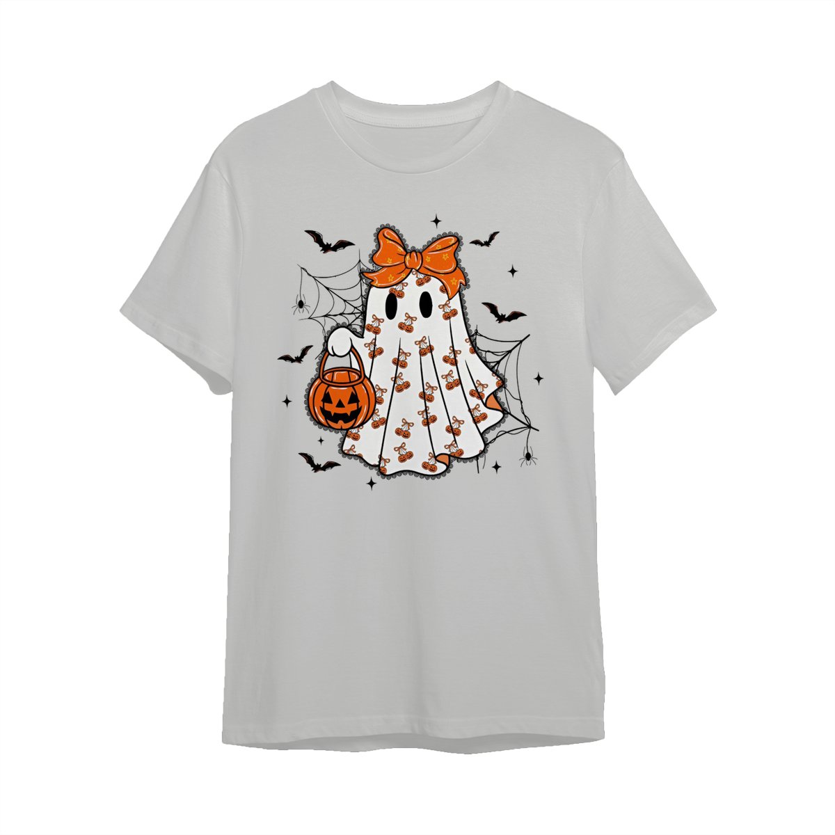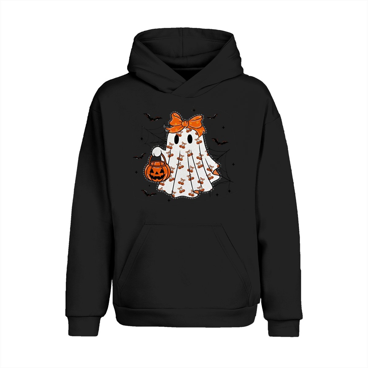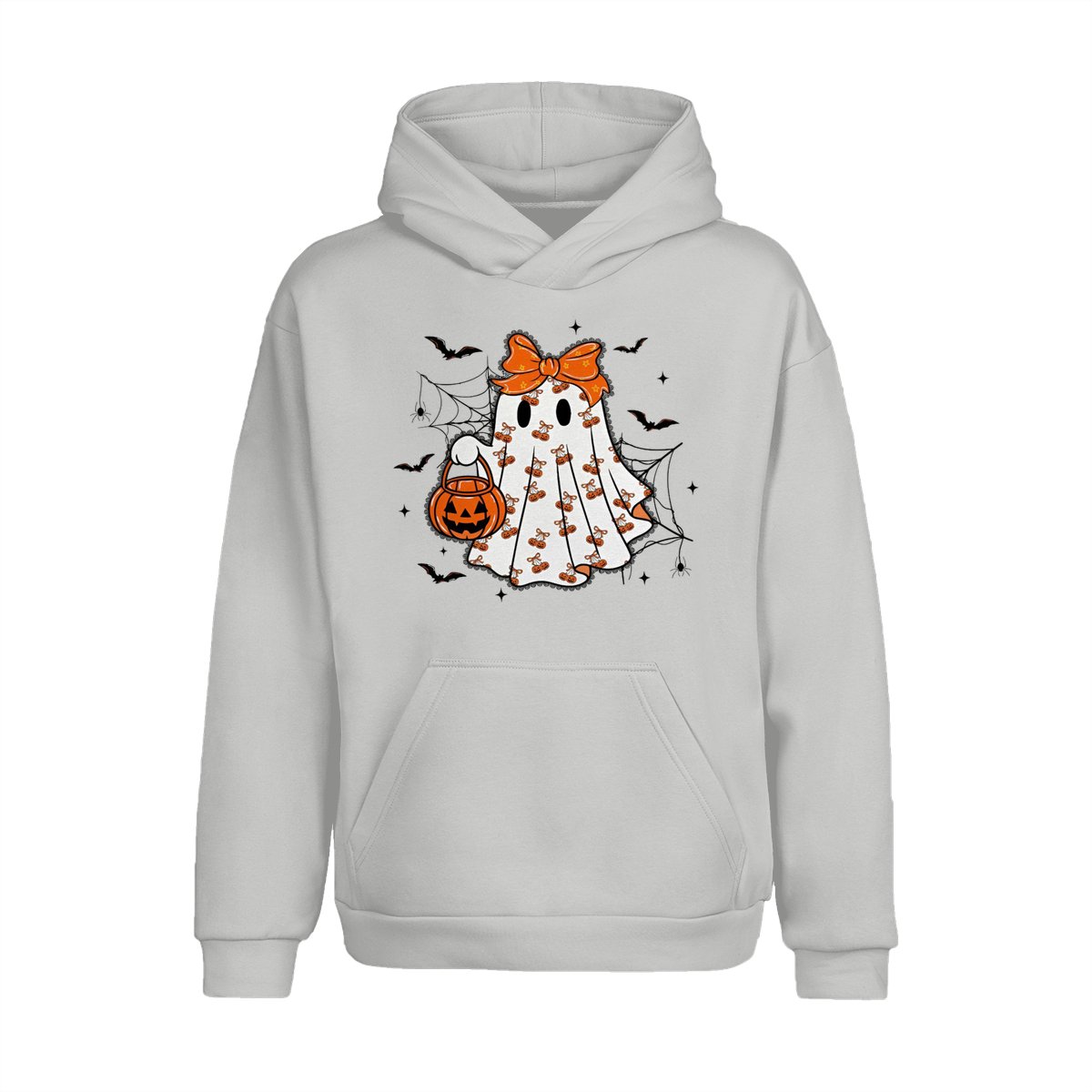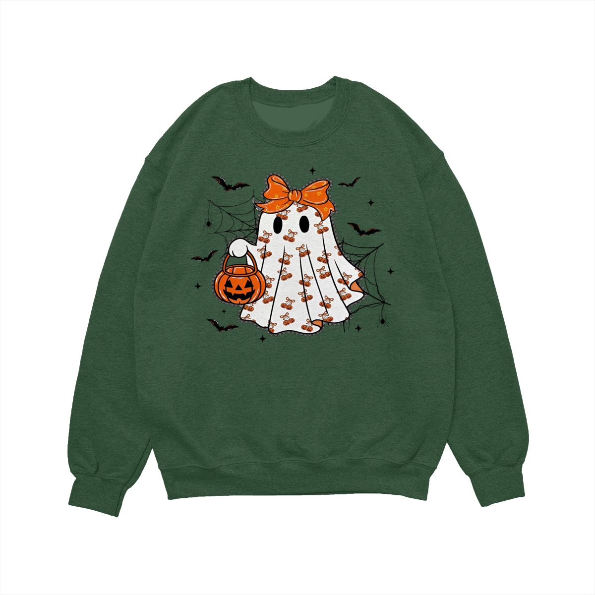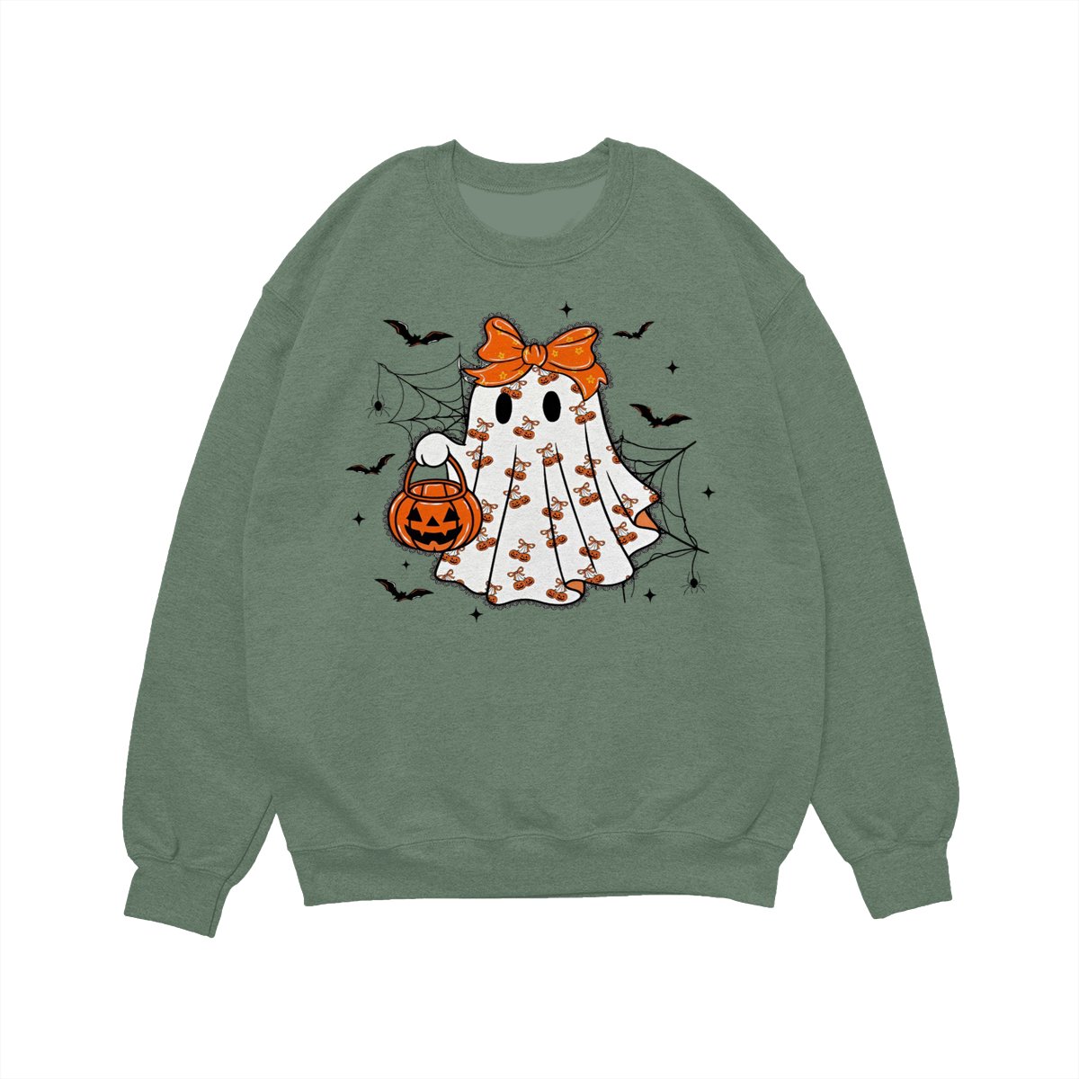 Halloween 2025 Cute Ghost Shirt, Spooky Orange Bow Pumpkin Trick Or Treat Pullover, Vintage Kawaii Ghost Graphic Top, Cozy Fall Winter Streetwear For Women And Men