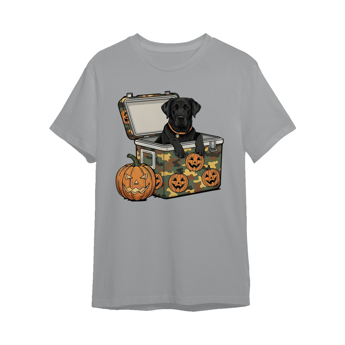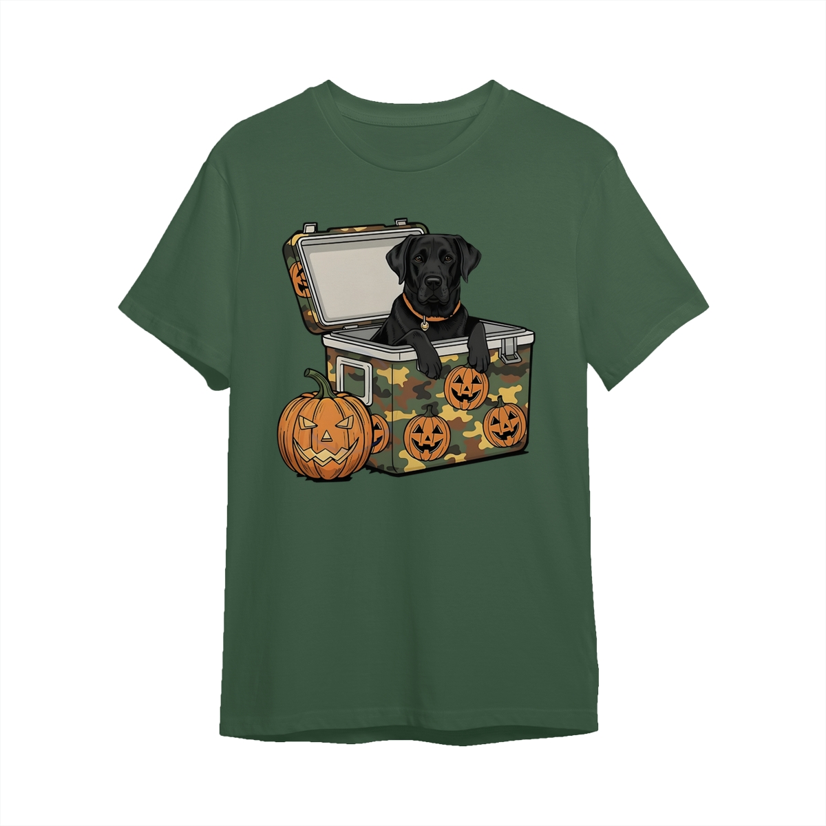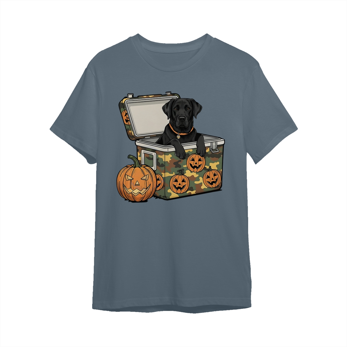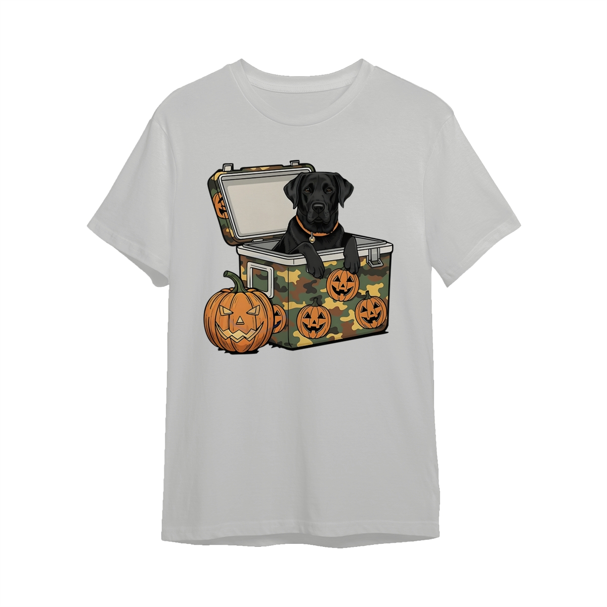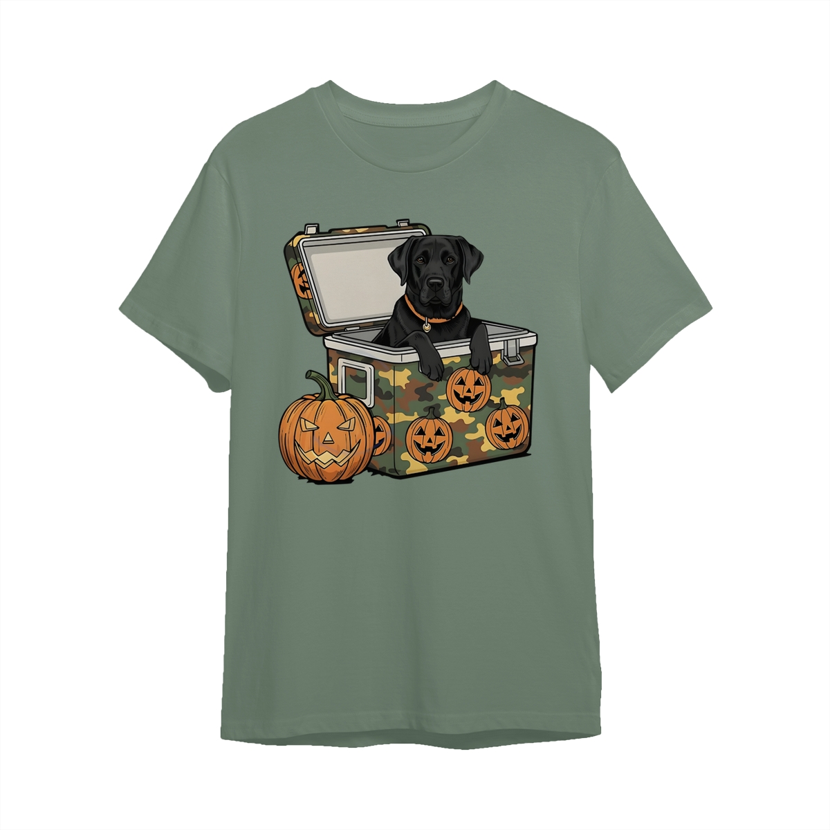 Halloween Black Lab Dog in Camo Cooler Unisex TShirt/Sweatshirt/Hoodie, Dog with Pumpkin Face Tee, Fall Hunting Dog Shirt, Southern Spooky Halloween Gift