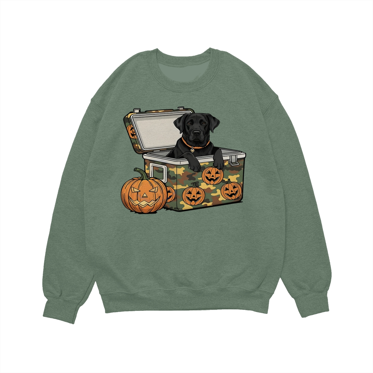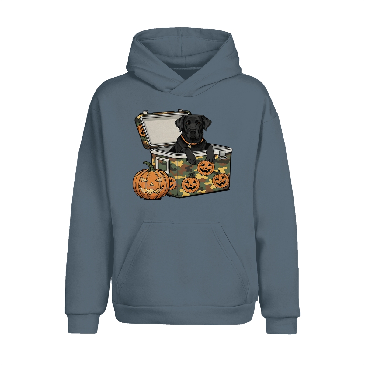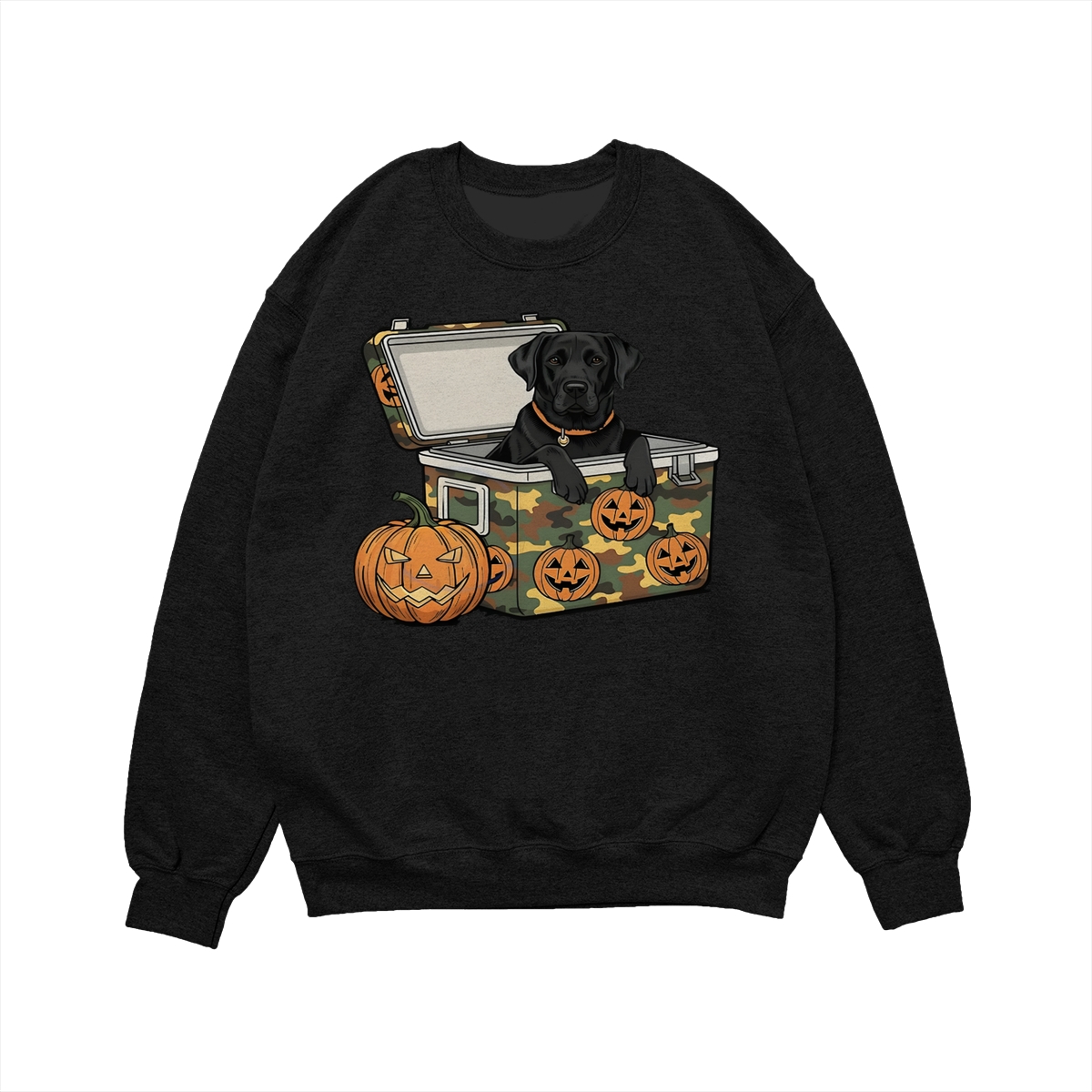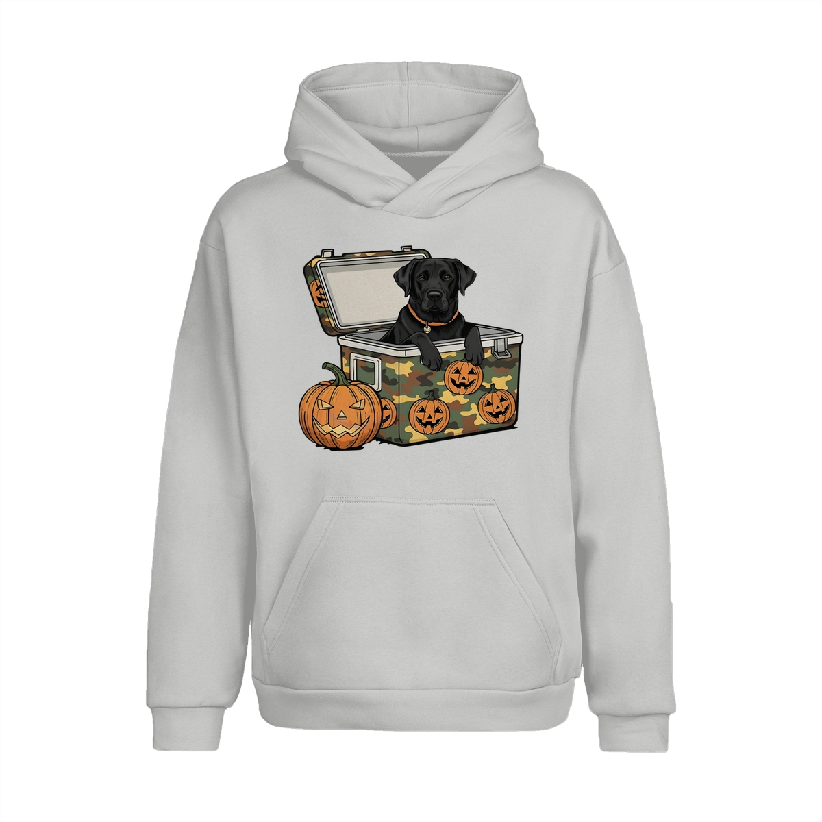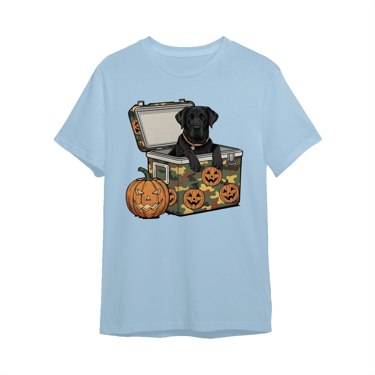 Halloween Black Lab Dog in Camo Cooler Unisex TShirt/Sweatshirt/Hoodie, Dog with Pumpkin Face Tee, Fall Hunting Dog Shirt, Southern Spooky Halloween Gift