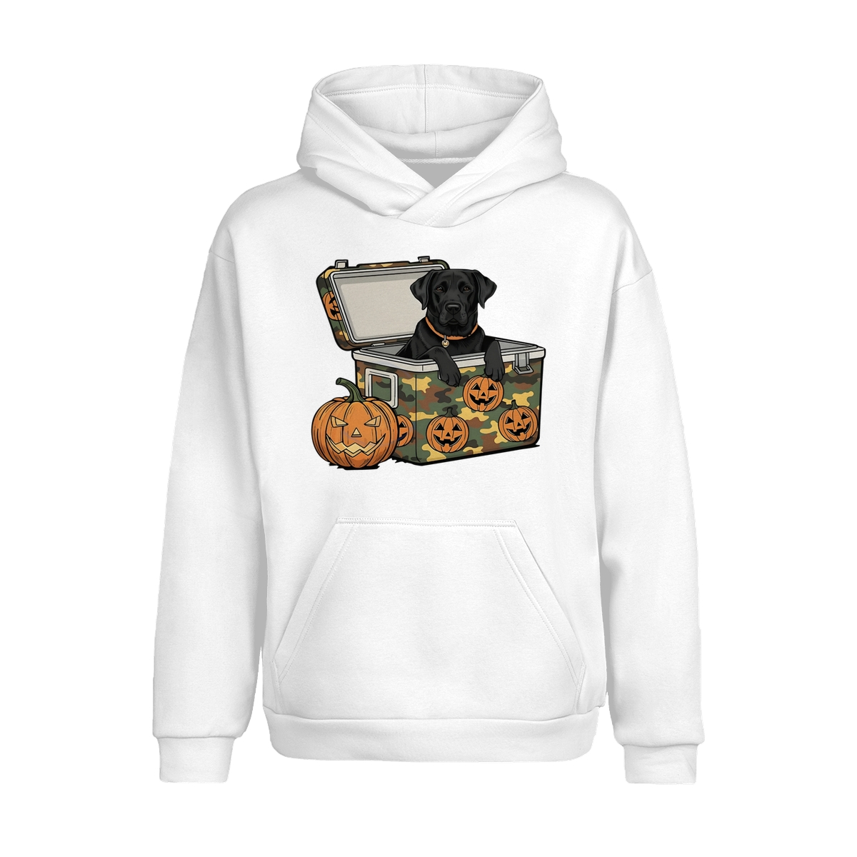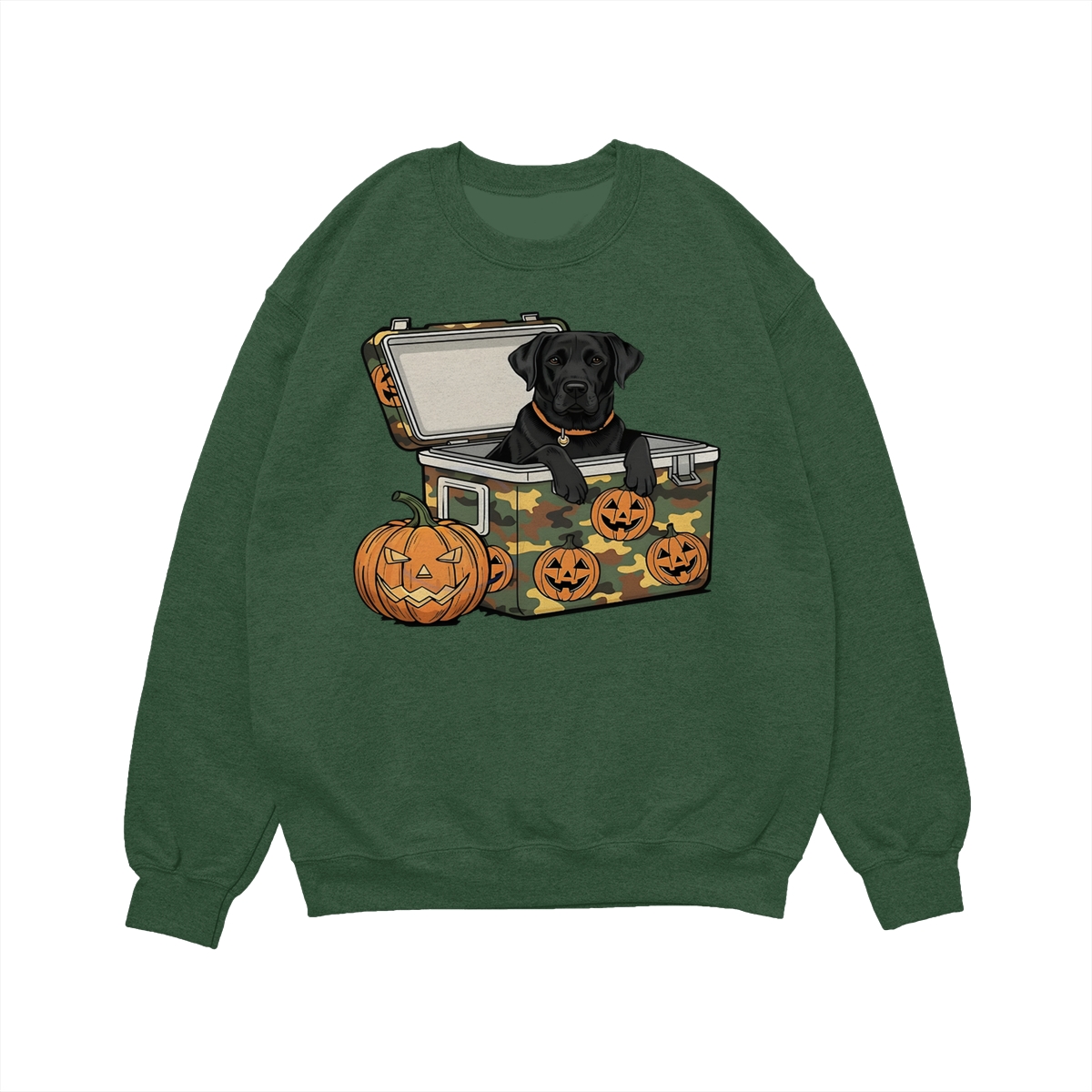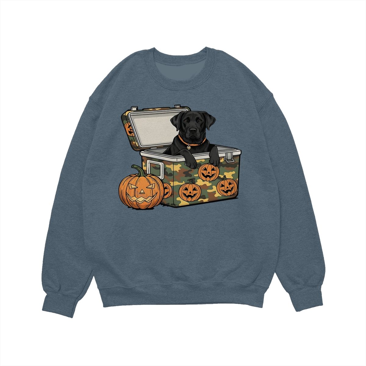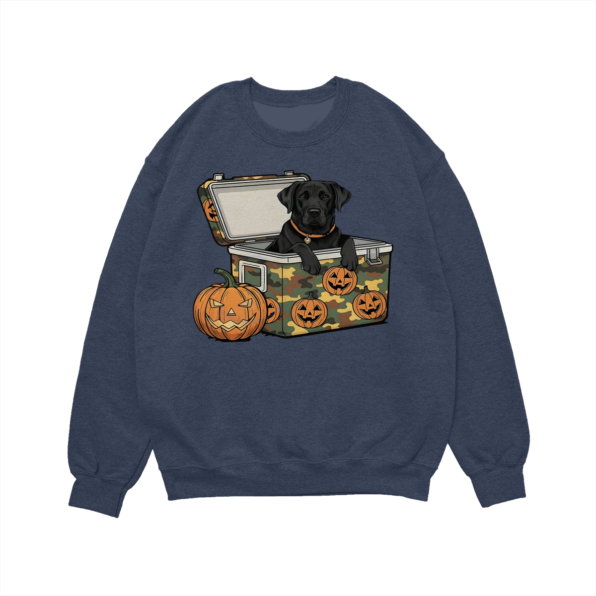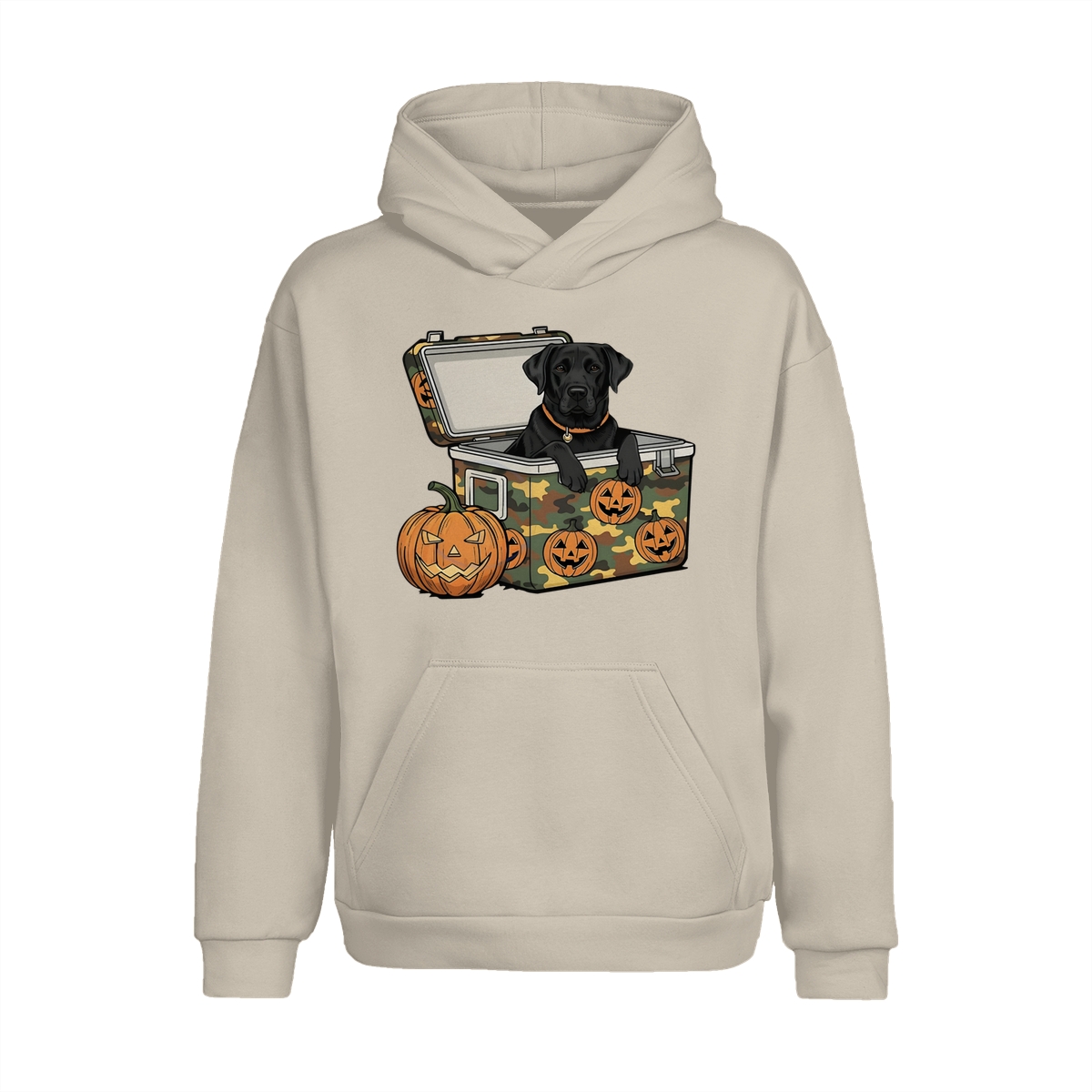 Halloween Black Lab Dog in Camo Cooler Unisex TShirt/Sweatshirt/Hoodie, Dog with Pumpkin Face Tee, Fall Hunting Dog Shirt, Southern Spooky Halloween Gift