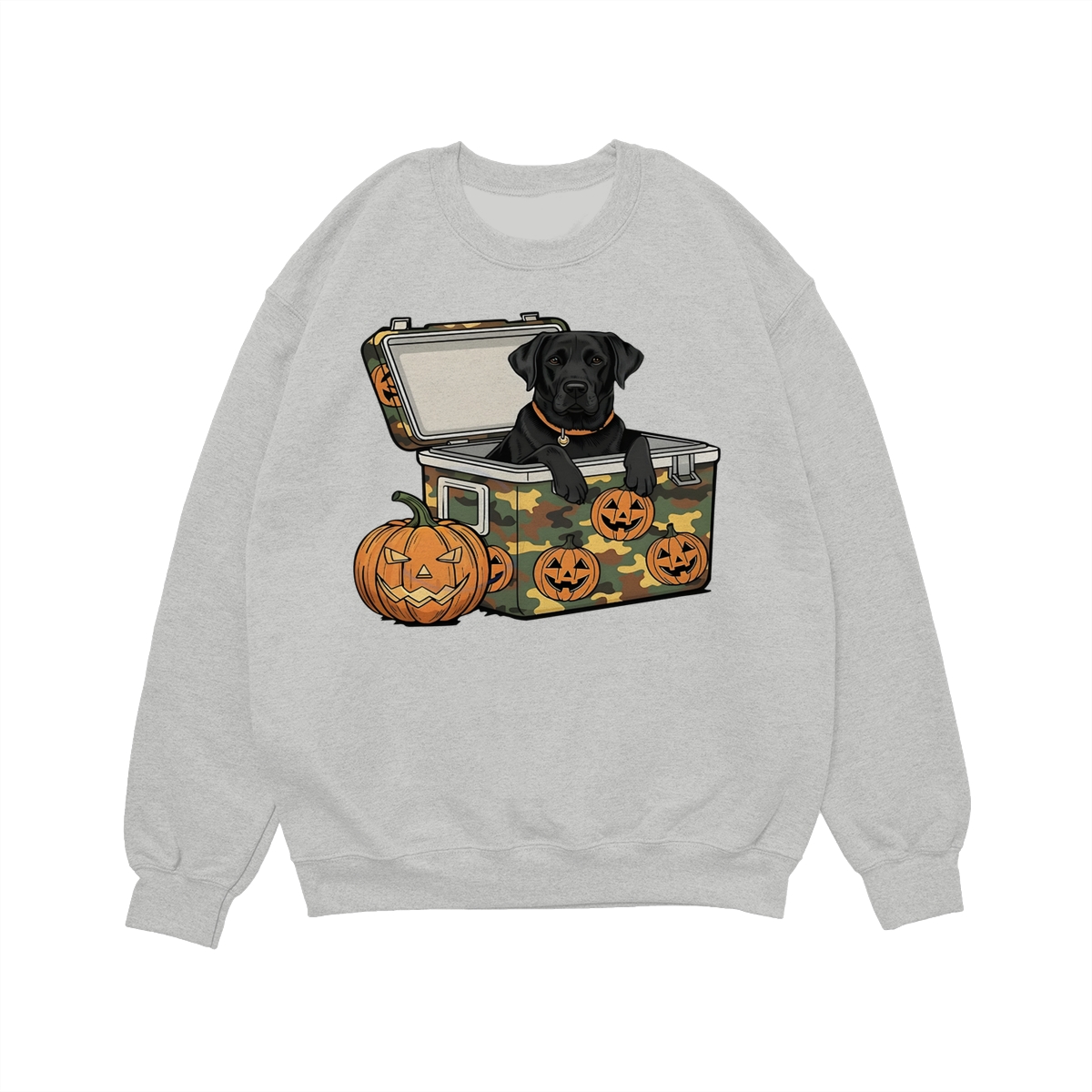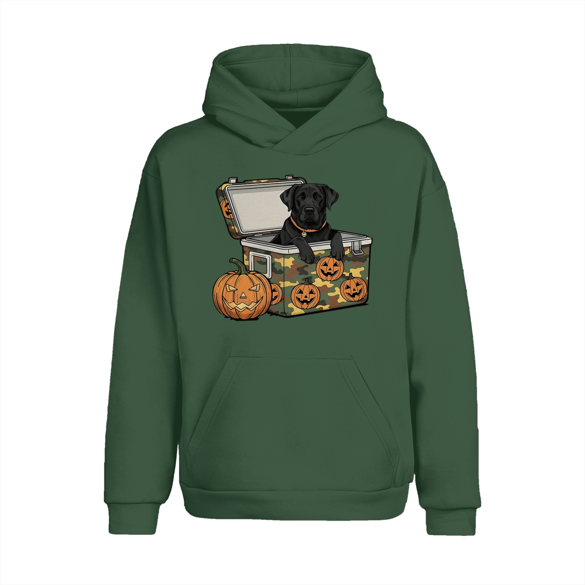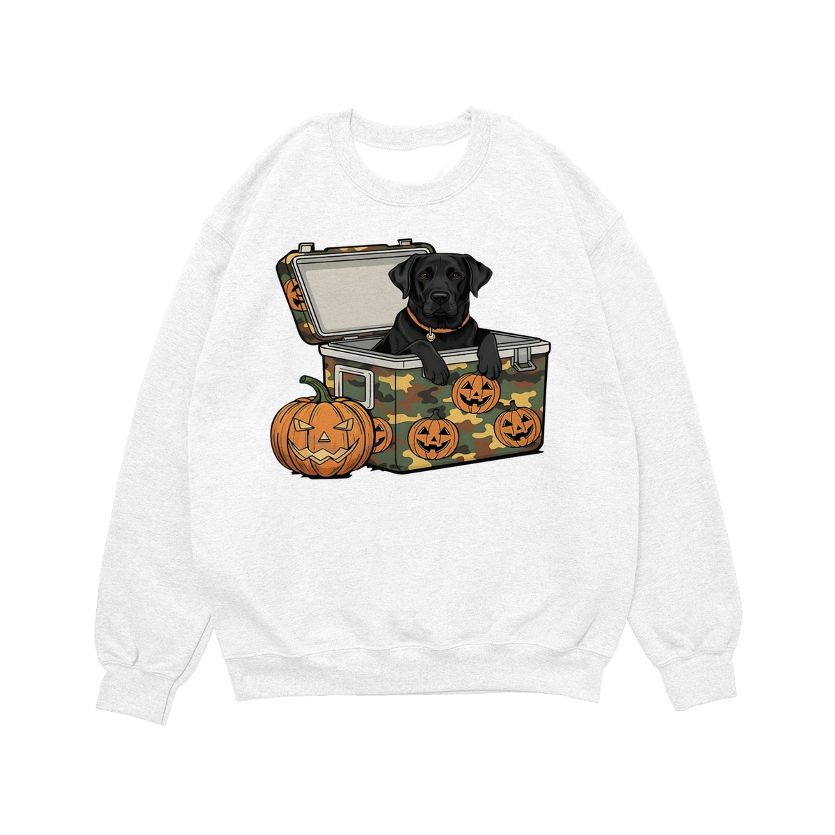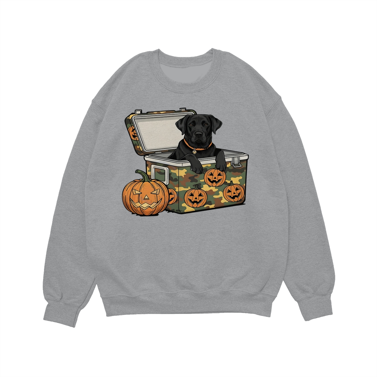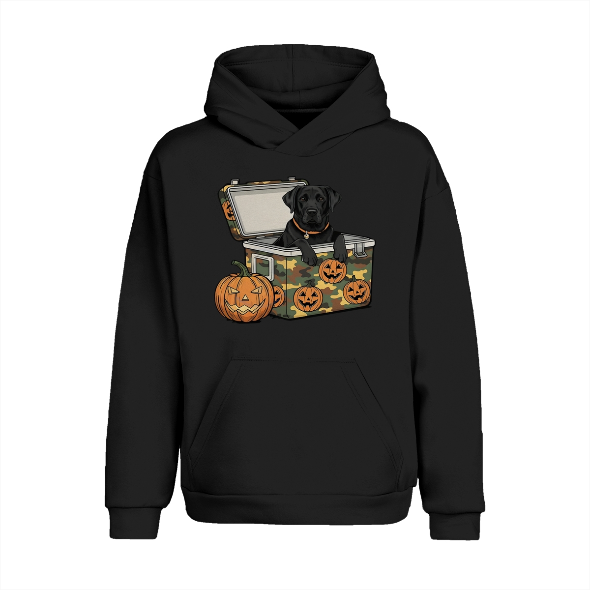 Halloween Black Lab Dog in Camo Cooler Unisex TShirt/Sweatshirt/Hoodie, Dog with Pumpkin Face Tee, Fall Hunting Dog Shirt, Southern Spooky Halloween Gift