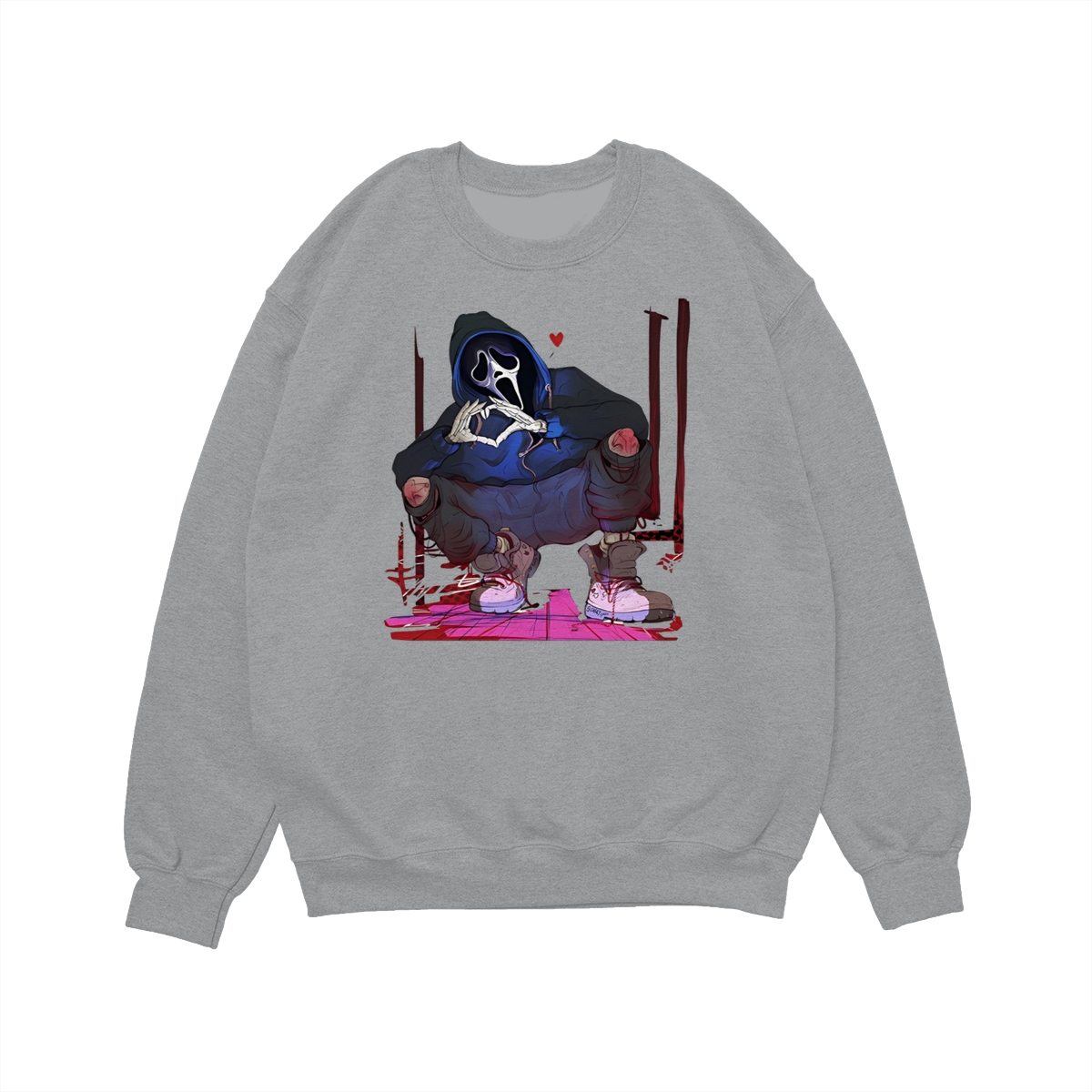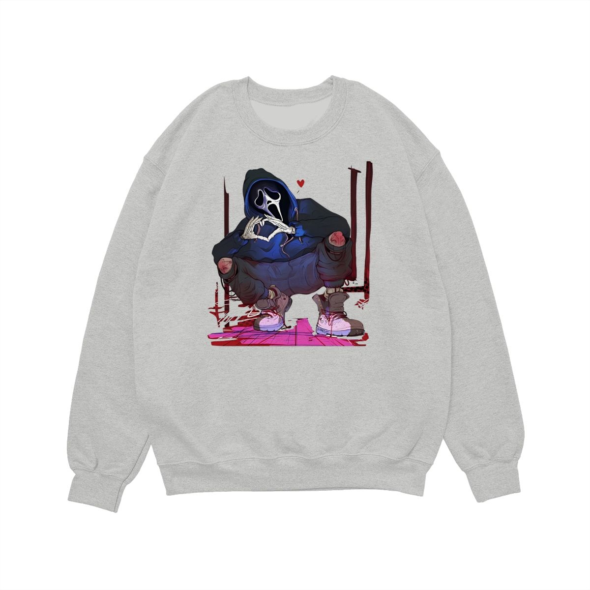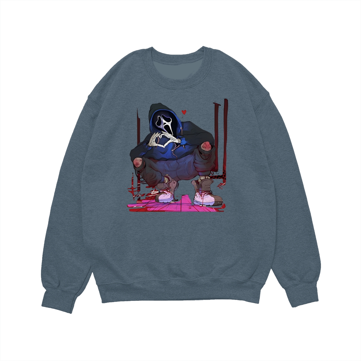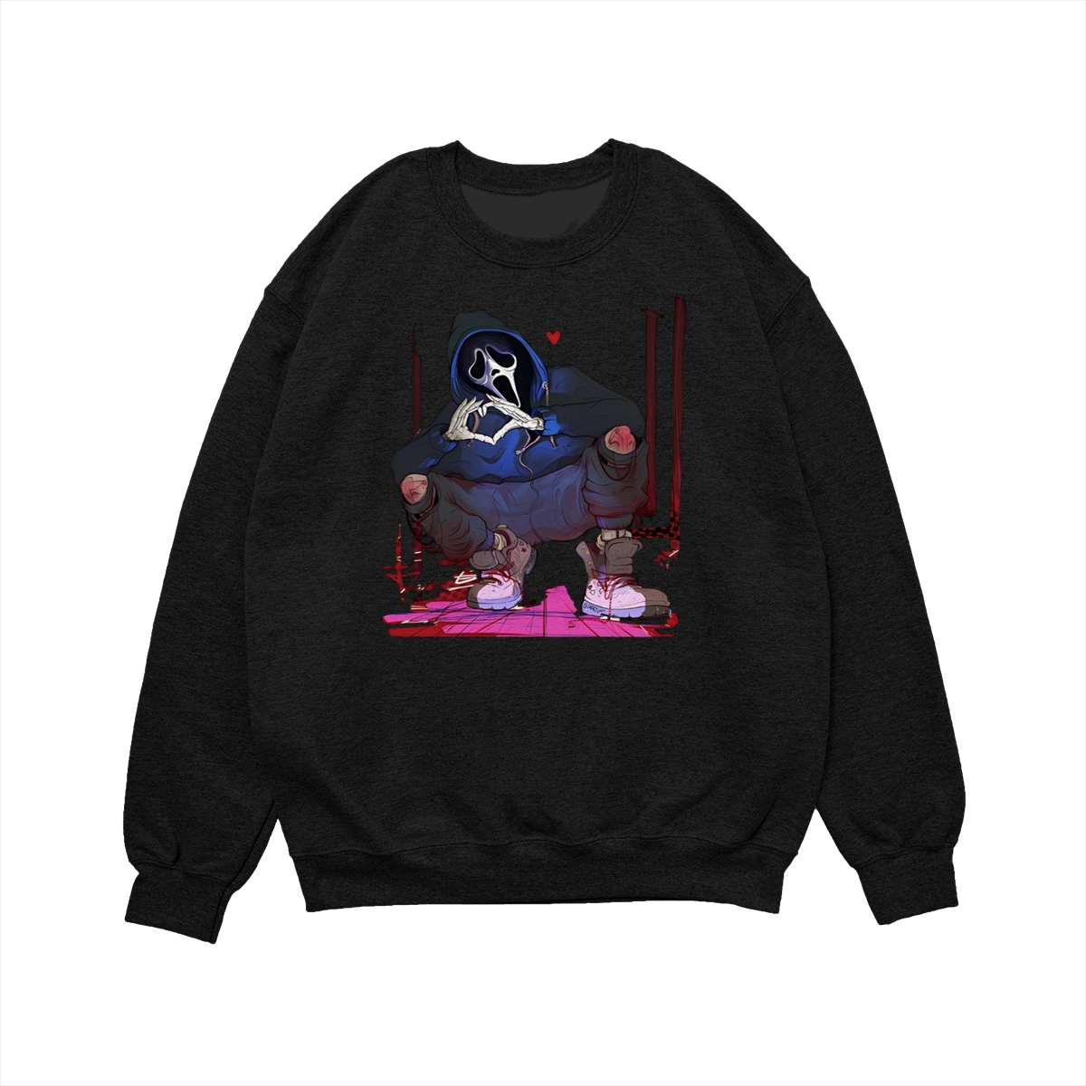 Halloween Shirt – Cool Ghost Mask Character In Hoodie And Sneakers , Street Style Graphic With Heart Hand Sign , Trendy Unisex Pullover , Perfect For Halloween Parties , Autumn Outfit , Holiday Gift Casual Crewneck