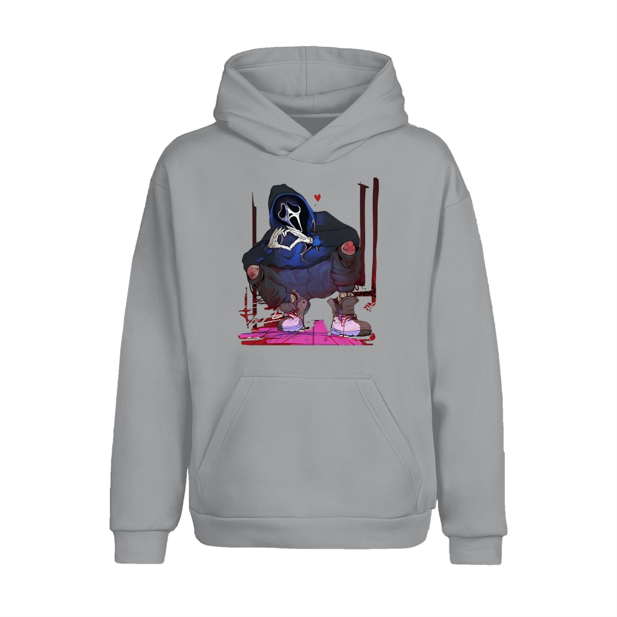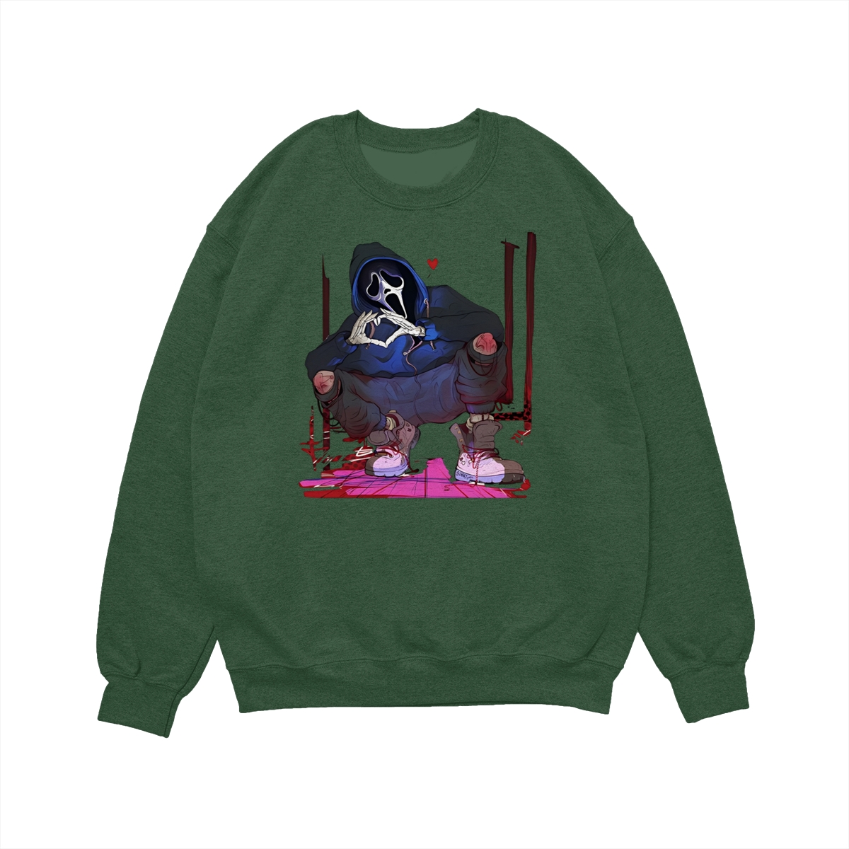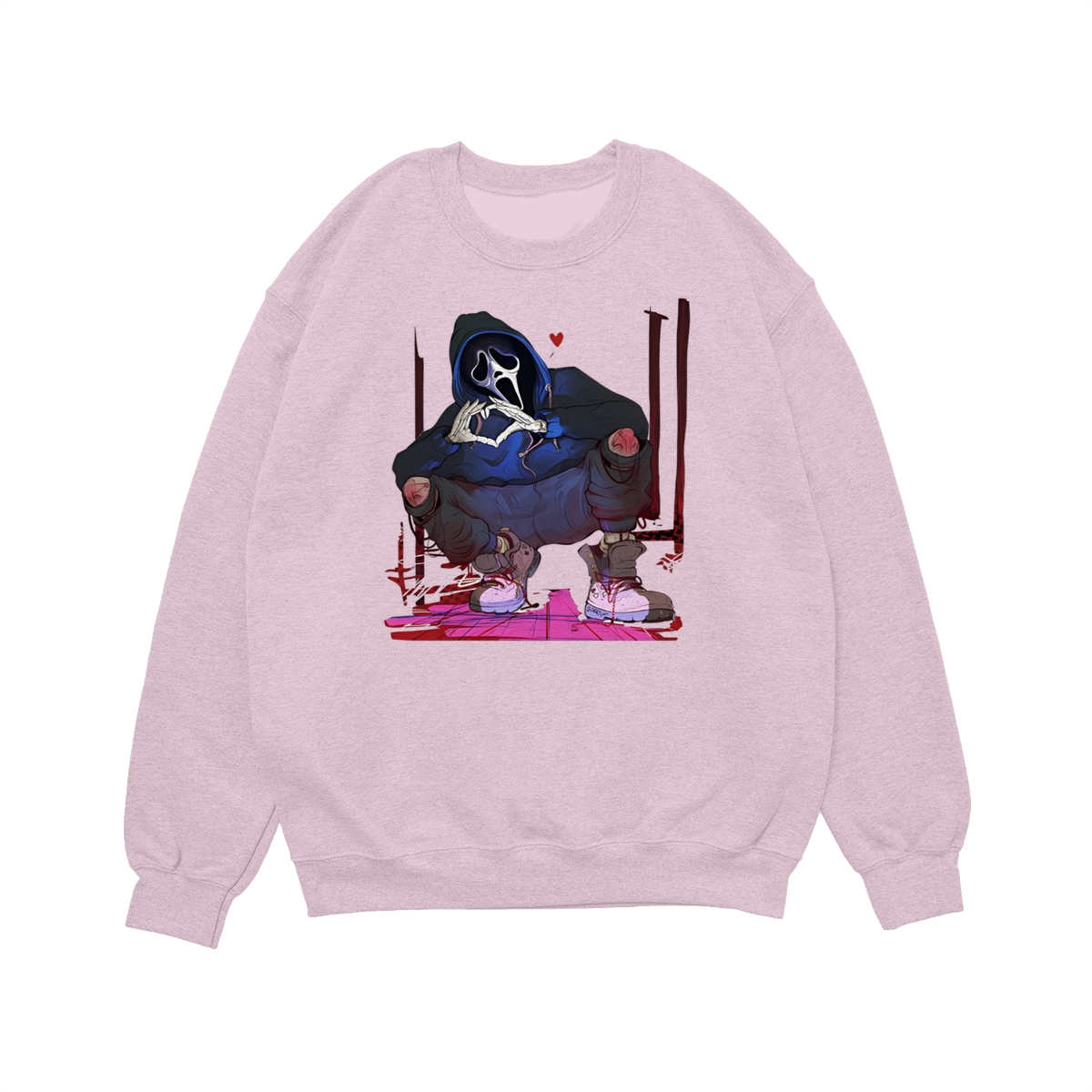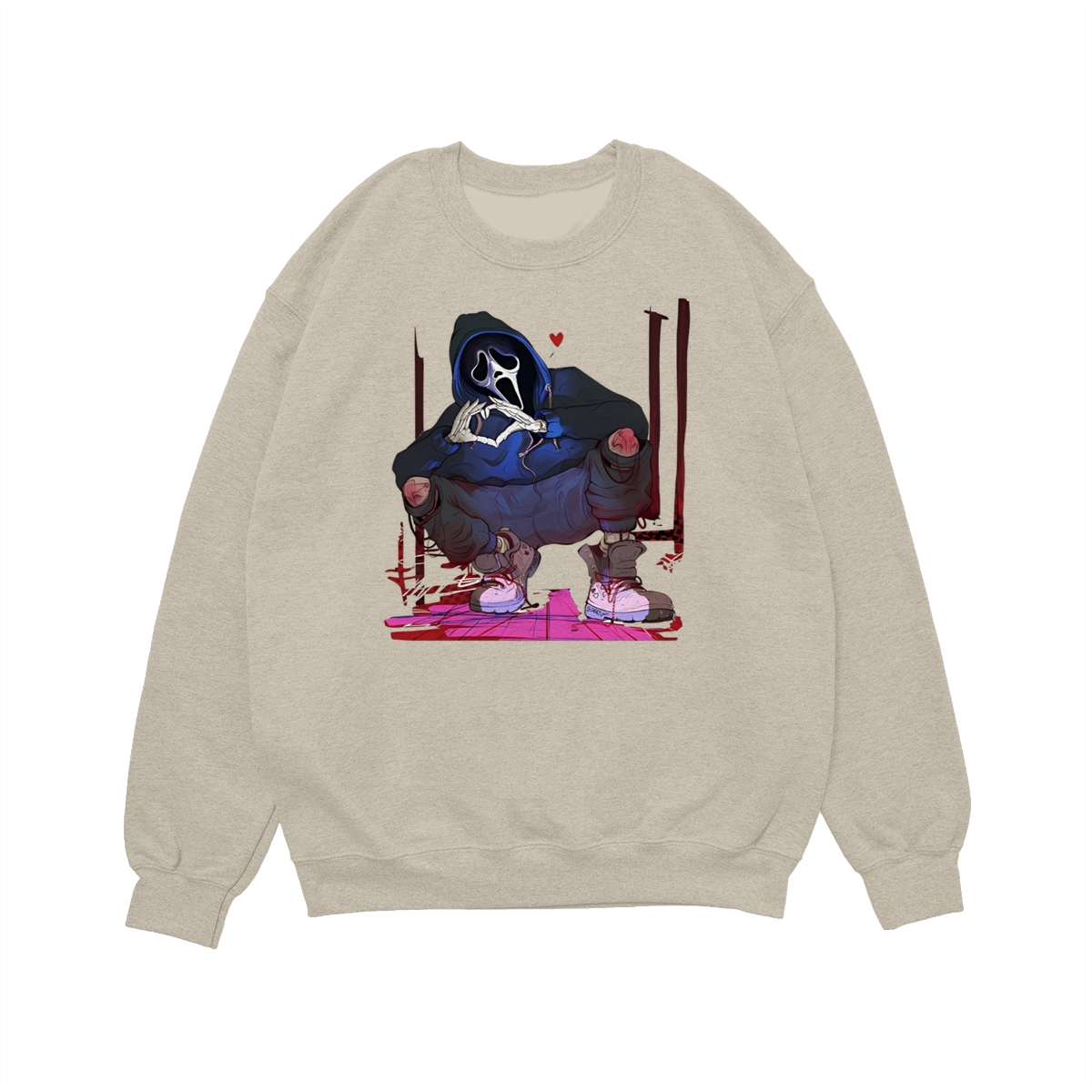 Halloween Shirt – Cool Ghost Mask Character In Hoodie And Sneakers , Street Style Graphic With Heart Hand Sign , Trendy Unisex Pullover , Perfect For Halloween Parties , Autumn Outfit , Holiday Gift Casual Crewneck