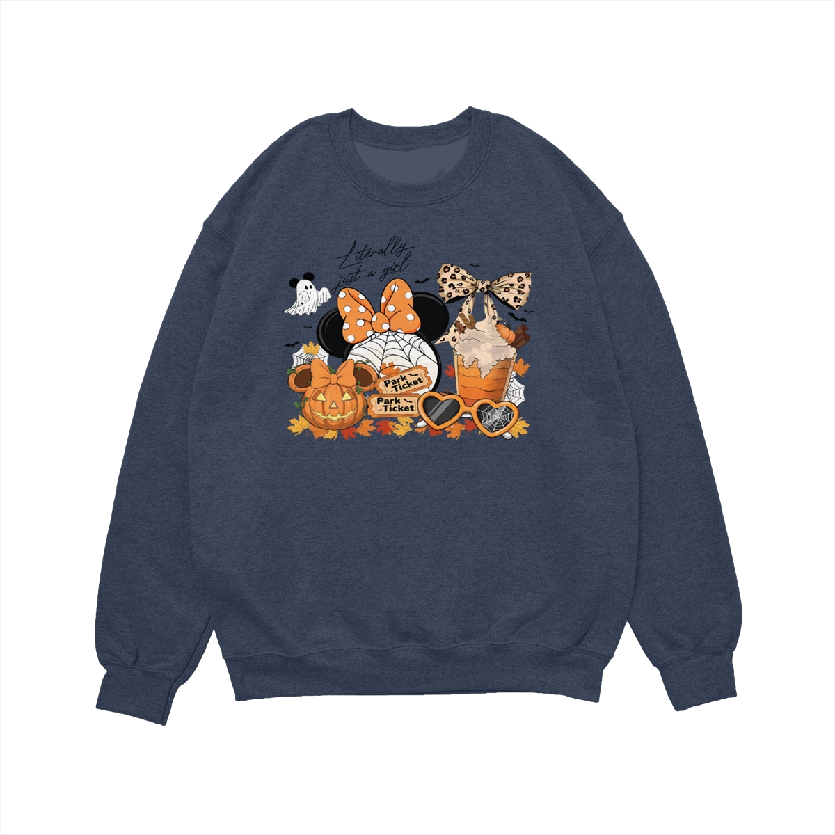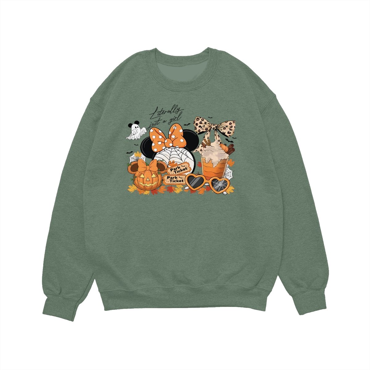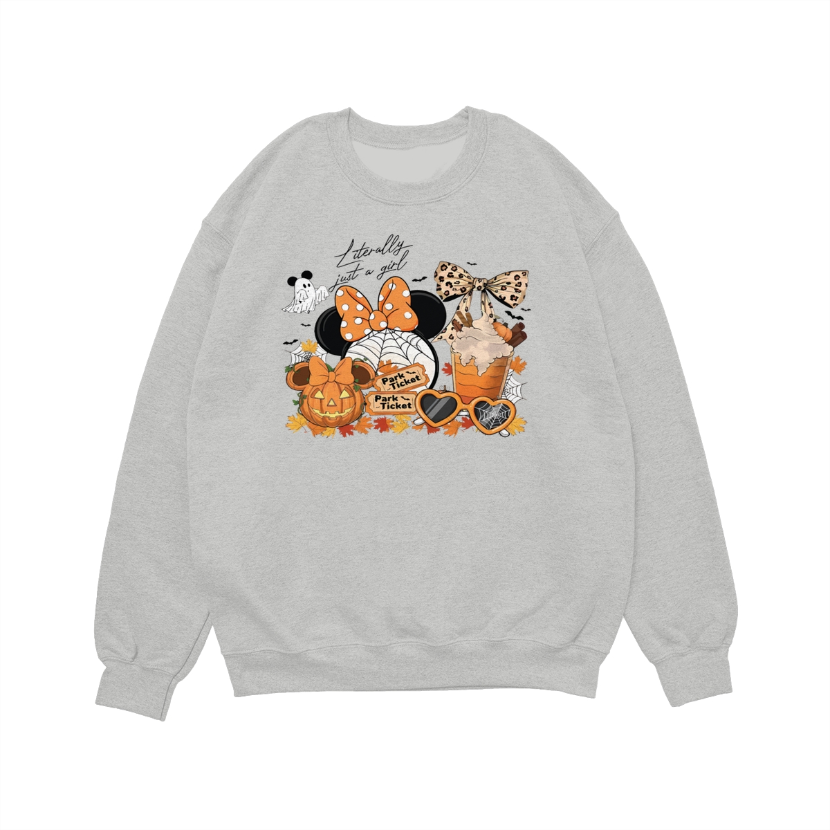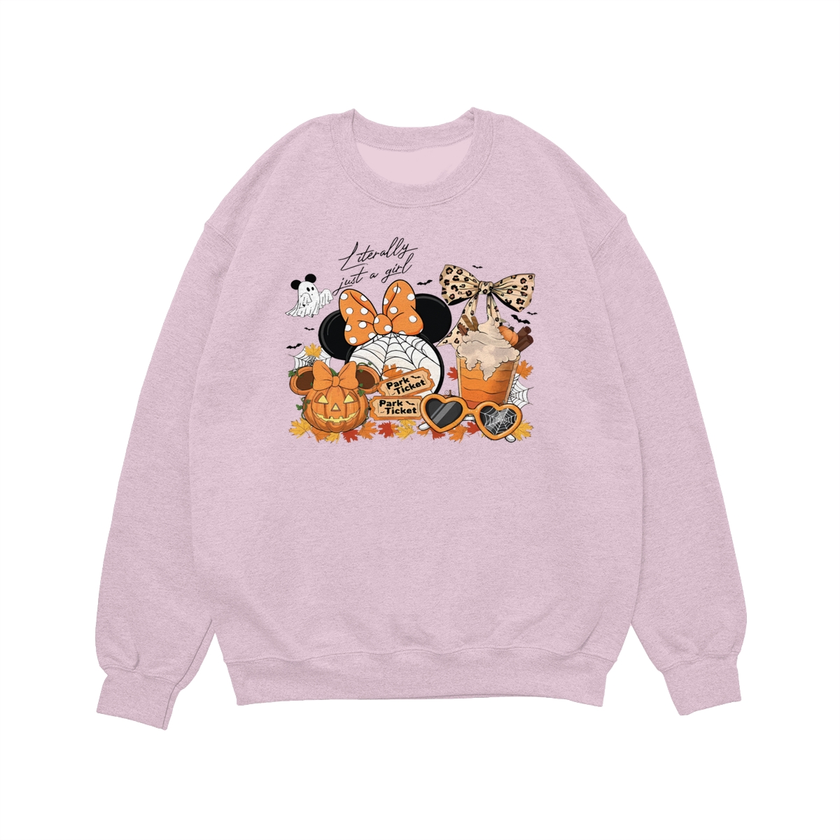 Halloween Shirt – Literally Just A Girl Graphic with Minnie Ears, Pumpkin, Bows & Fall Drink, Cute Spooky Season Pullover, Cozy Long Sleeve Crewneck – Unisex Trendy – Womenswear