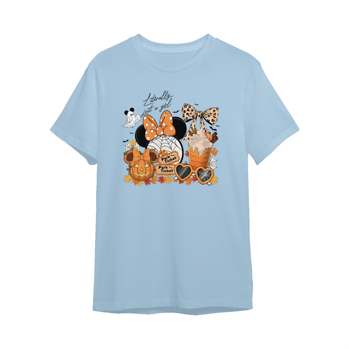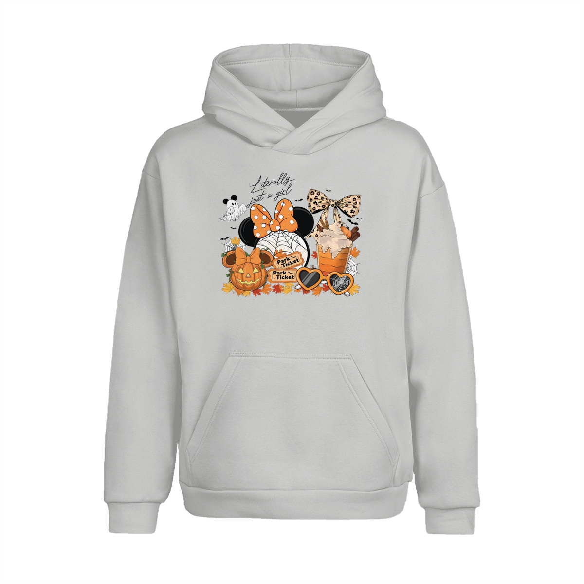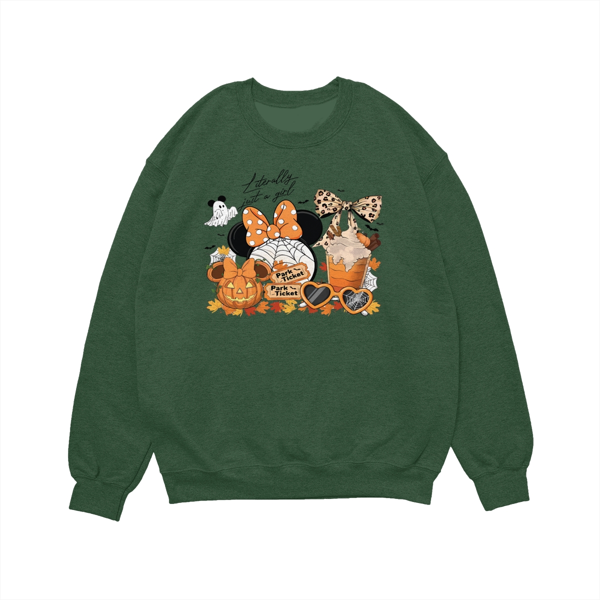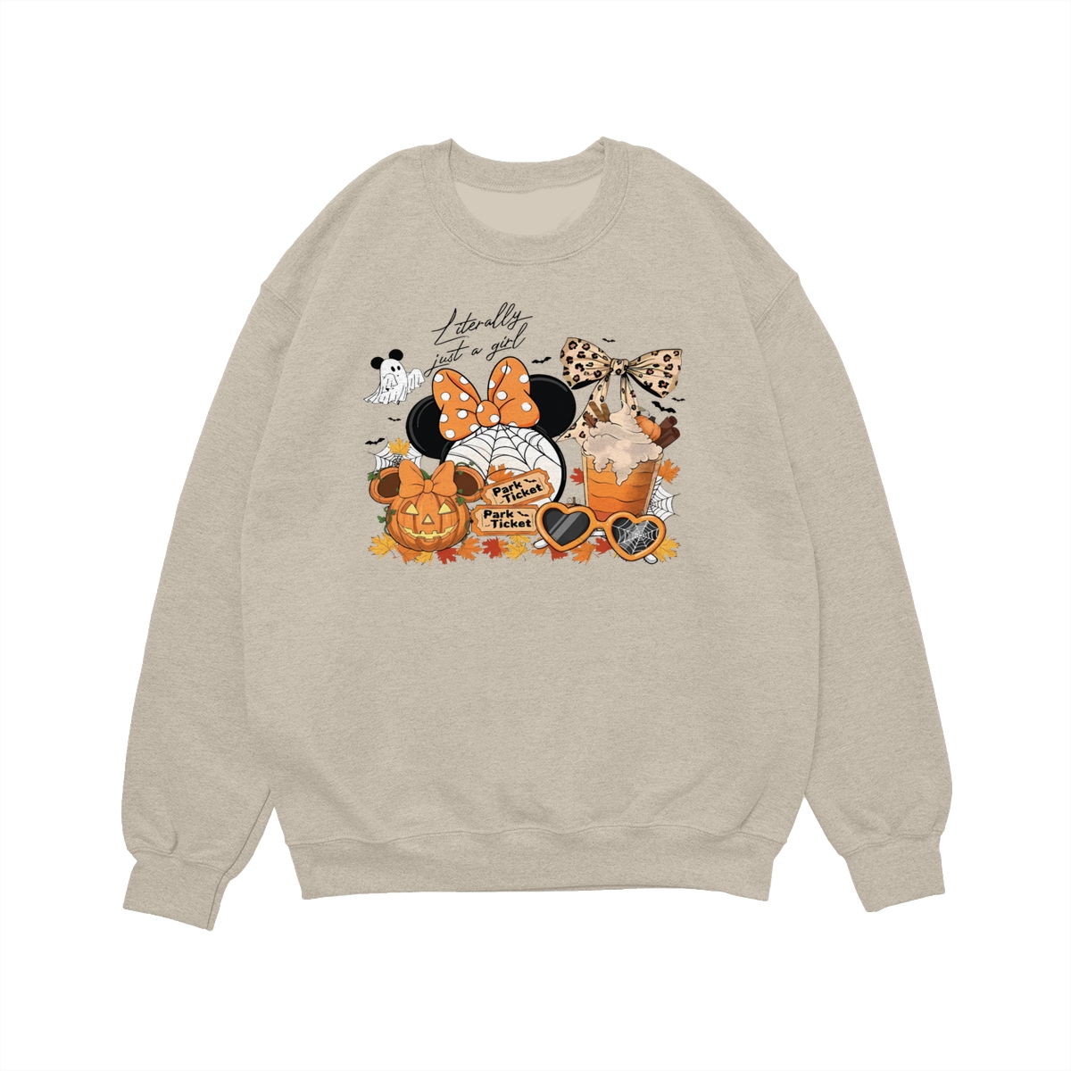 Halloween Shirt – Literally Just A Girl Graphic with Minnie Ears, Pumpkin, Bows & Fall Drink, Cute Spooky Season Pullover, Cozy Long Sleeve Crewneck – Unisex Trendy – Womenswear