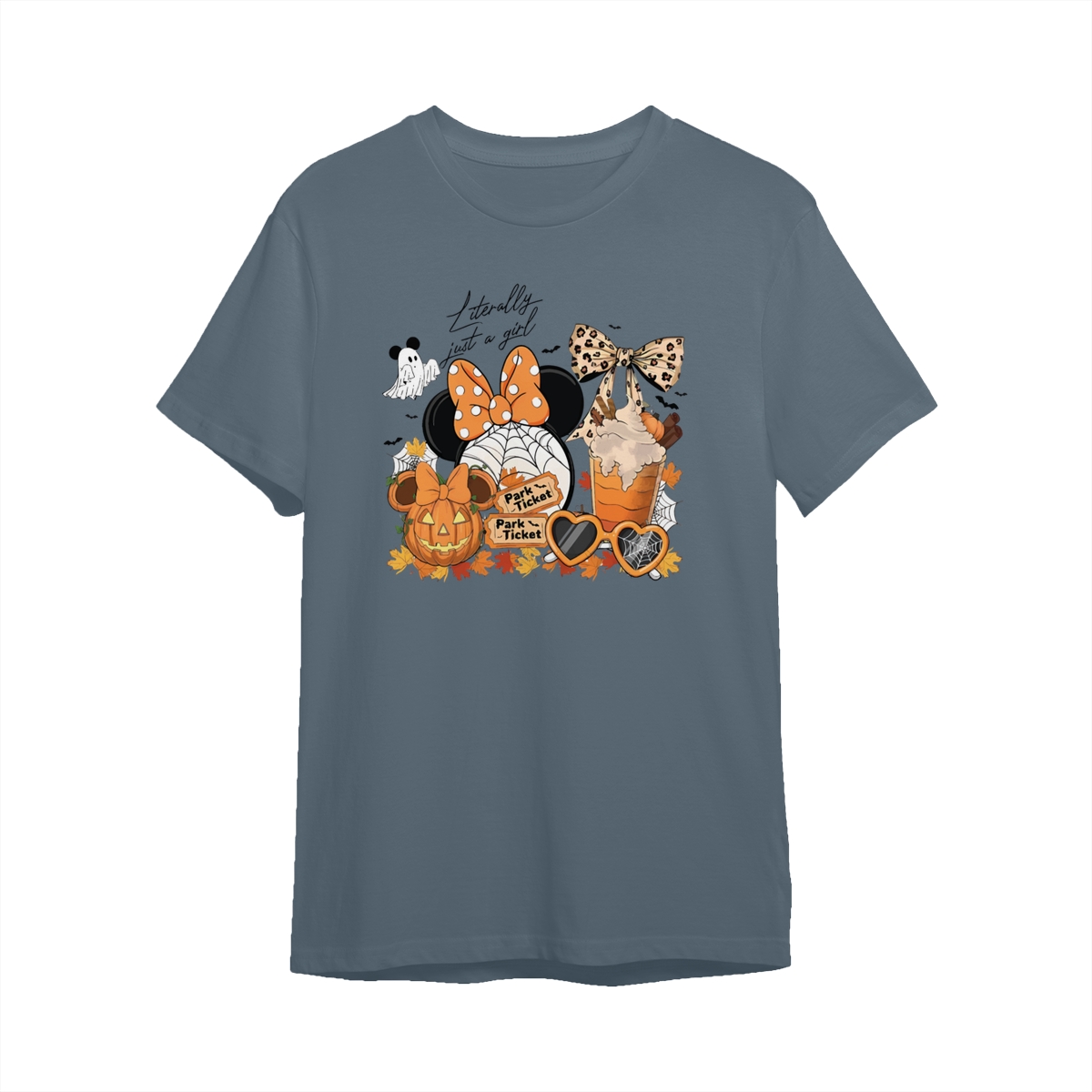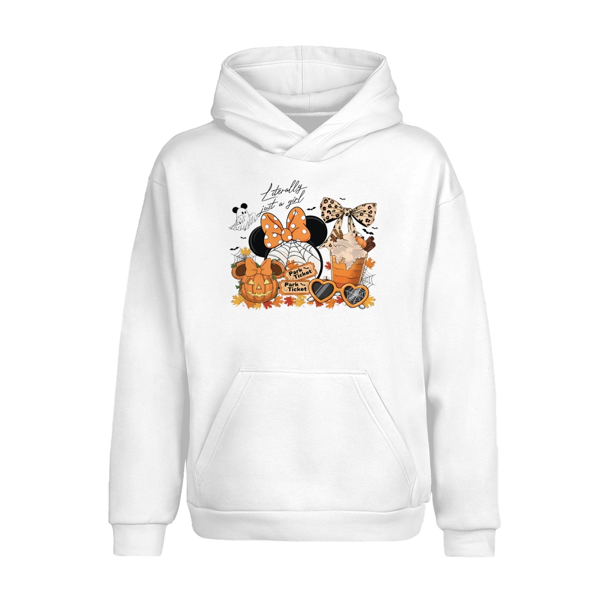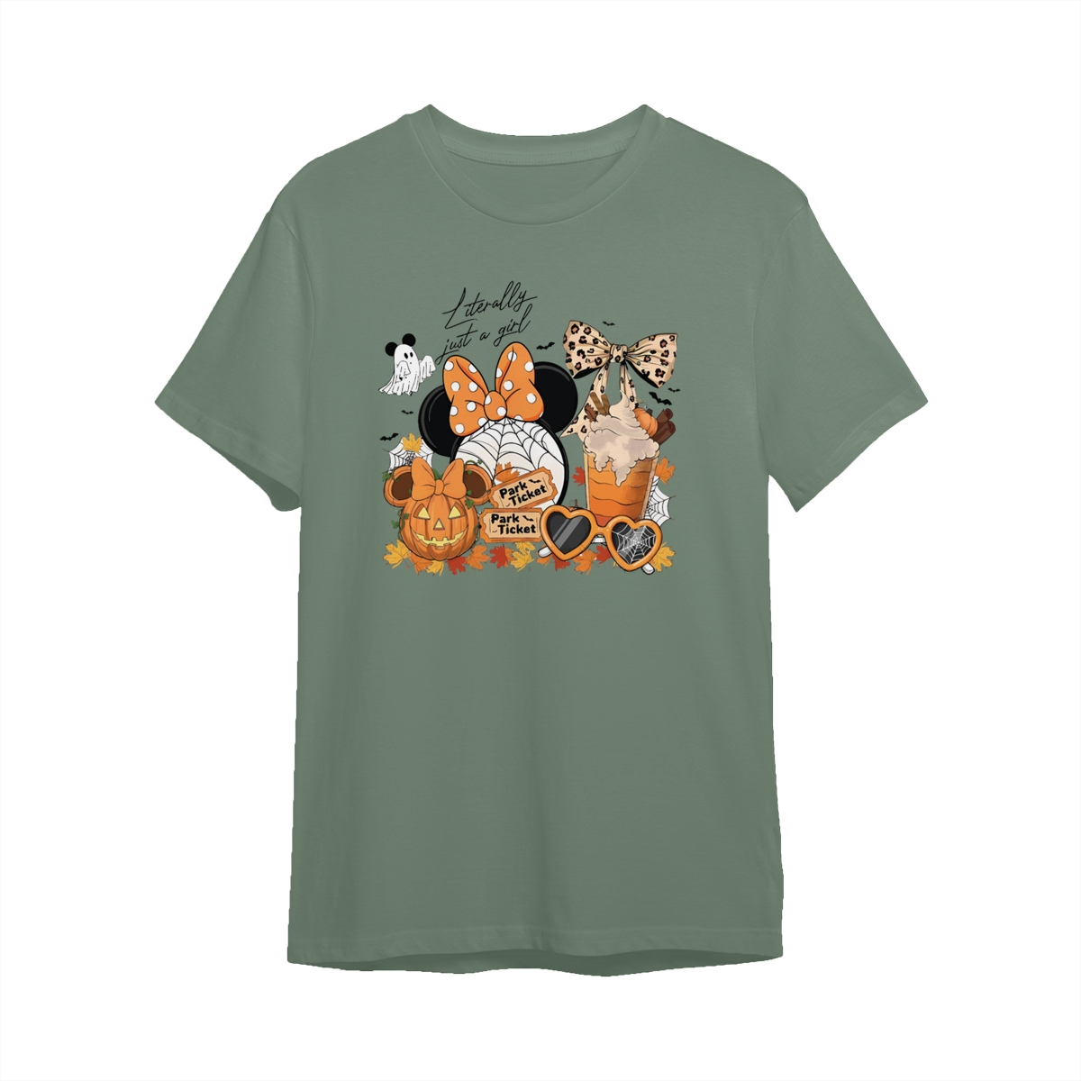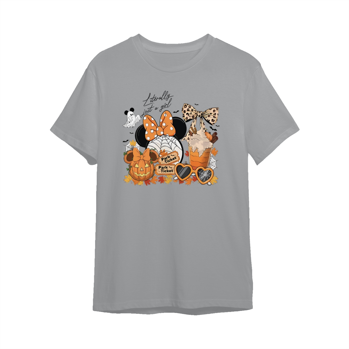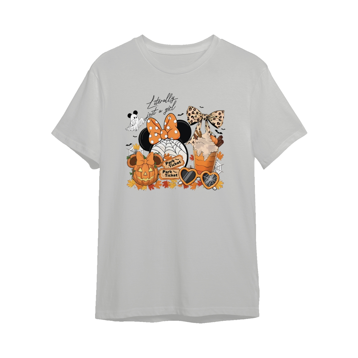 Halloween Shirt – Literally Just A Girl Graphic with Minnie Ears, Pumpkin, Bows & Fall Drink, Cute Spooky Season Pullover, Cozy Long Sleeve Crewneck – Unisex Trendy – Womenswear