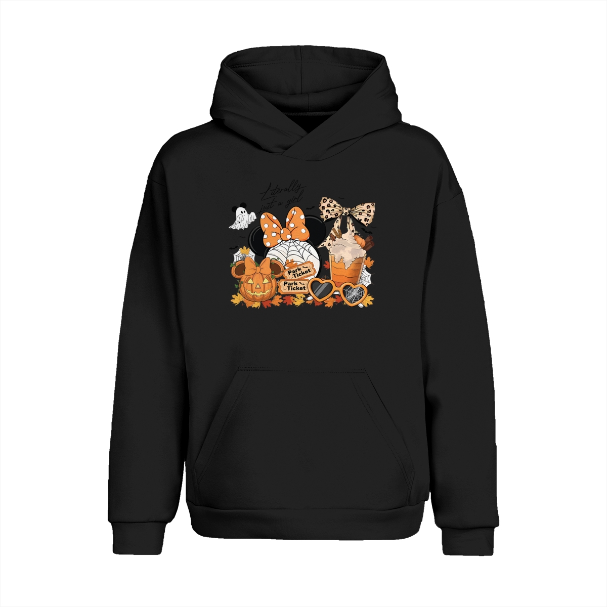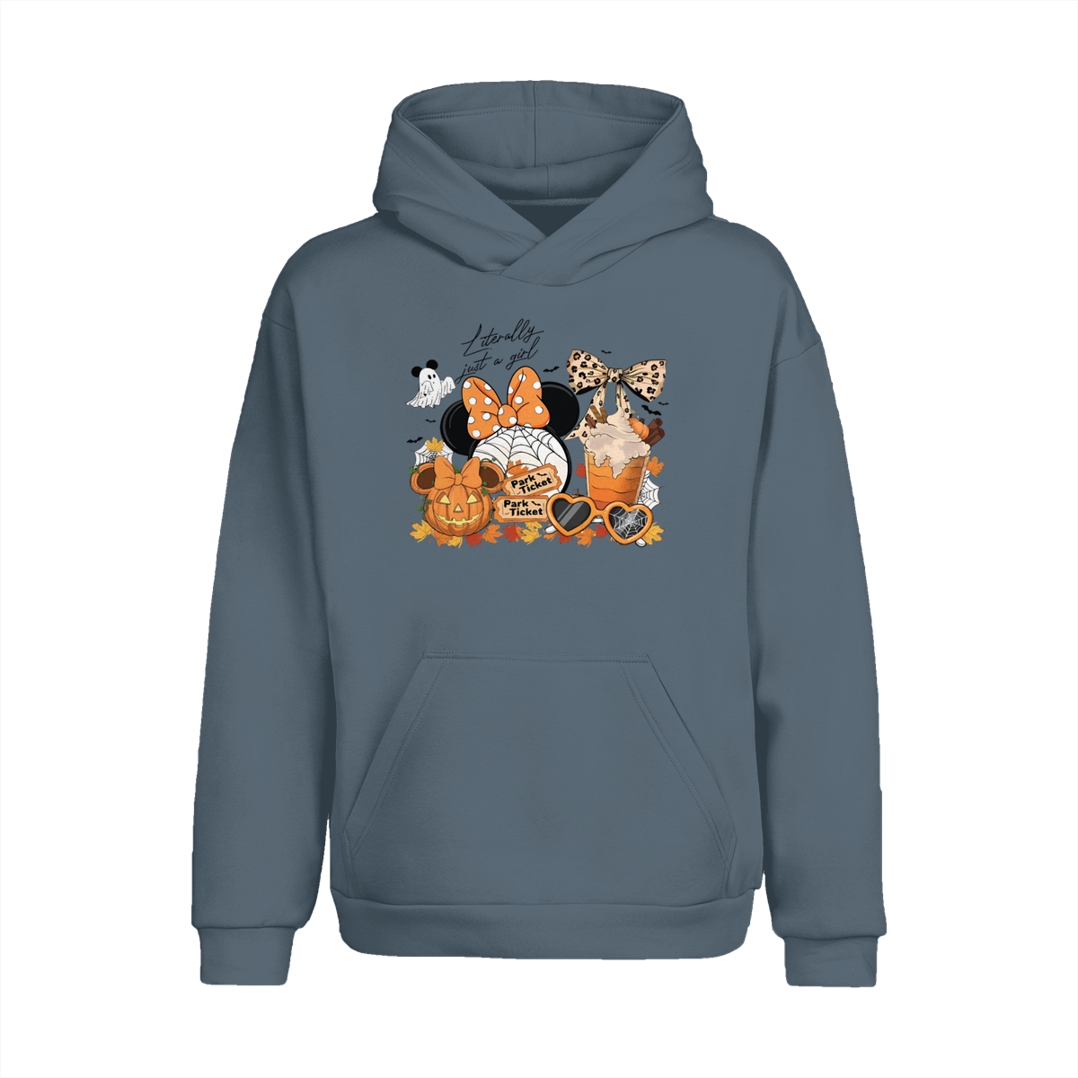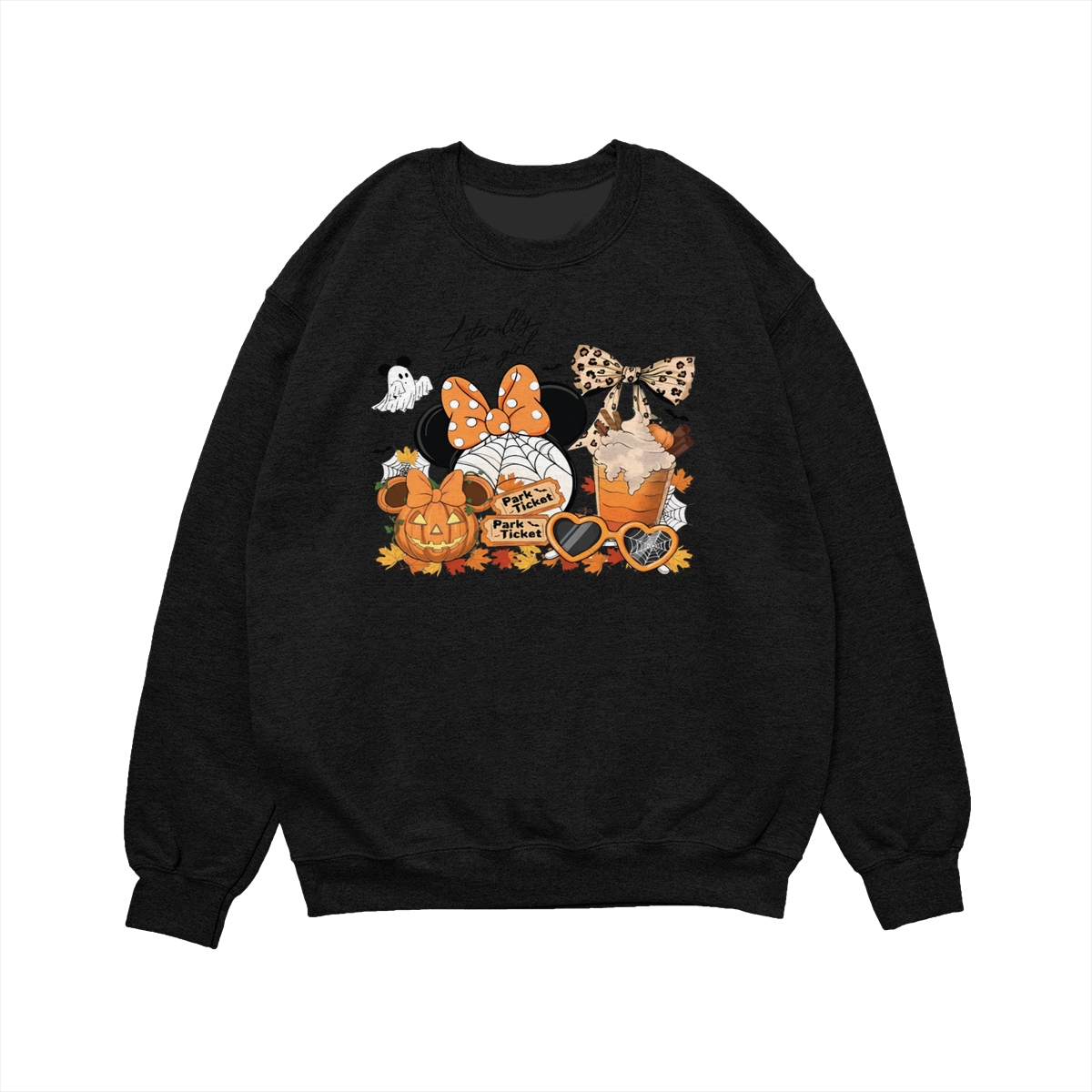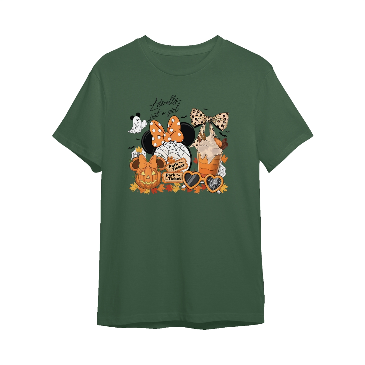 Halloween Shirt – Literally Just A Girl Graphic with Minnie Ears, Pumpkin, Bows & Fall Drink, Cute Spooky Season Pullover, Cozy Long Sleeve Crewneck – Unisex Trendy – Womenswear