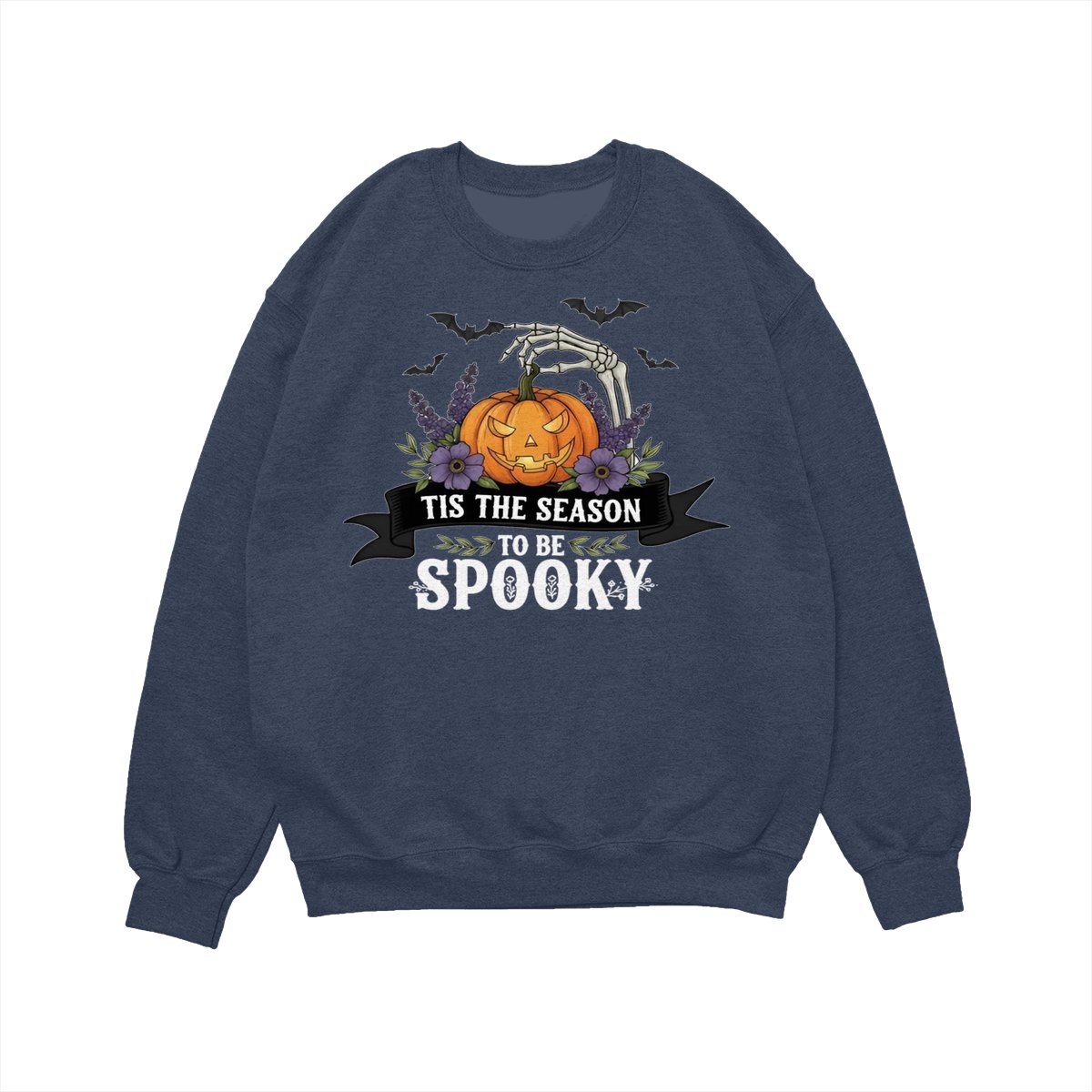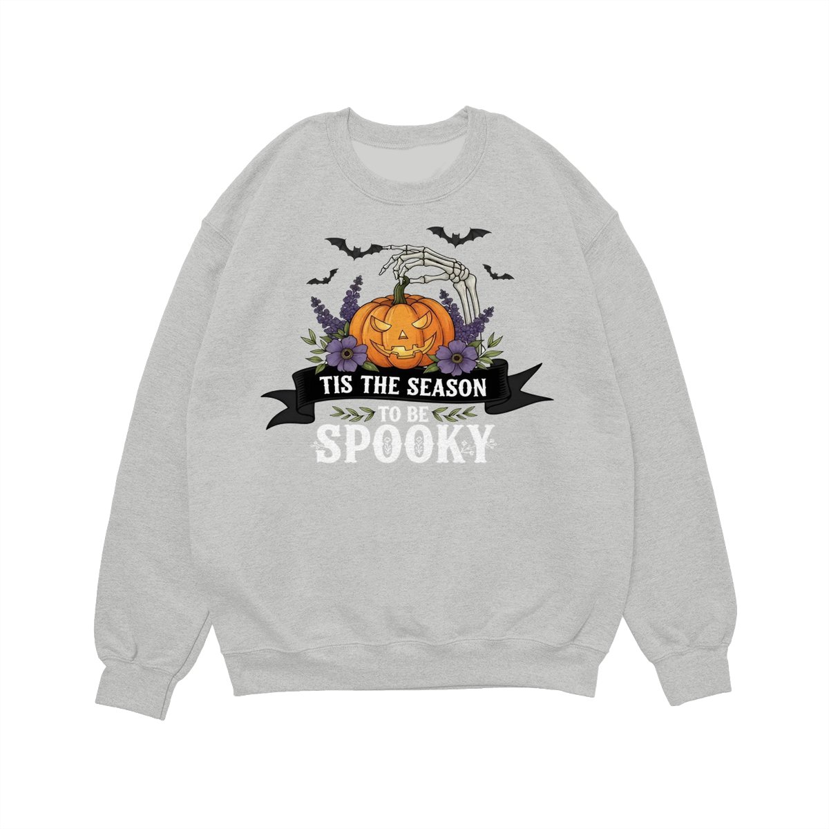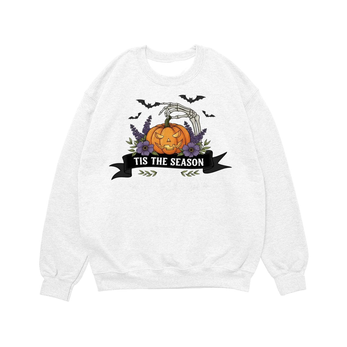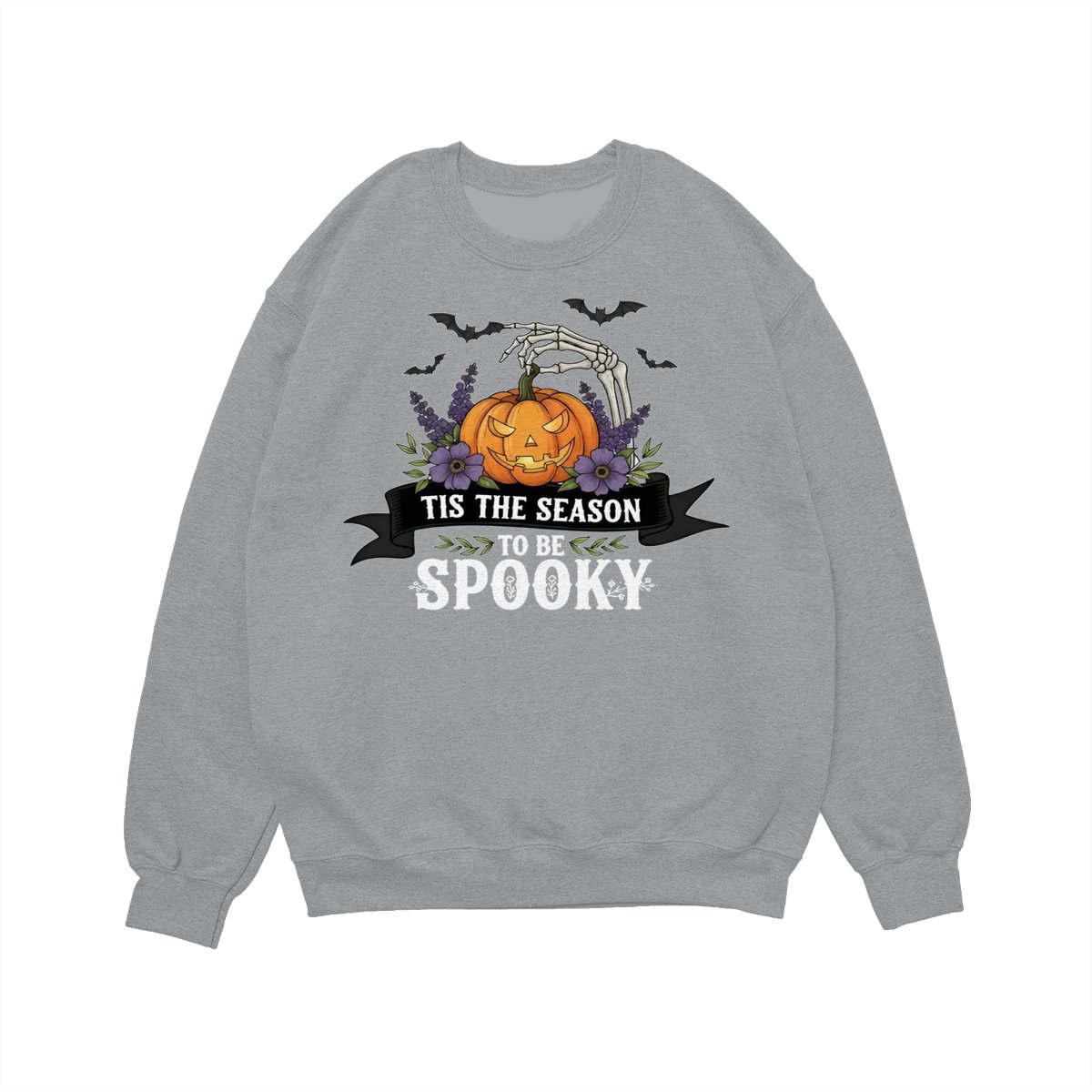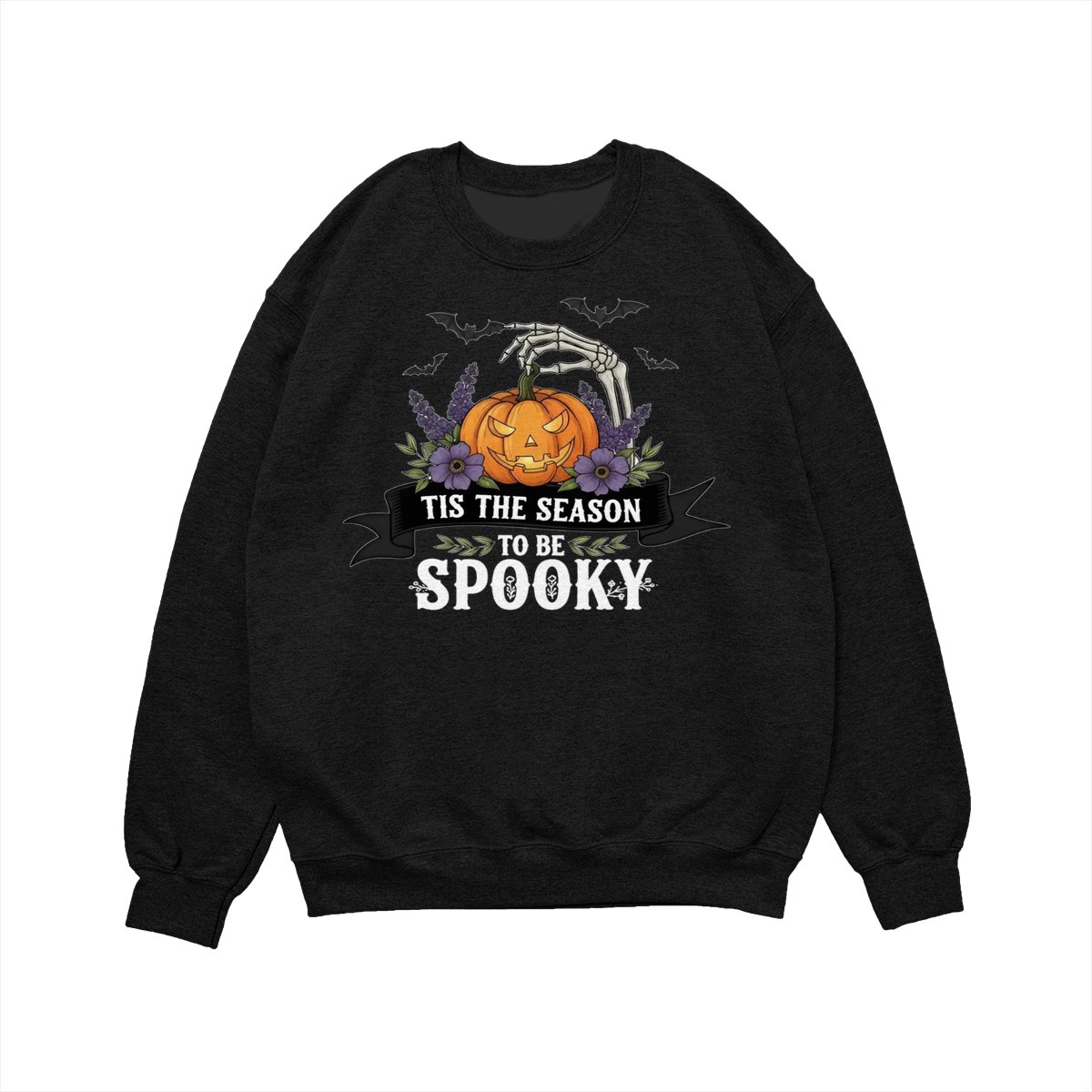 Halloween Sweatshirt For Women, Tis The Season To Be Spooky Graphic With Pumpkin Skeleton Hand And Bats, Cozy Fall Pullover, Cute Spooky Casual Outfit, Trendy Halloween Clothing Gift Idea
