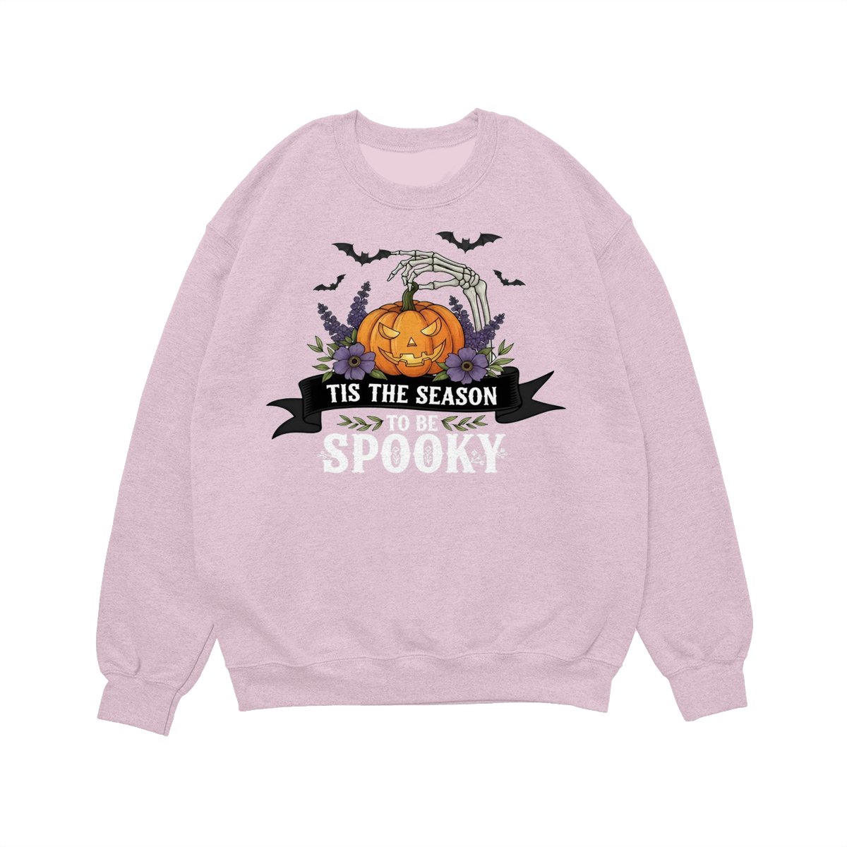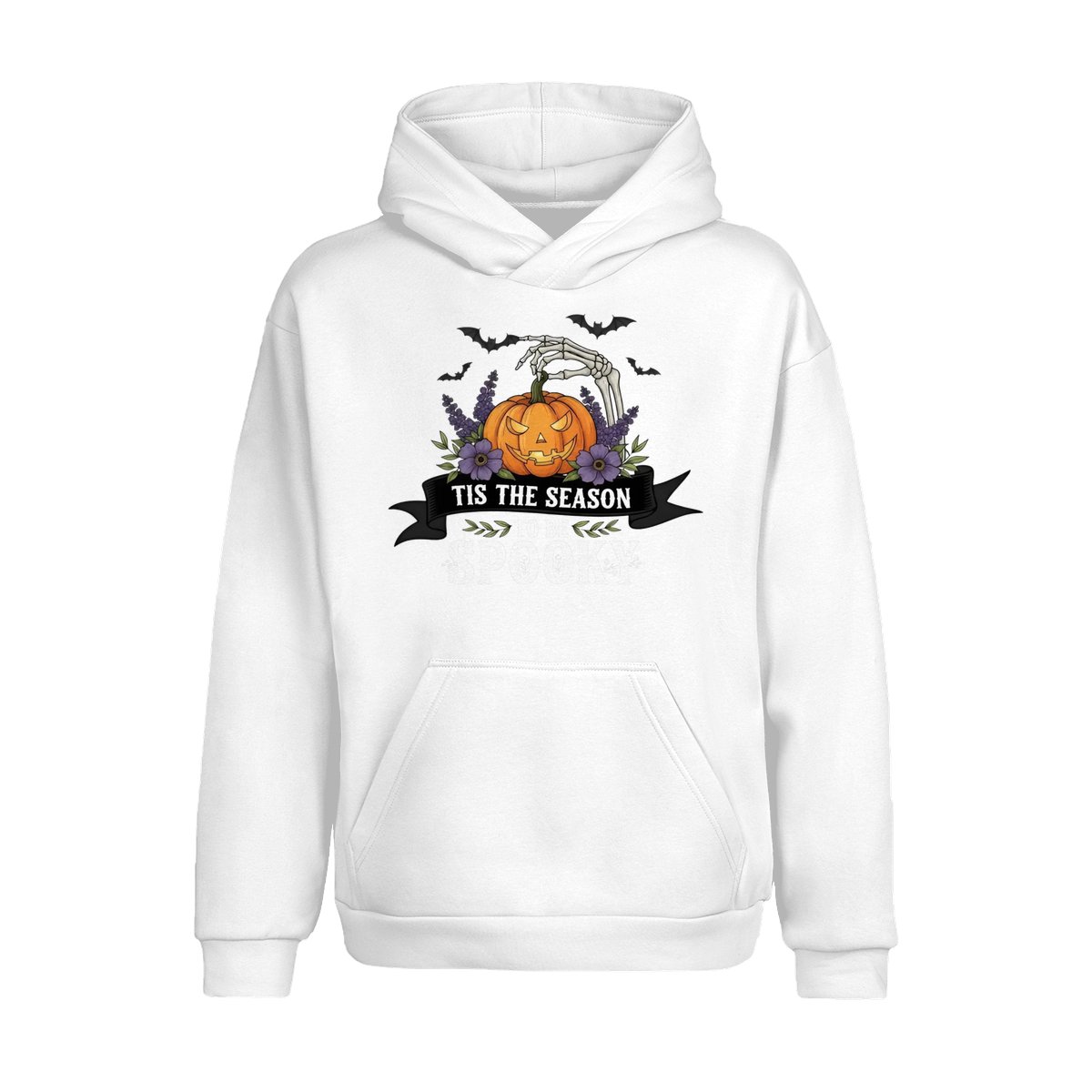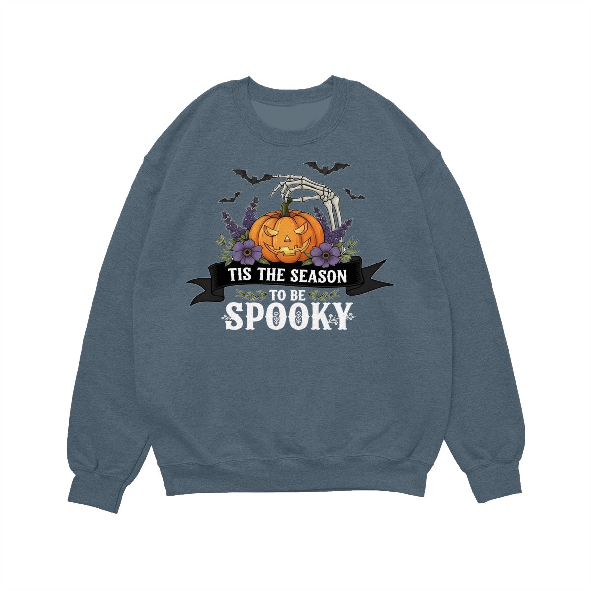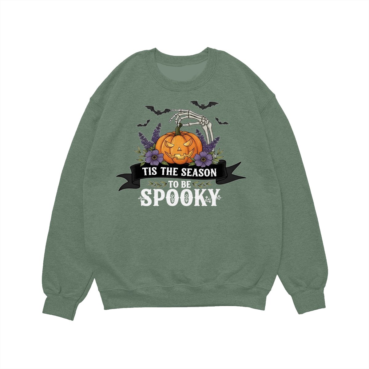 Halloween Sweatshirt For Women, Tis The Season To Be Spooky Graphic With Pumpkin Skeleton Hand And Bats, Cozy Fall Pullover, Cute Spooky Casual Outfit, Trendy Halloween Clothing Gift Idea