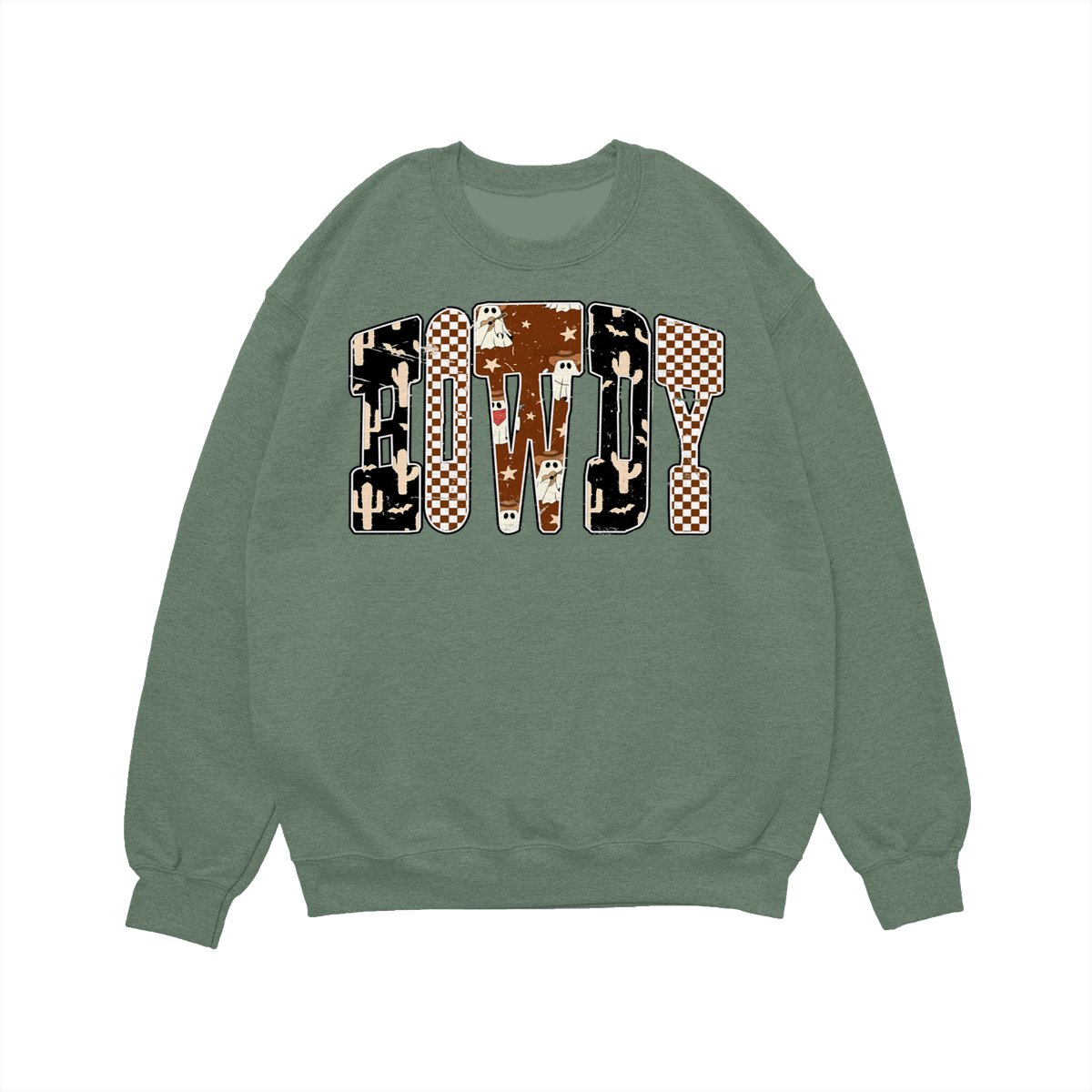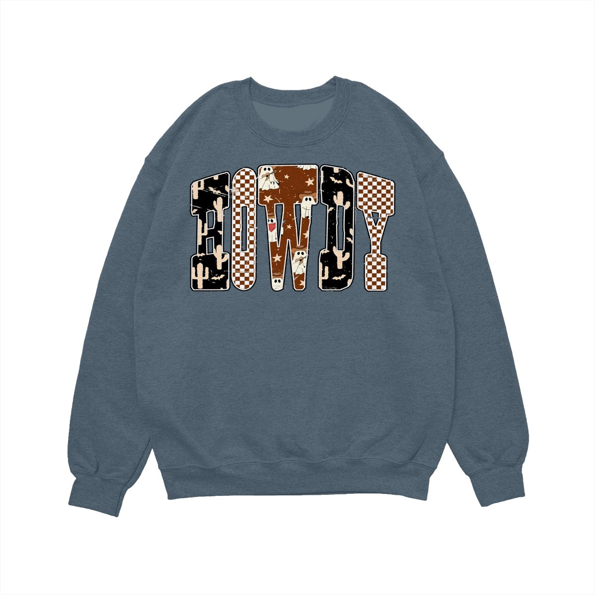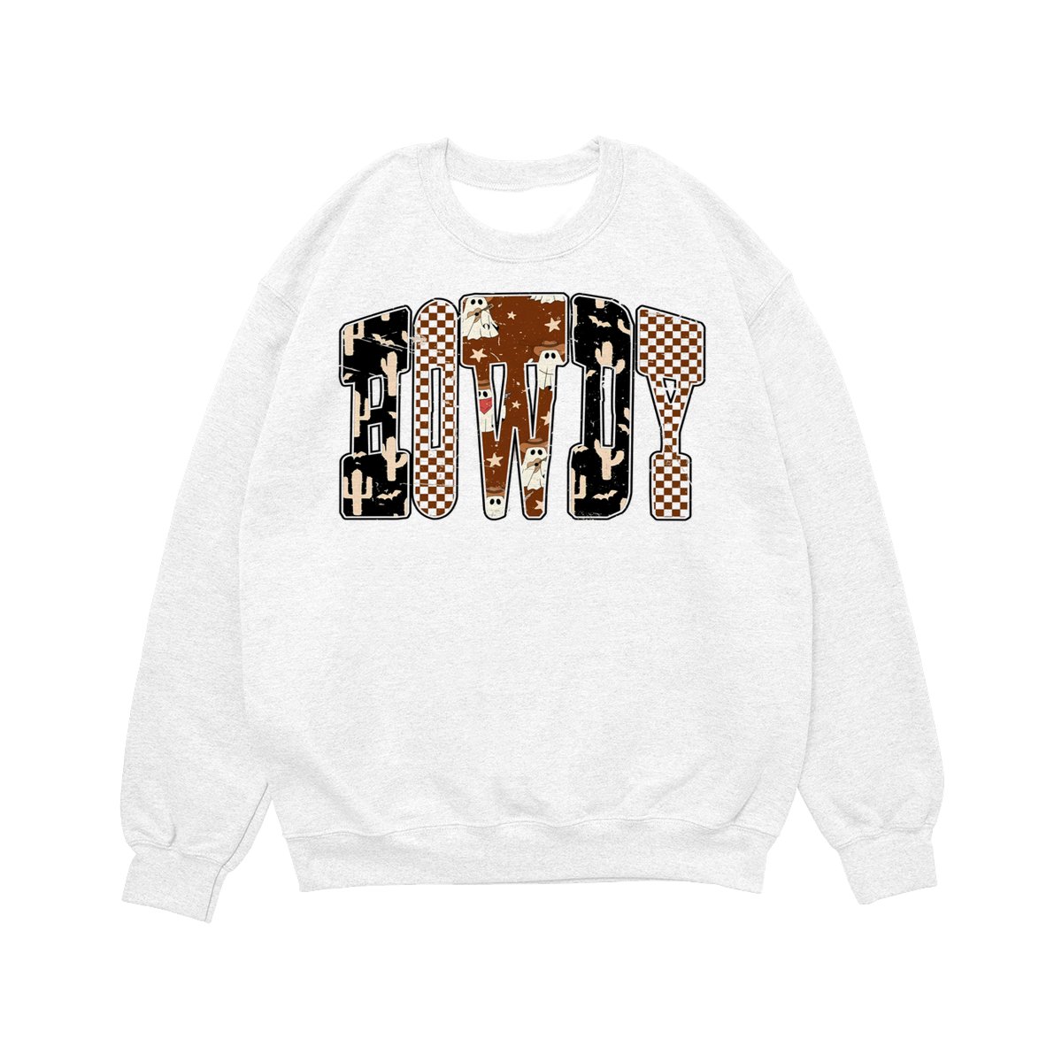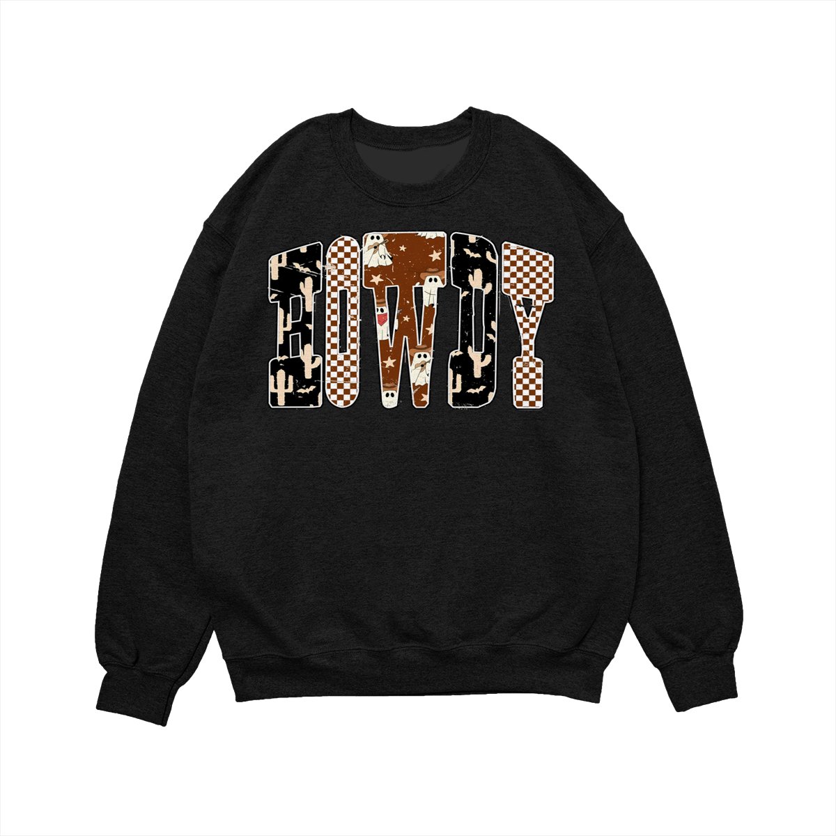 Howdy Shirt, Western Ghost Halloween Pullover, Cowboy Checkered Fall Letters, Rustic Spooky Autumn Sweater
