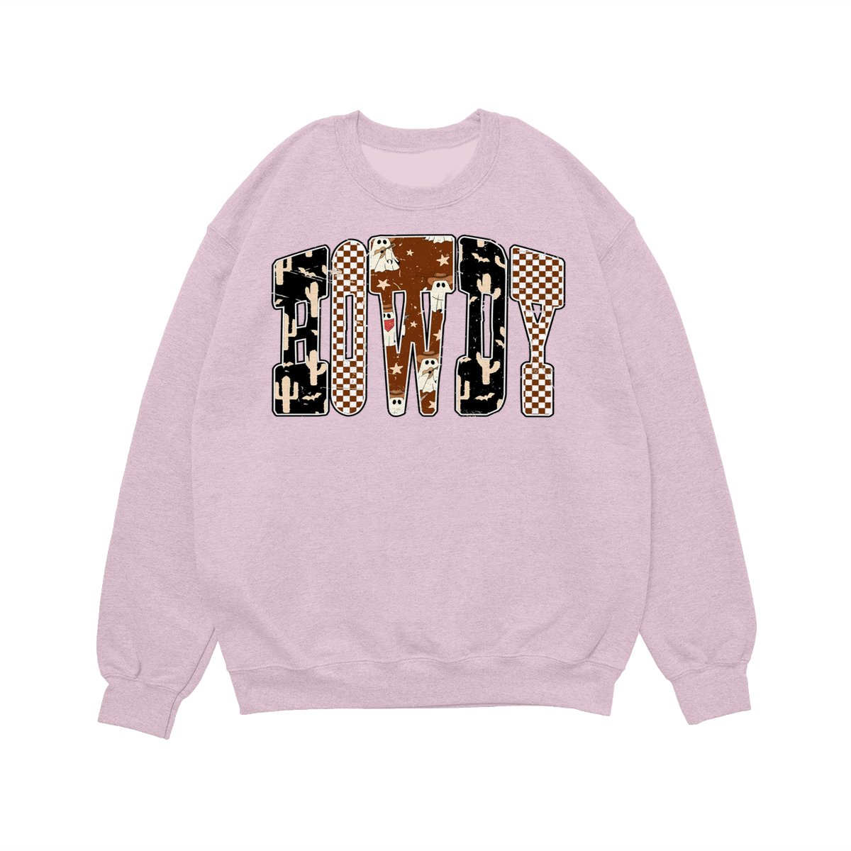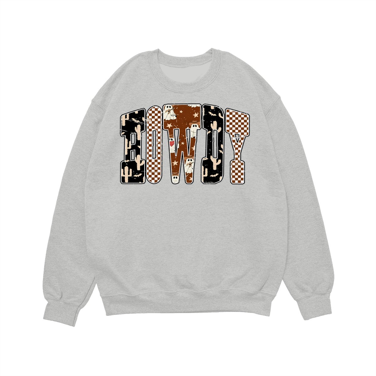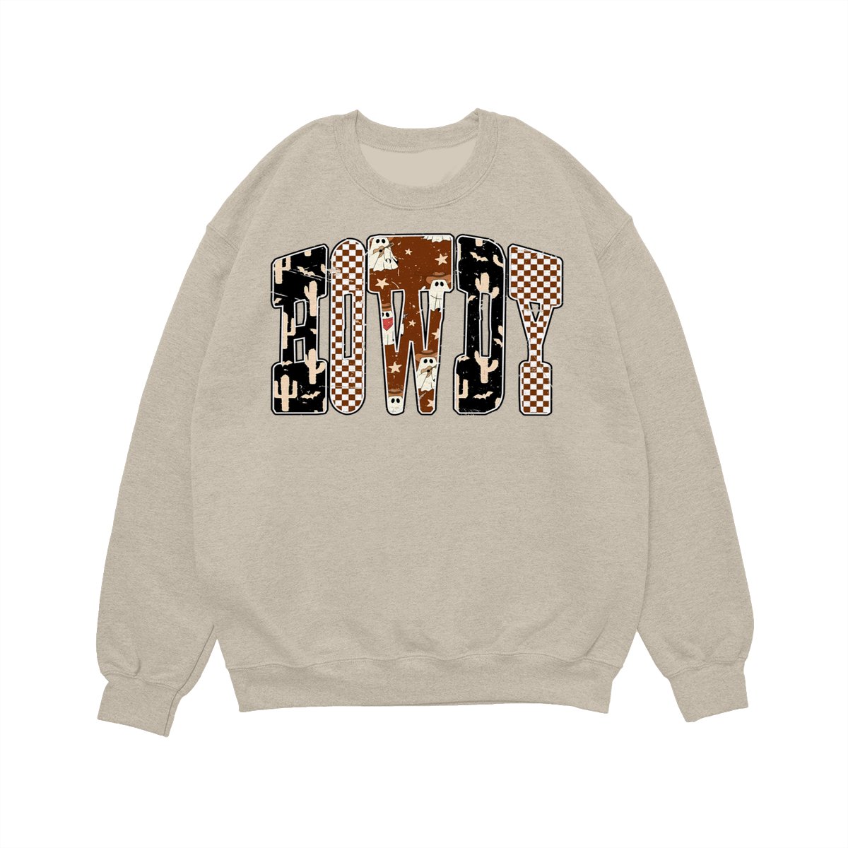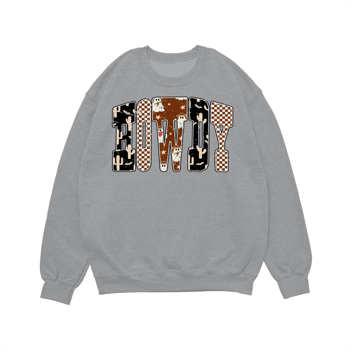 Howdy Shirt, Western Ghost Halloween Pullover, Cowboy Checkered Fall Letters, Rustic Spooky Autumn Sweater
