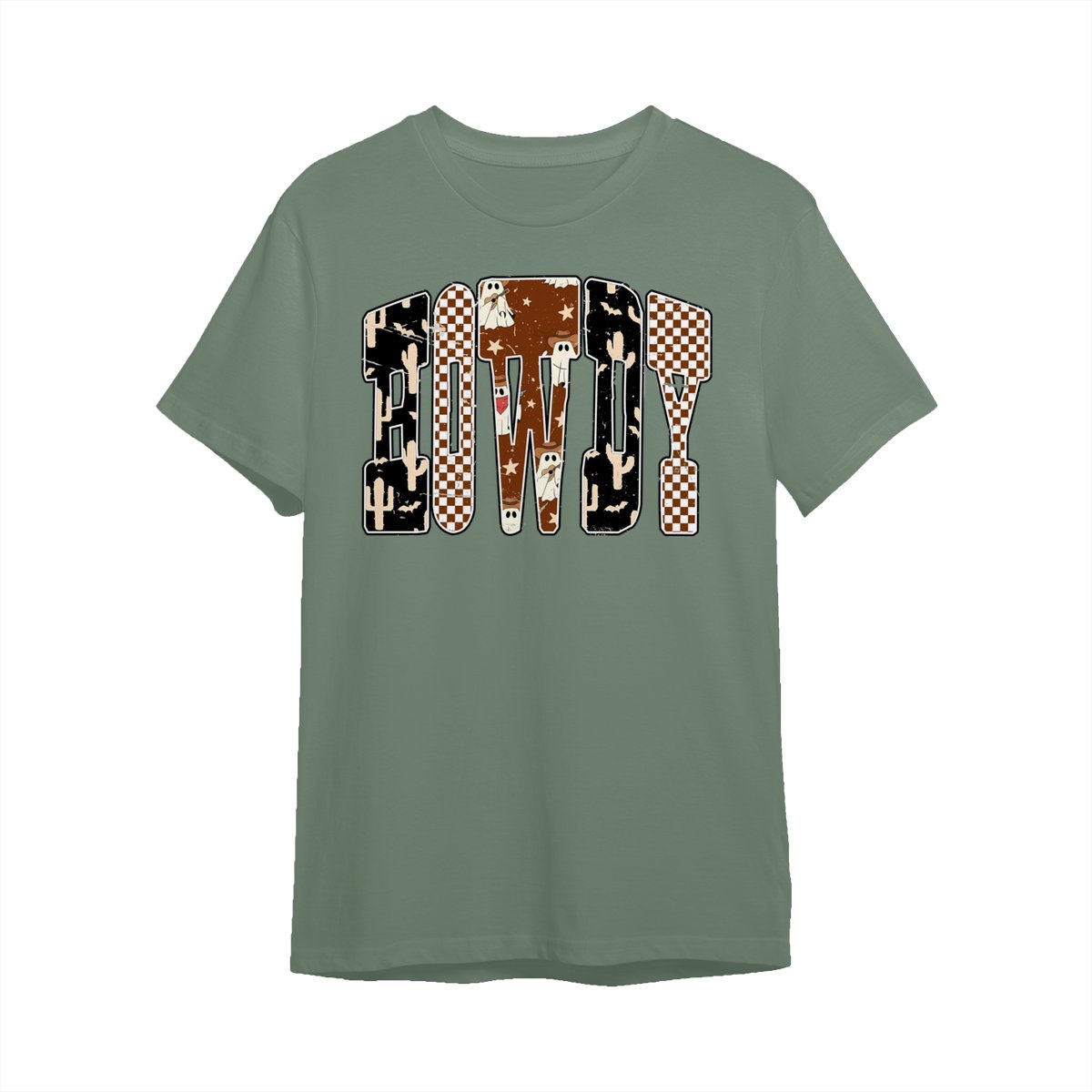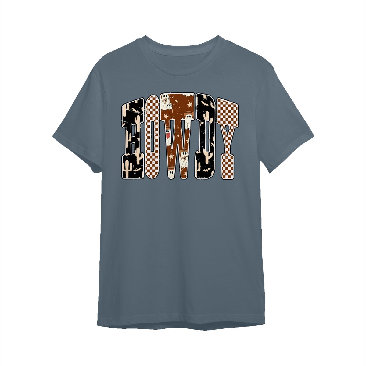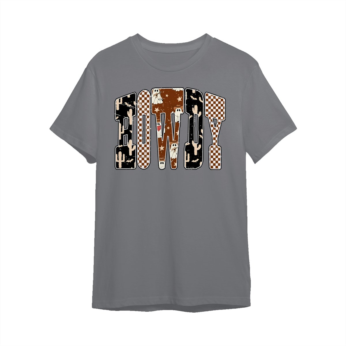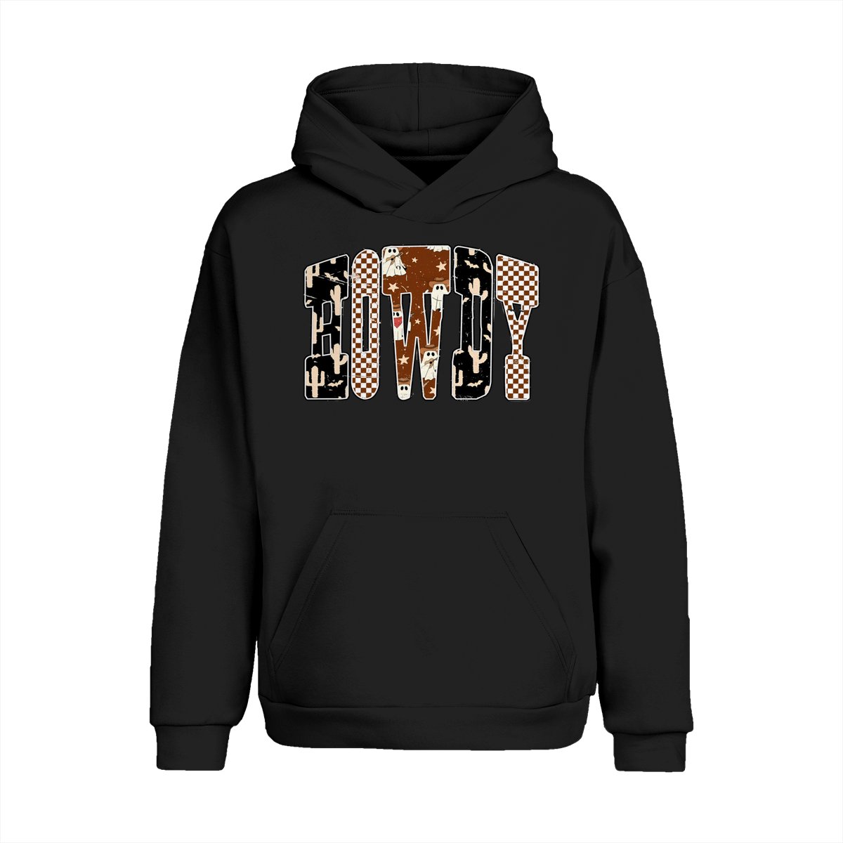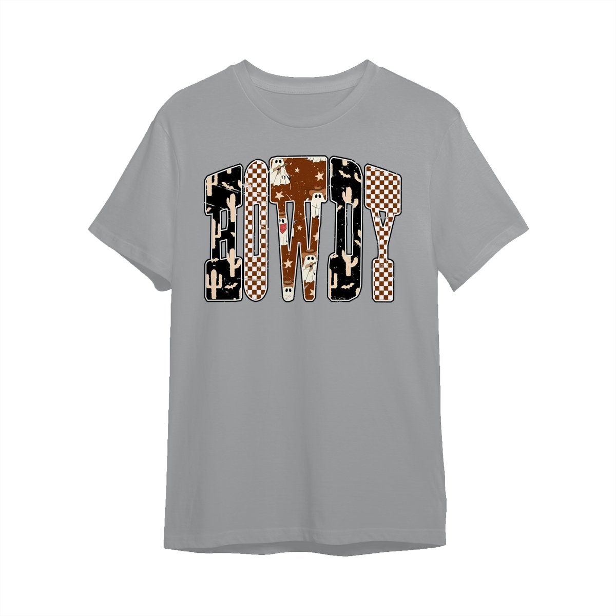 Howdy Shirt, Western Ghost Halloween Pullover, Cowboy Checkered Fall Letters, Rustic Spooky Autumn Sweater