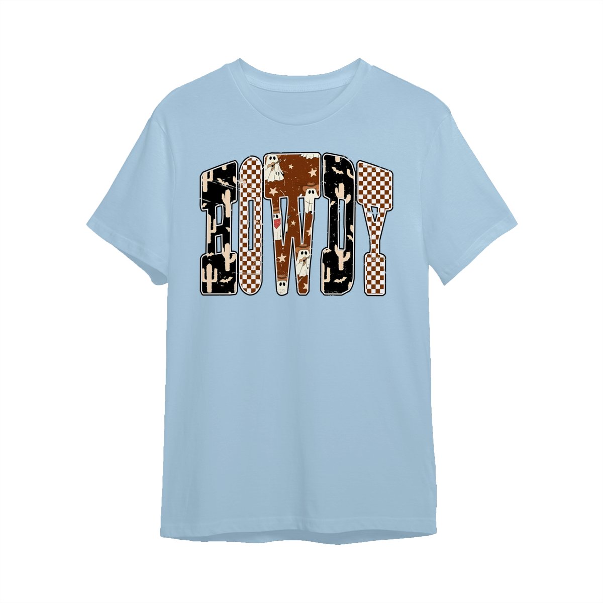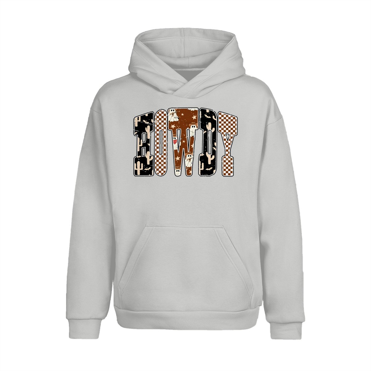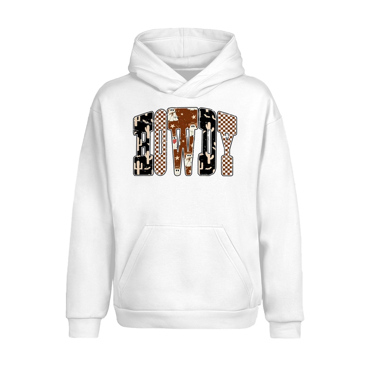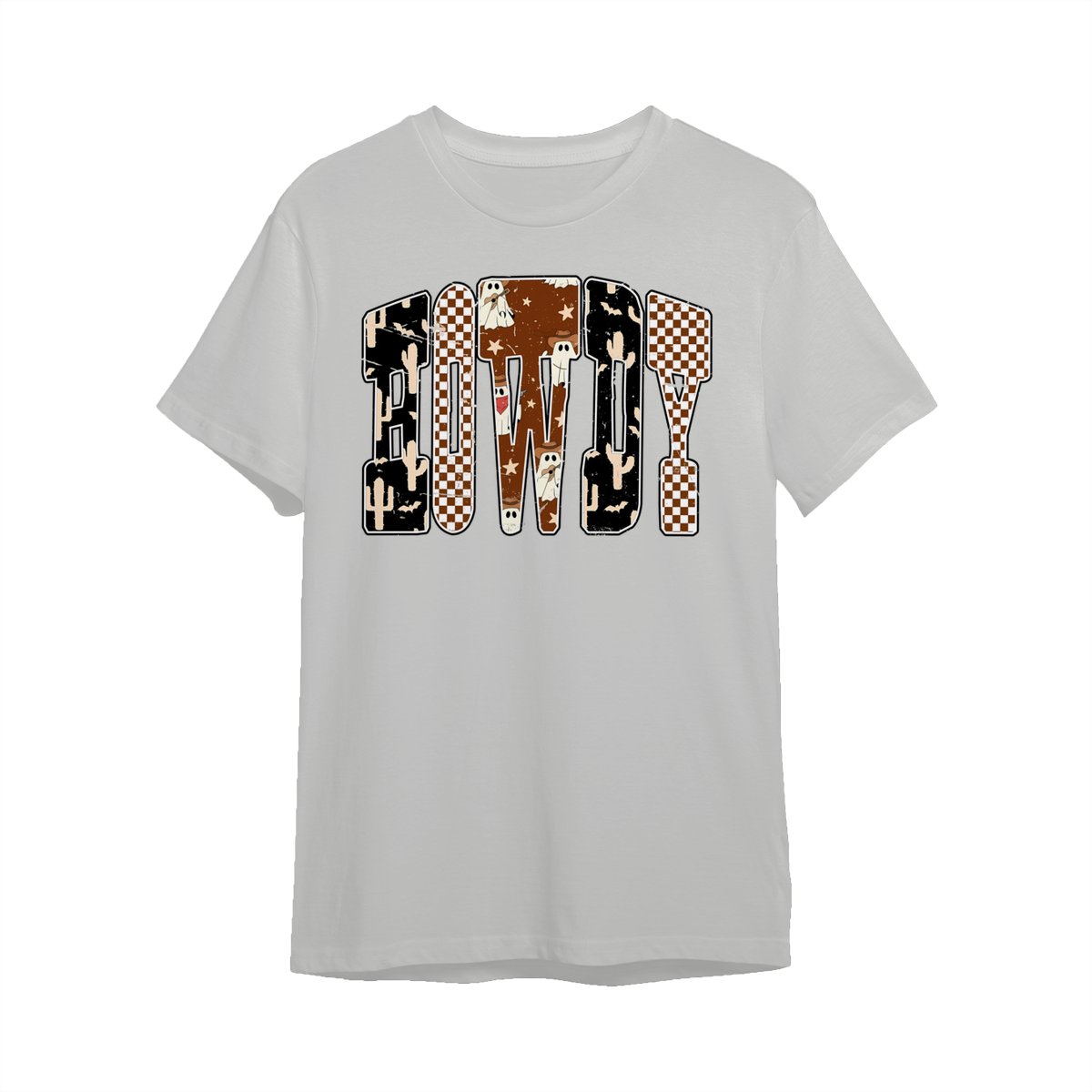 Howdy Shirt, Western Ghost Halloween Pullover, Cowboy Checkered Fall Letters, Rustic Spooky Autumn Sweater
