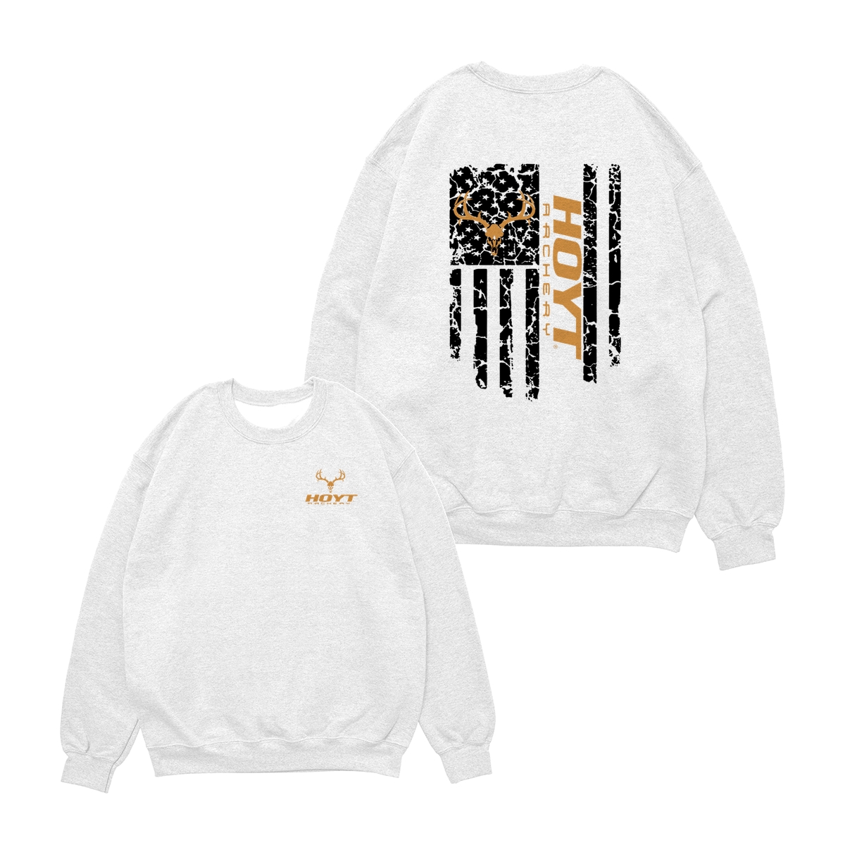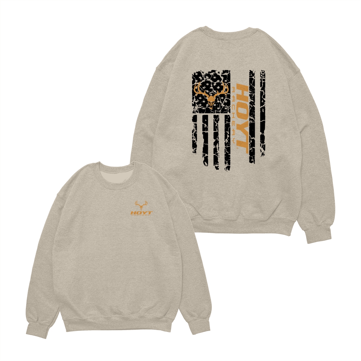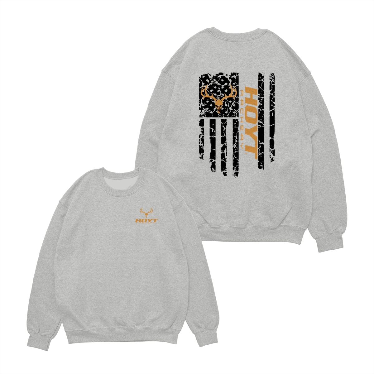 Hoyt Archery Flag Hoodie Shirt Sweater – American Hunting Style, Skull Antler Graphic, Unisex Outdoor Outfit, Bowhunter Gear, Patriotic Huntwear for Fall Season