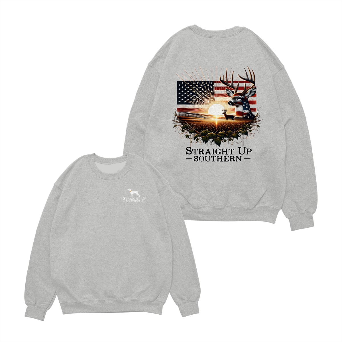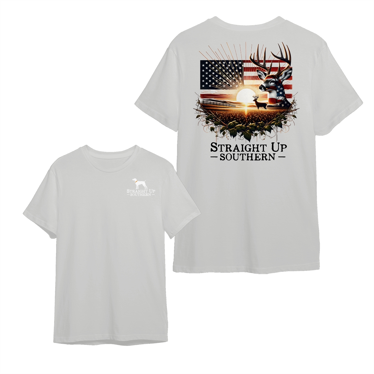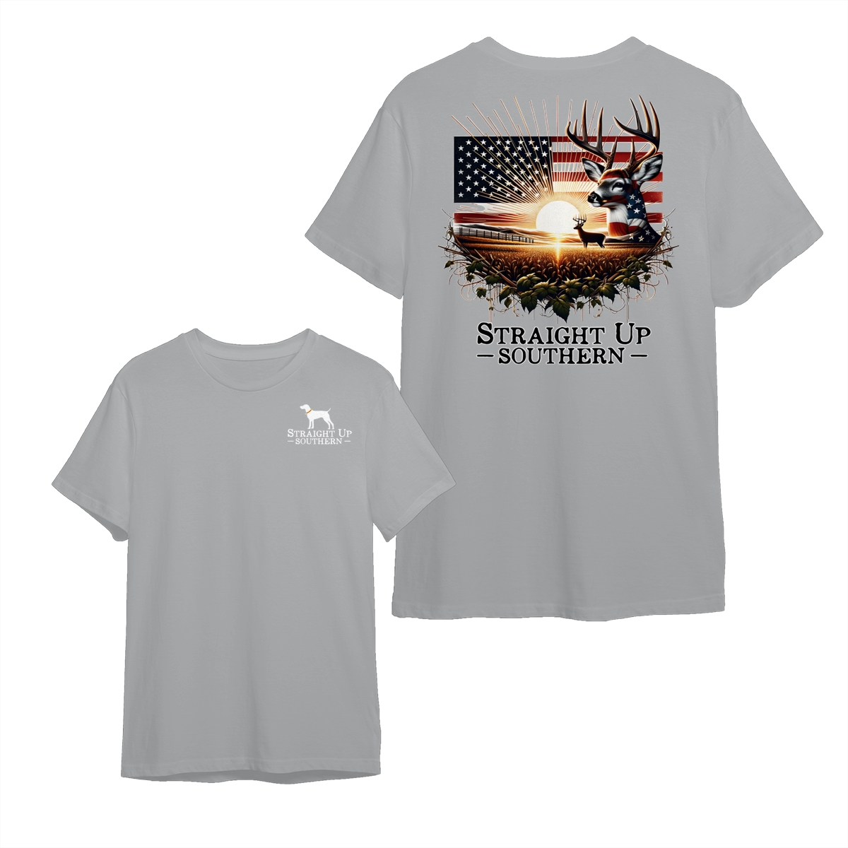 Hunting T-Shirt – American Farm & Whitetail Deer Graphic Tee, Country Sunrise Wildlife Shirt, Streetwear Mens Tops, Gift for Outdoorsman Menswear