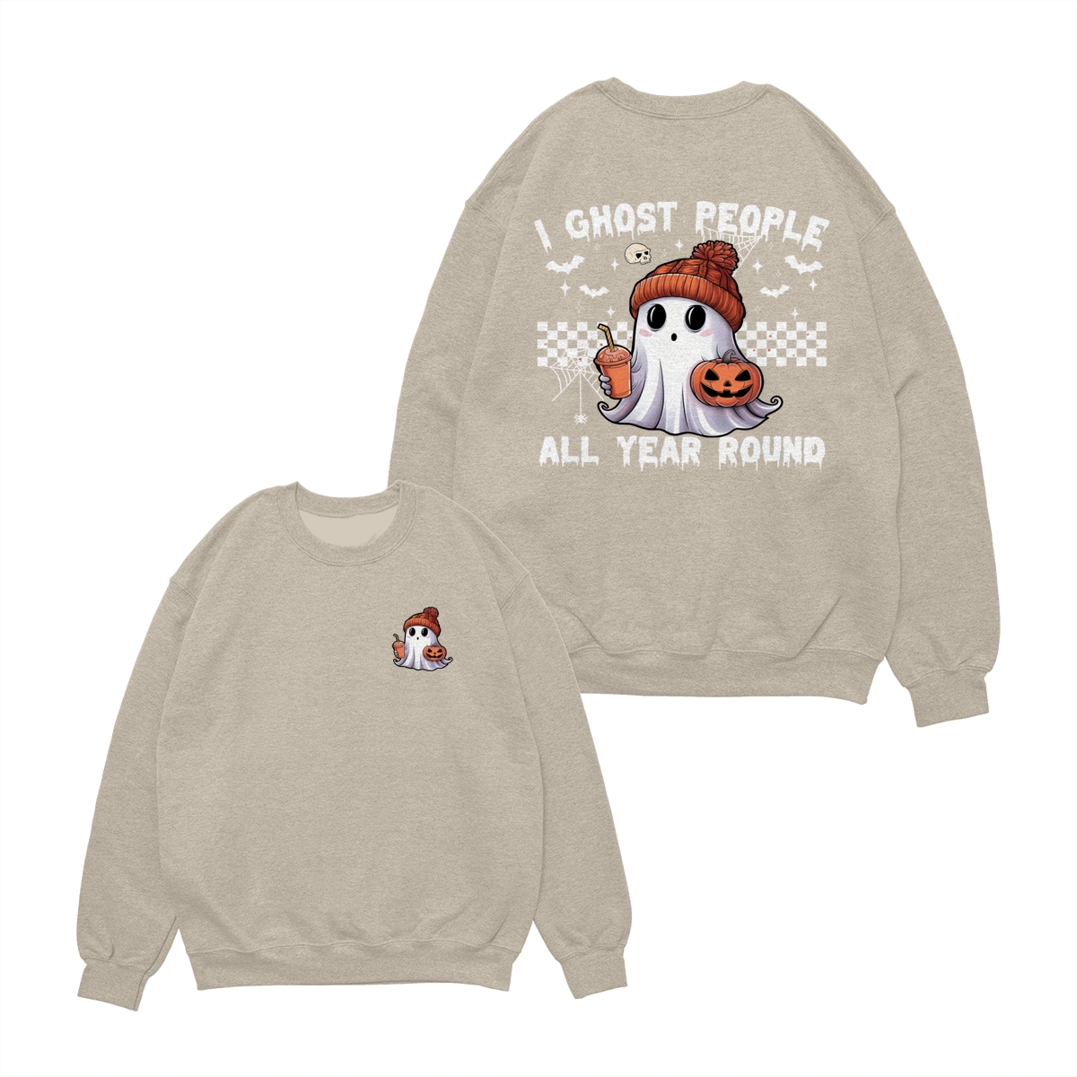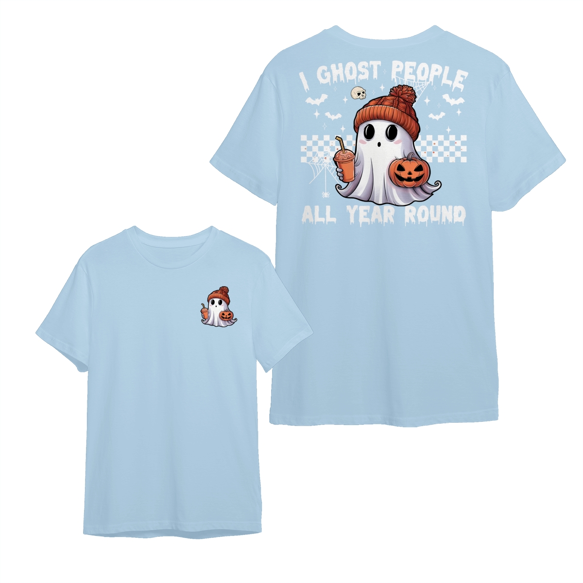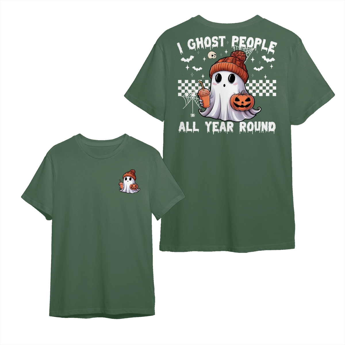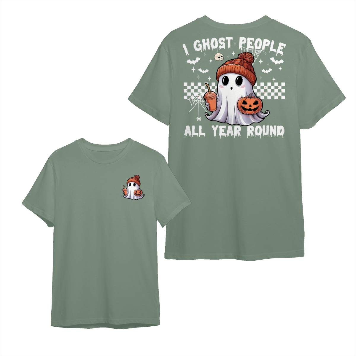 I Ghost People All Year T-Shirt – Halloween-Inspired Graphic Tee with Cute Ghost, Pumpkin & Drink, Everyday Spooky Style, Soft Unisex Shirt, USA-Made & Printed Apparel