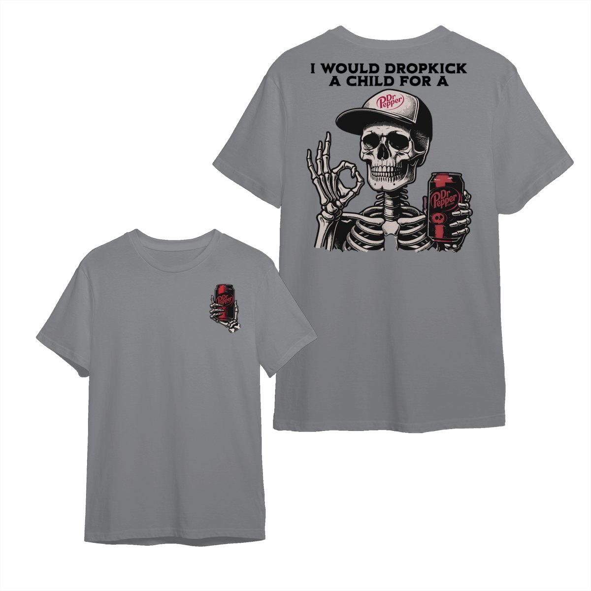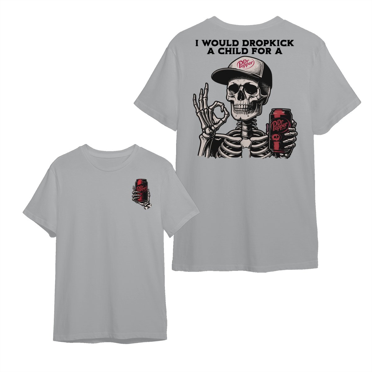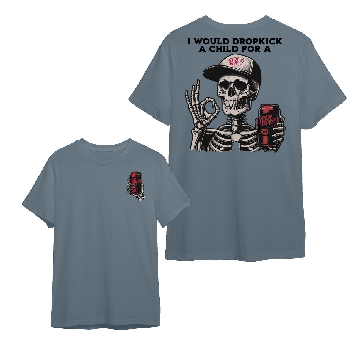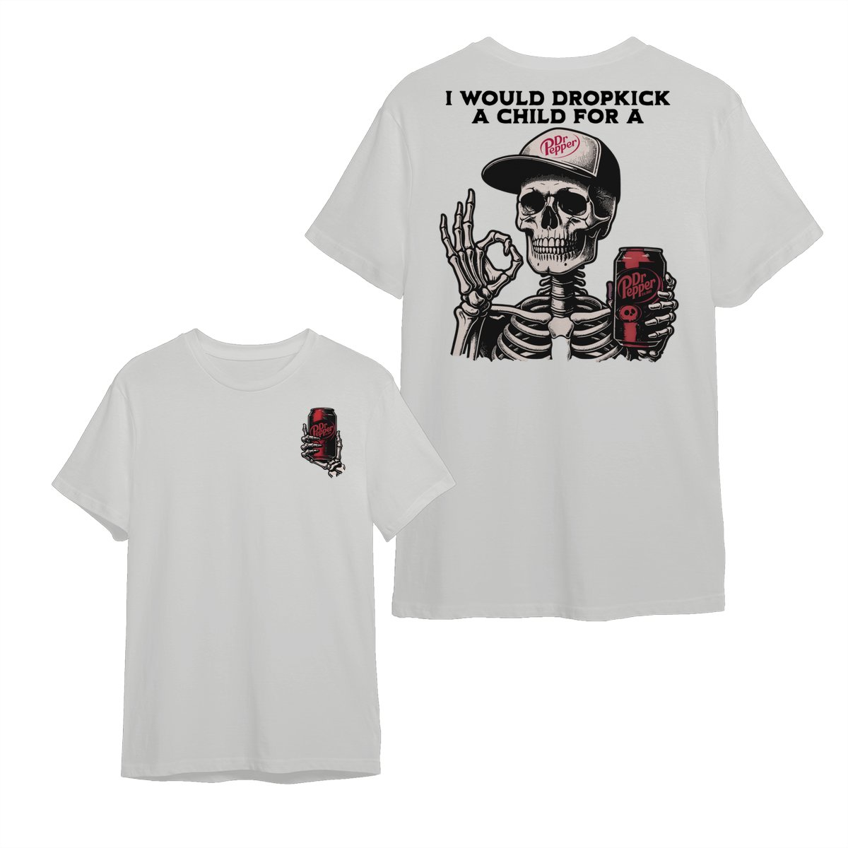 I Would Dropkick a Child for a Soda Tee, Skeleton Holding Dr Pepper Can T-Shirt, Edgy Meme Shirt for Soda Lovers, Unisex Humor Top