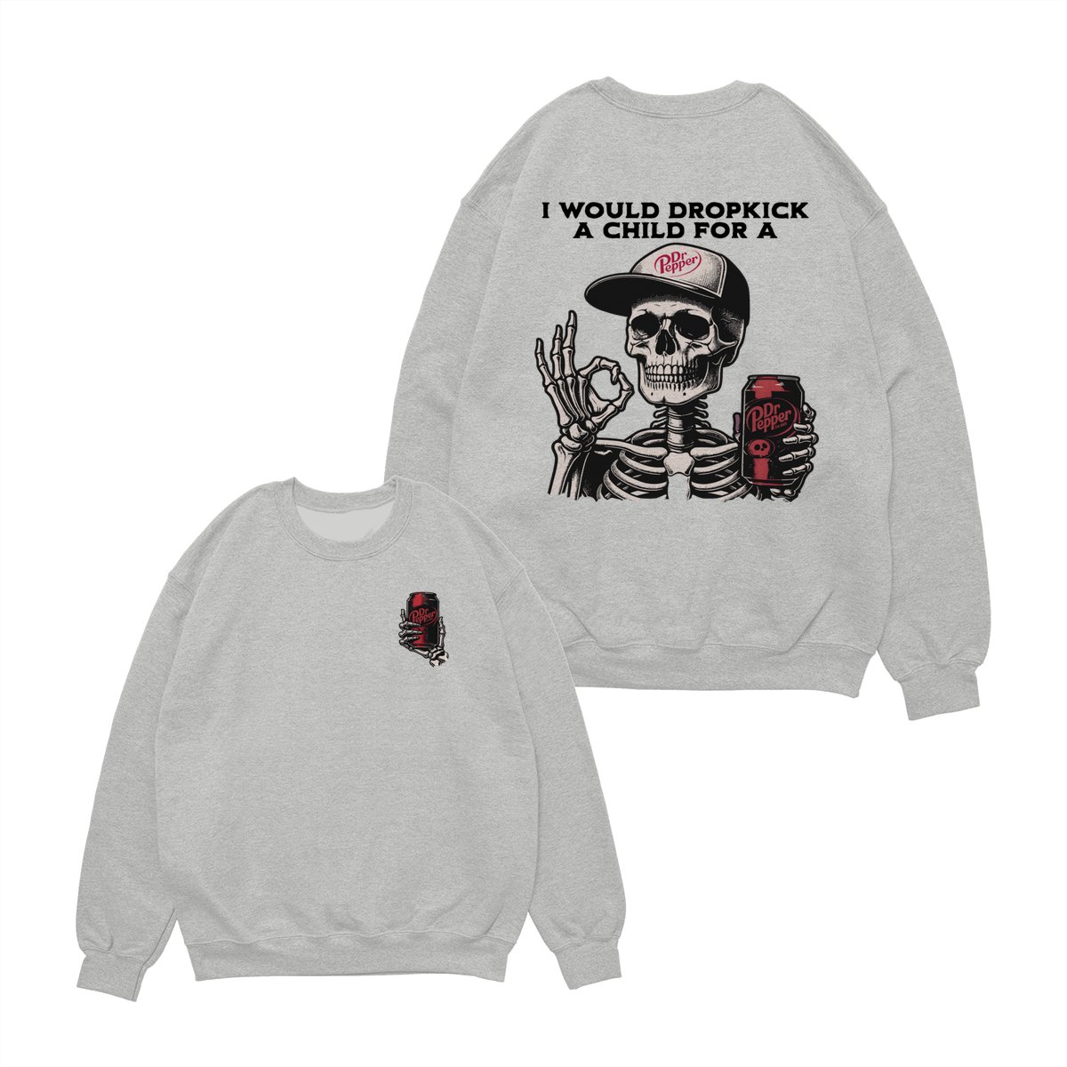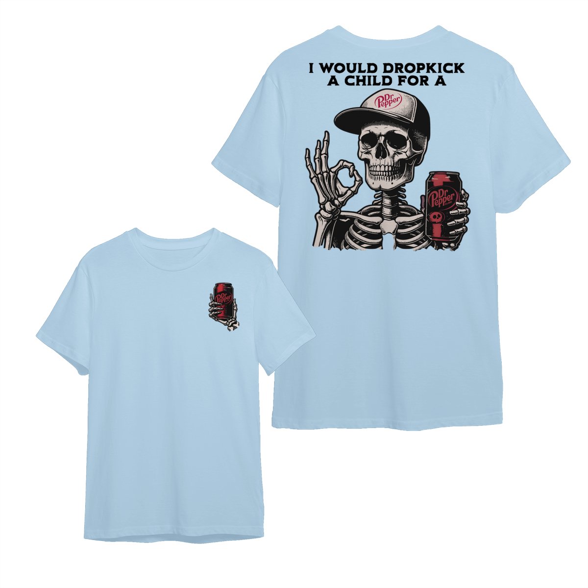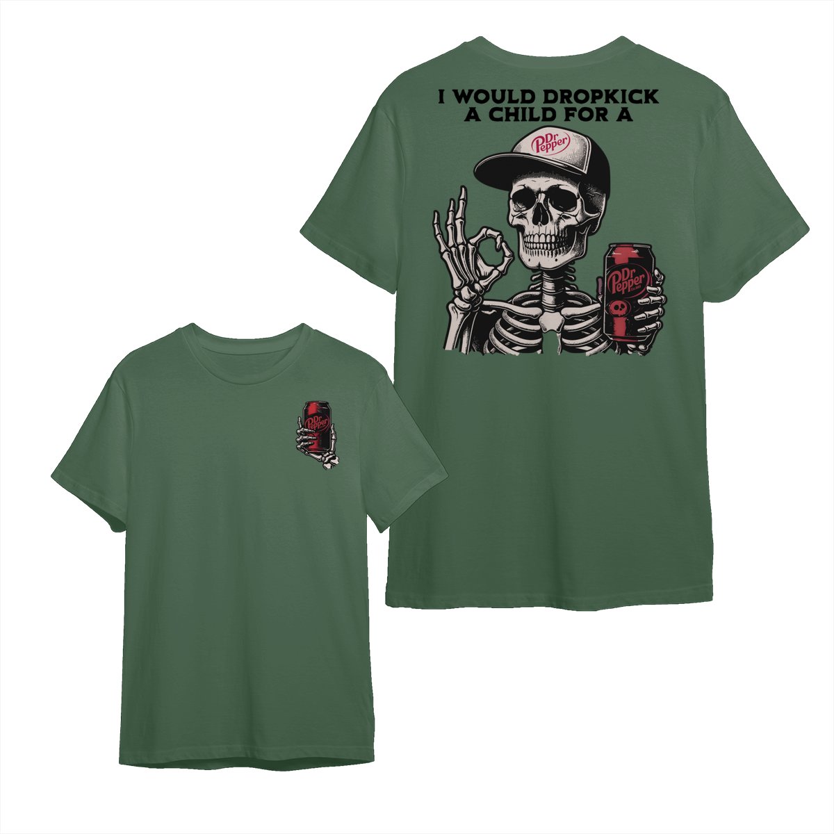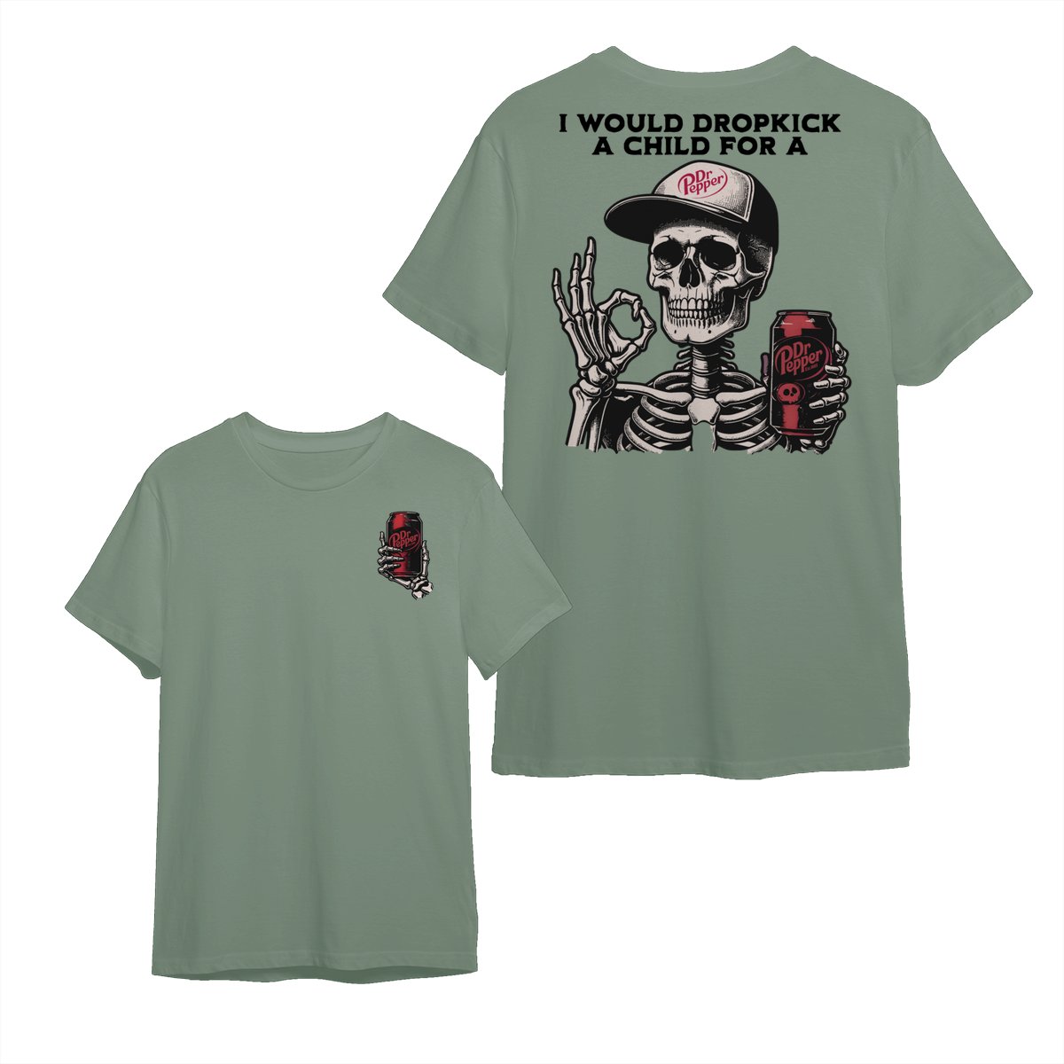 I Would Dropkick a Child for a Soda Tee, Skeleton Holding Dr Pepper Can T-Shirt, Edgy Meme Shirt for Soda Lovers, Unisex Humor Top