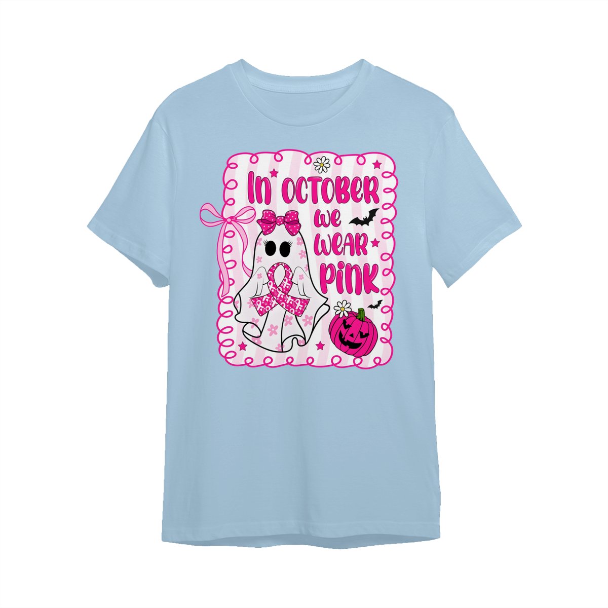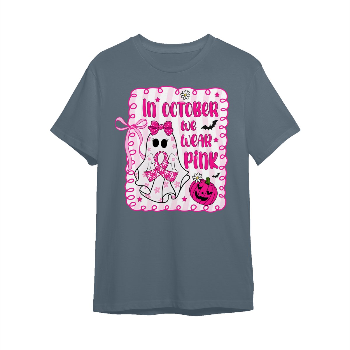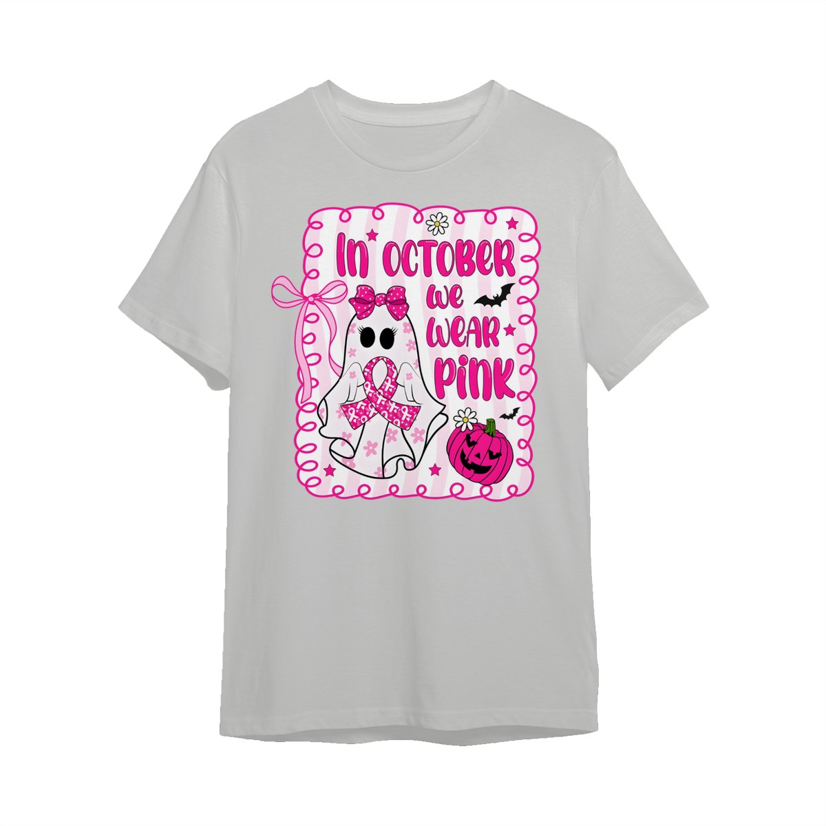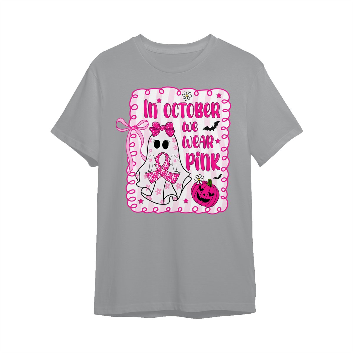 In October We Wear Pink Coquette Breast Cancer Cute Boo Tee, Halloween Pink Ghost Shirt, Breast Cancer Awareness Gifts, Gifts for Survivor